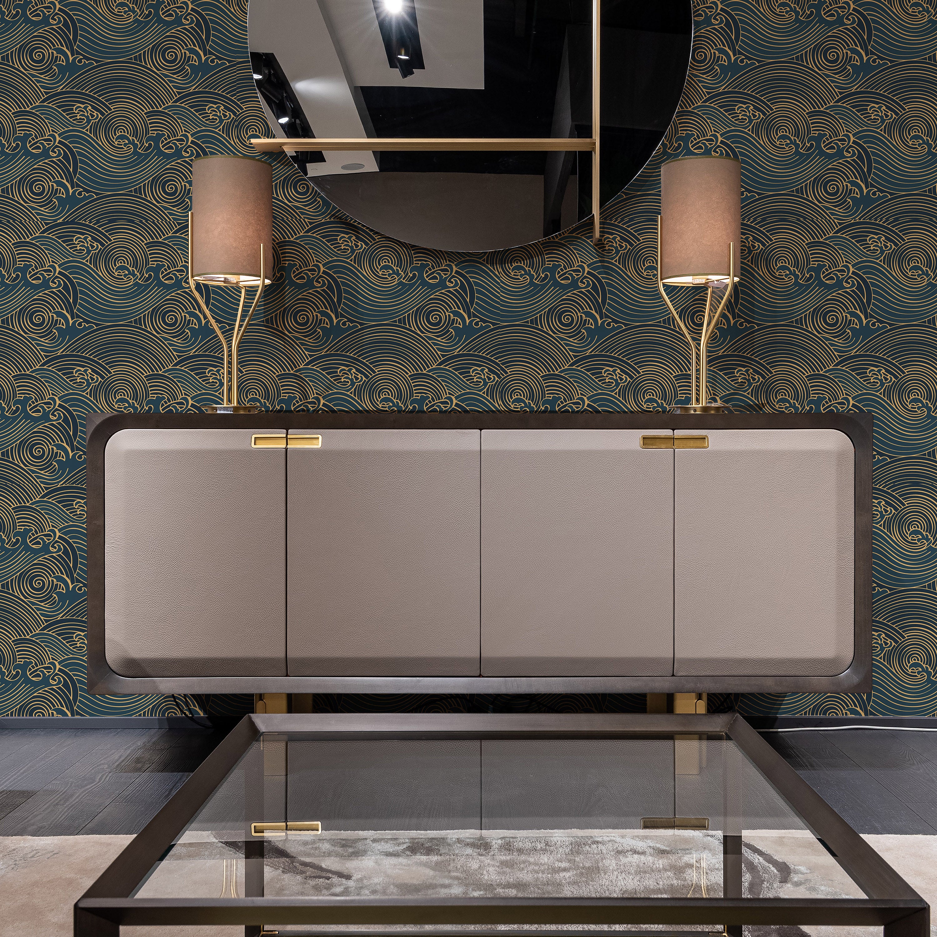This premium wallpaper showcases an artfully rendered wave pattern in gleaming gold against a deep indigo canvas. The design delivers sophisticated visual depth while maintaining architectural restraint, making it an excellent choice for contemporary and traditional interiors alike.