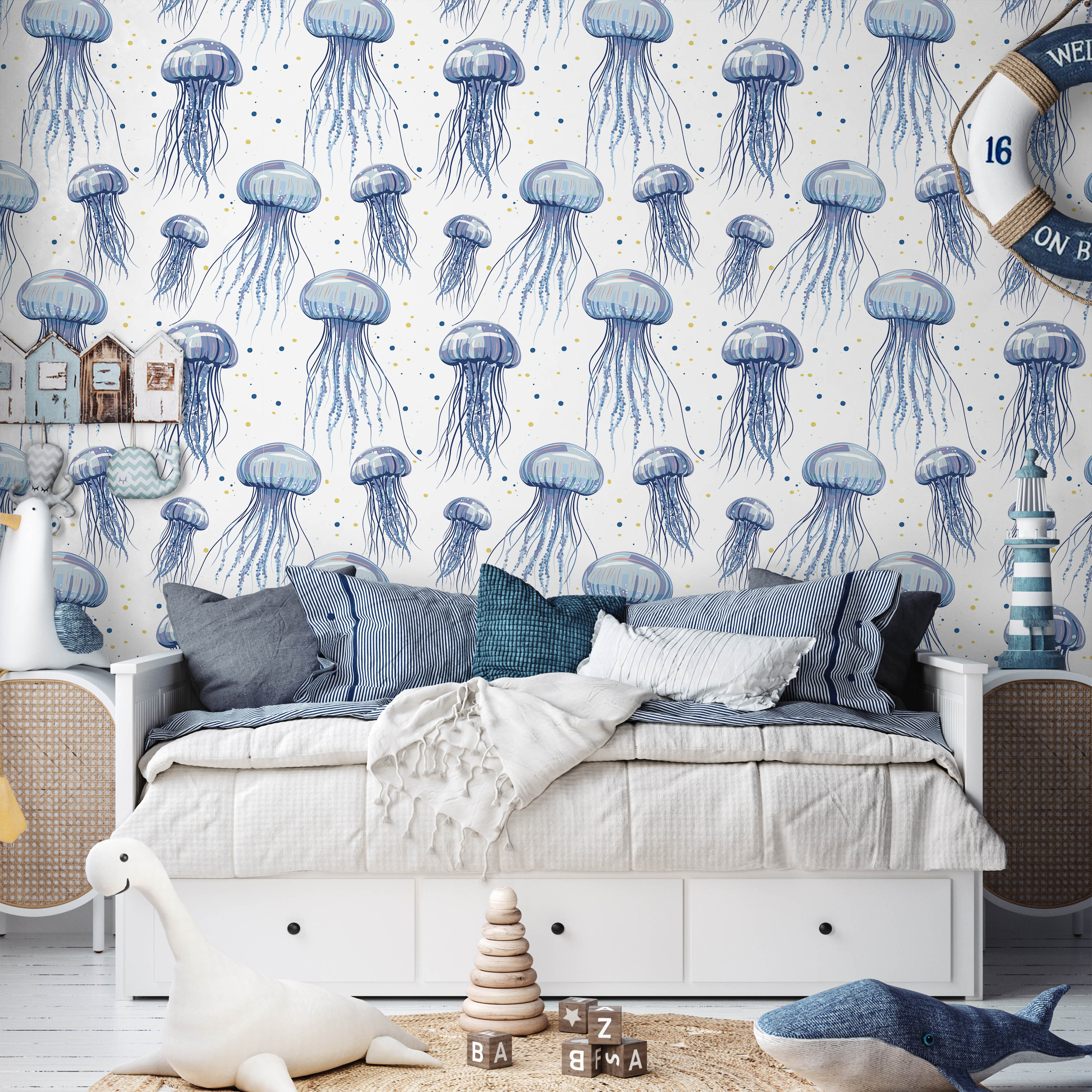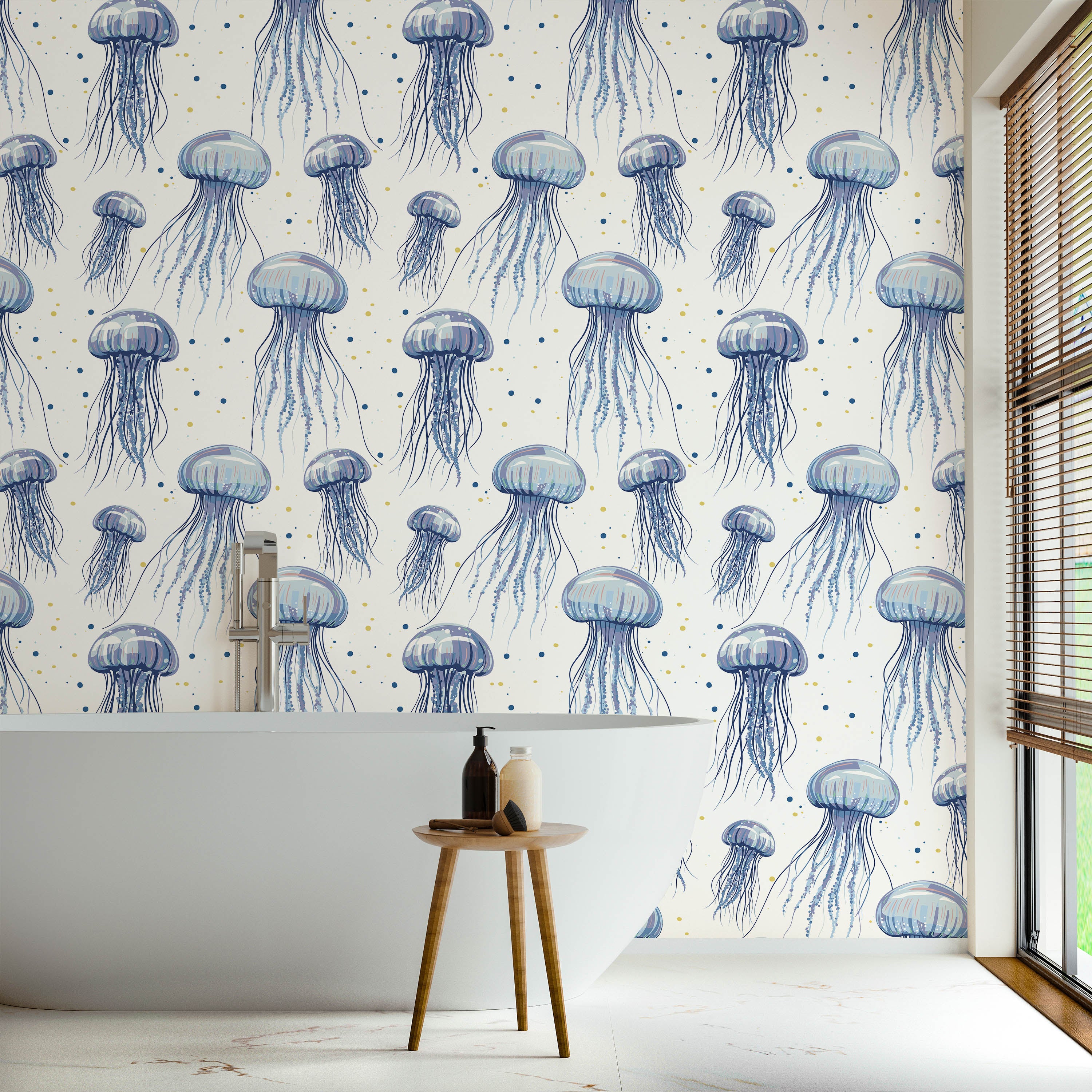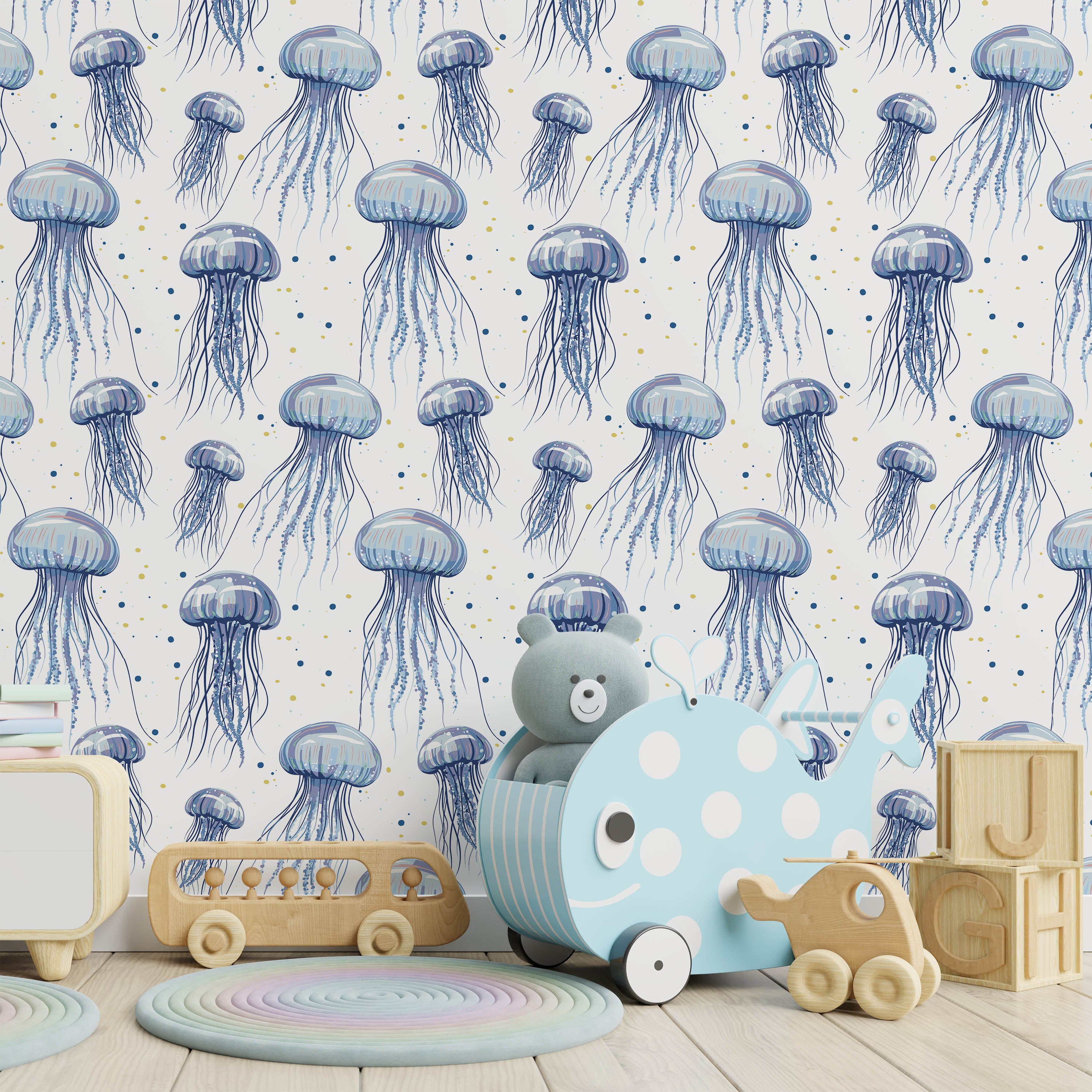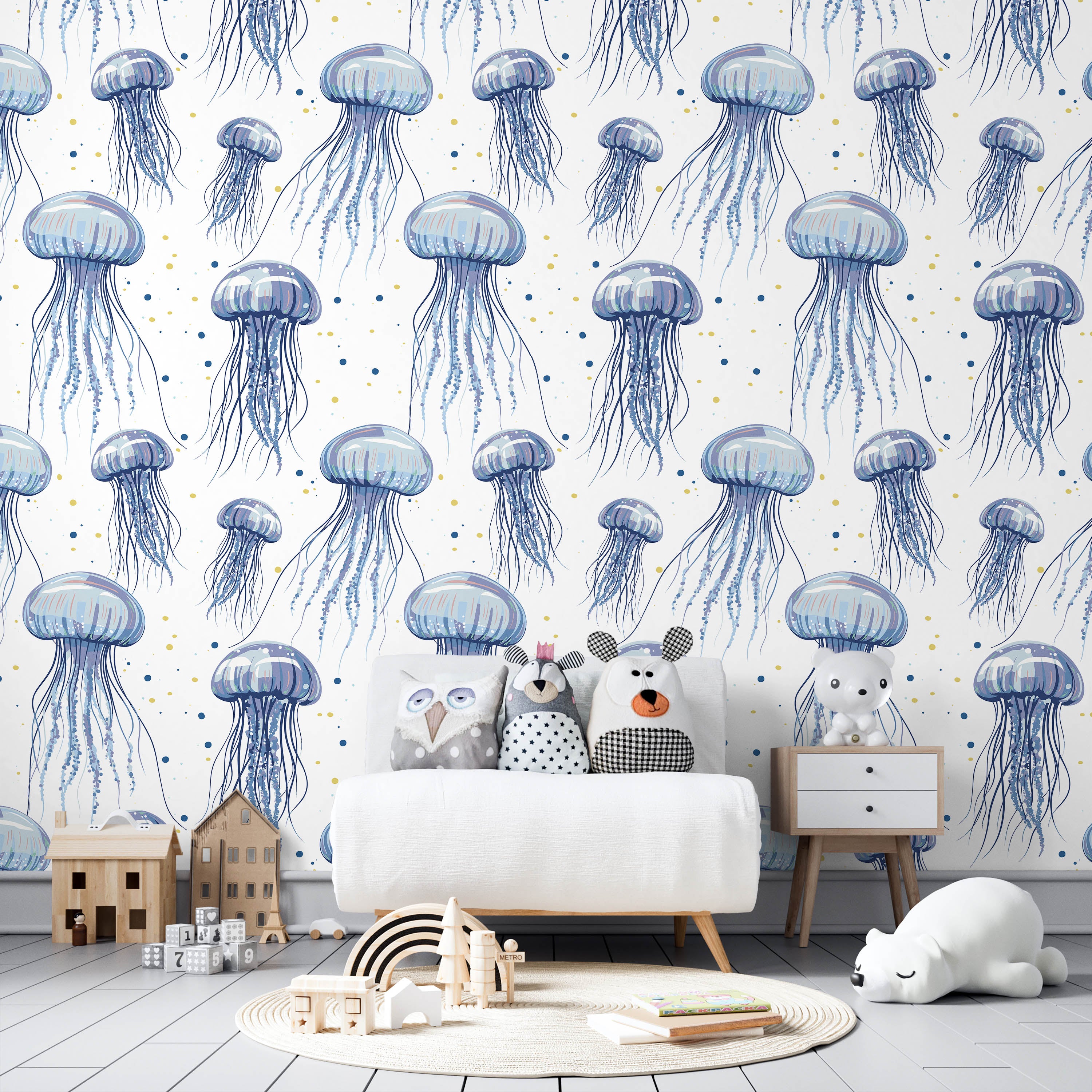 Blue jellyfish drift across crisp white space, accented by vibrant scattered dots. This wallpaper combines marine elegance with contemporary design, perfect for creating a serene yet visually engaging accent wall in any room.