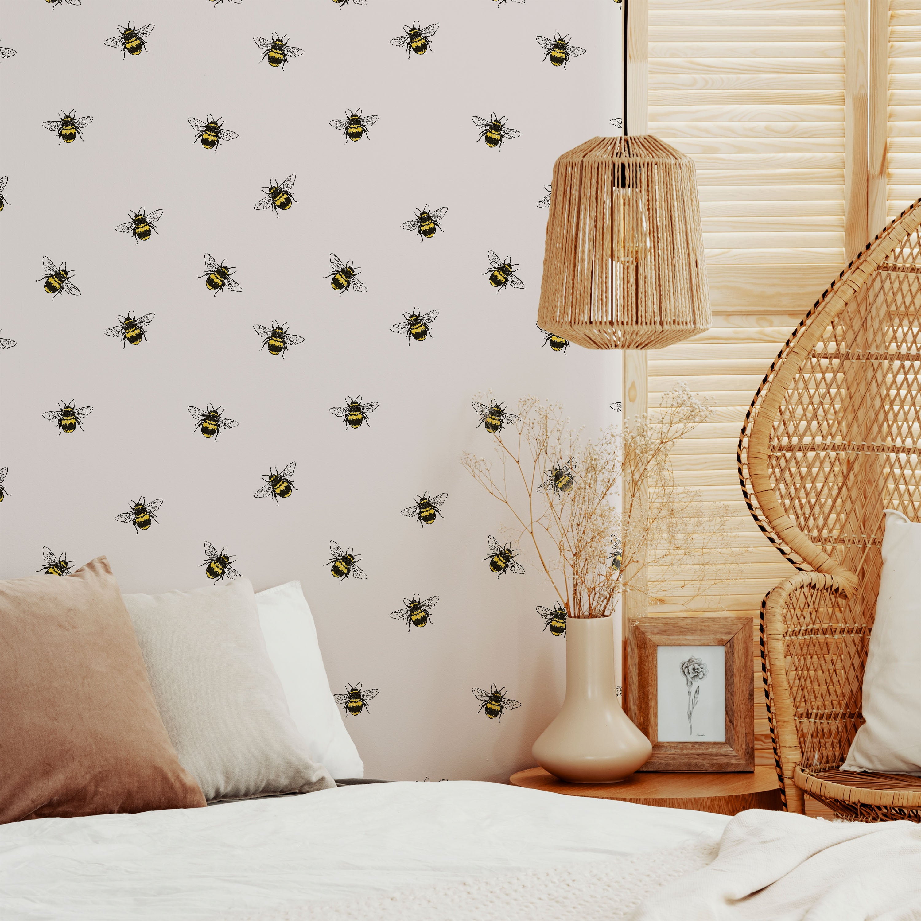 Charming wallpaper featuring a repeating pattern of industrious bees set against a soft light gray backdrop. Perfect for adding subtle botanical interest to nurseries, studies, or accent walls. The neutral color palette ensures versatile coordination with existing décor while the bee motif brings character and warmth to any space.