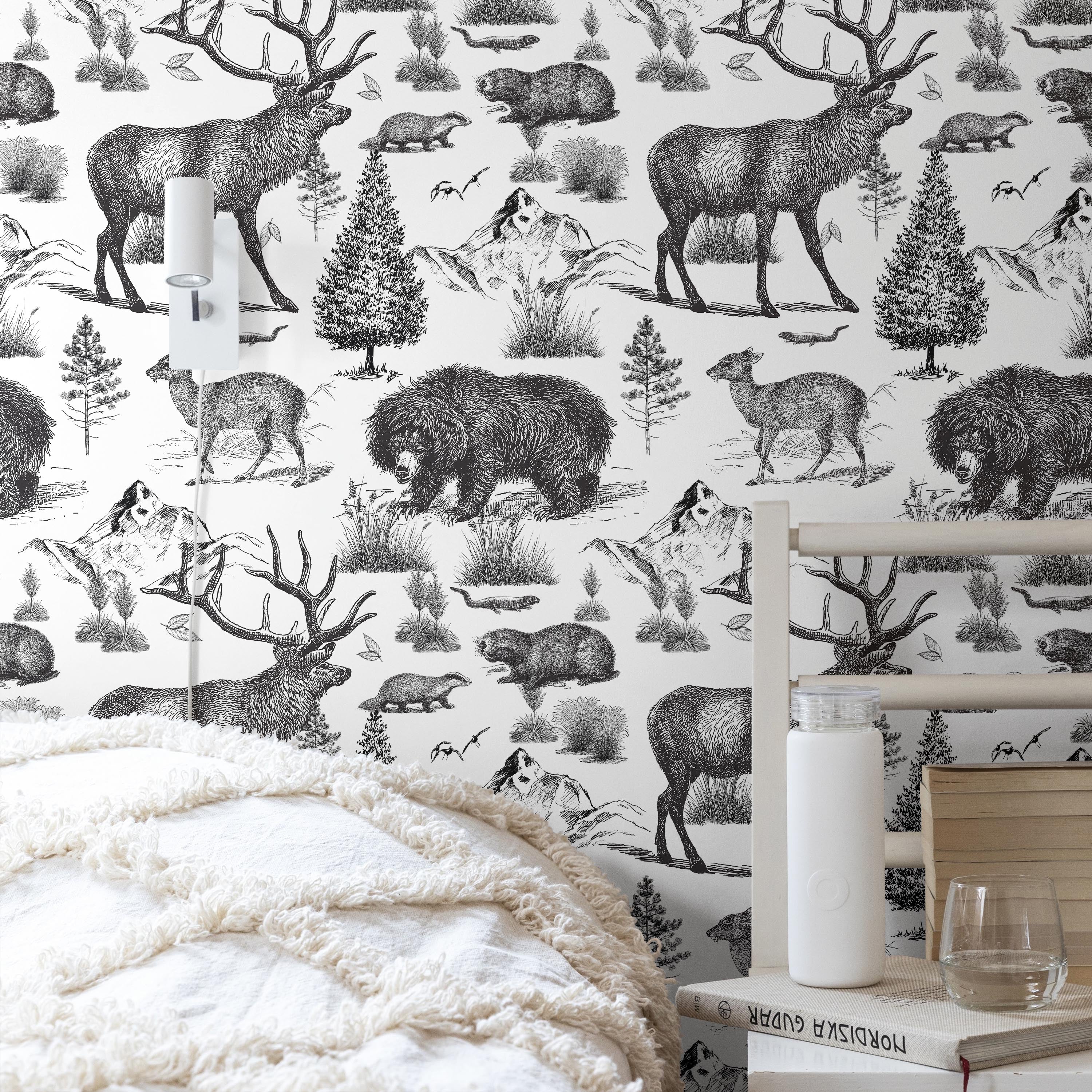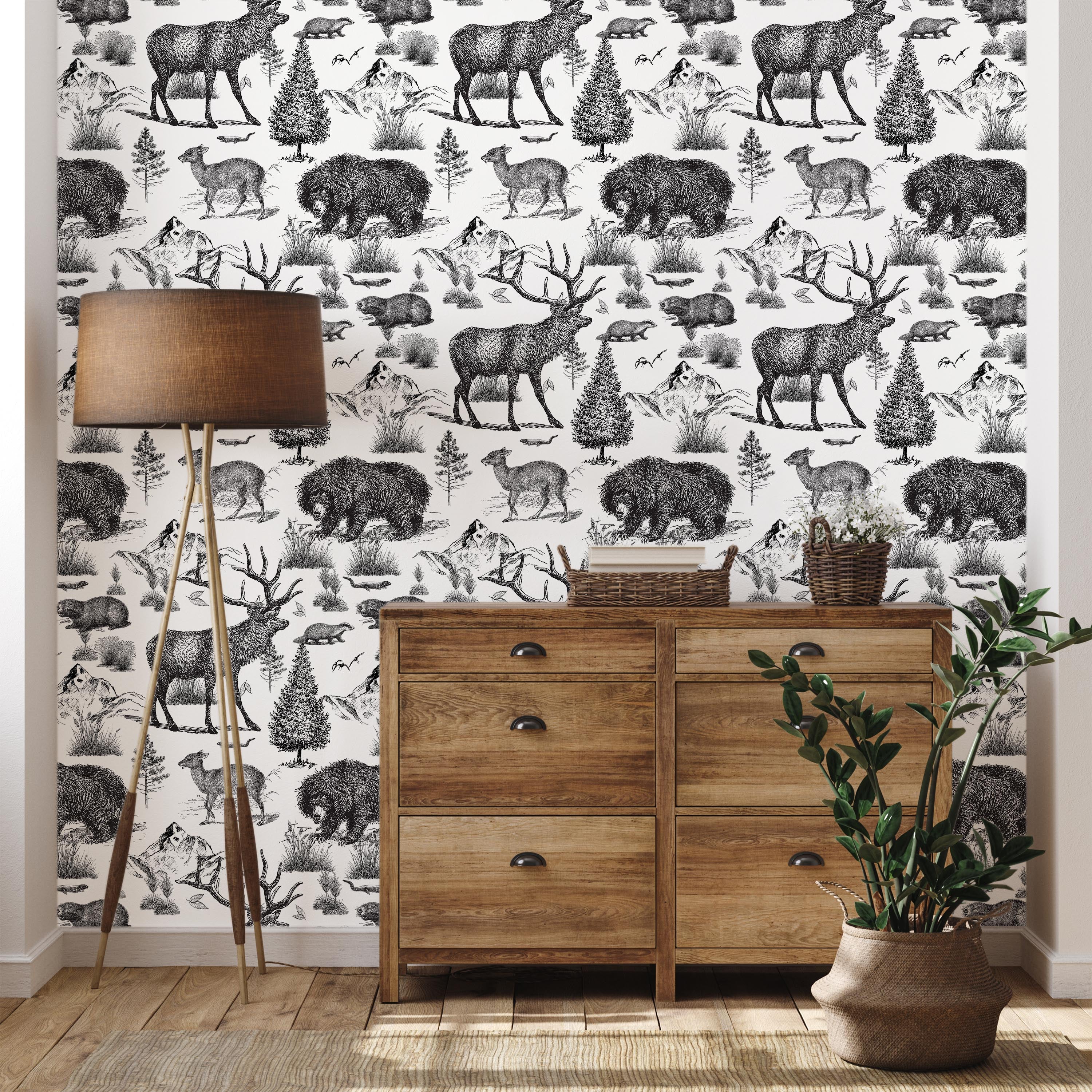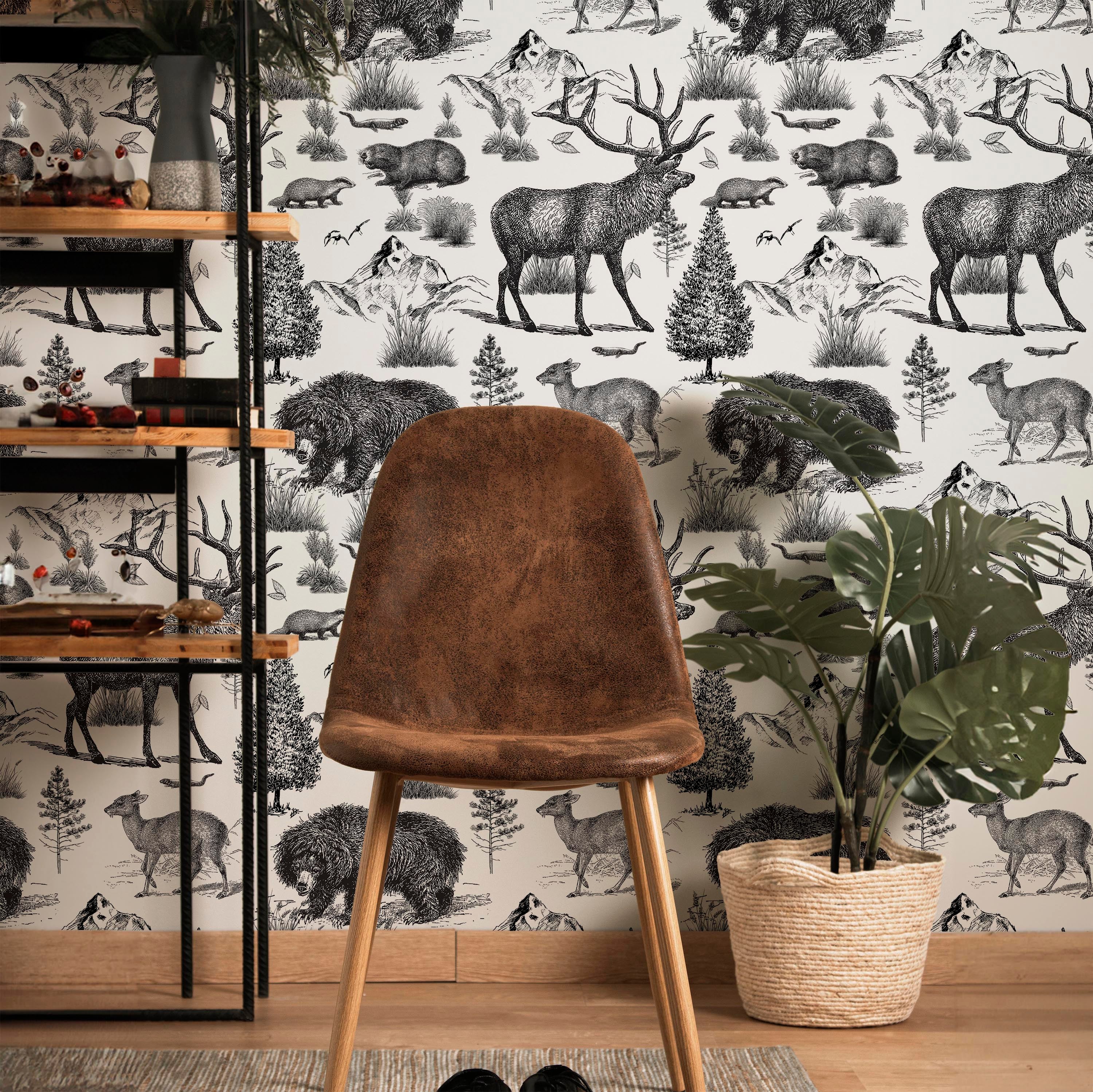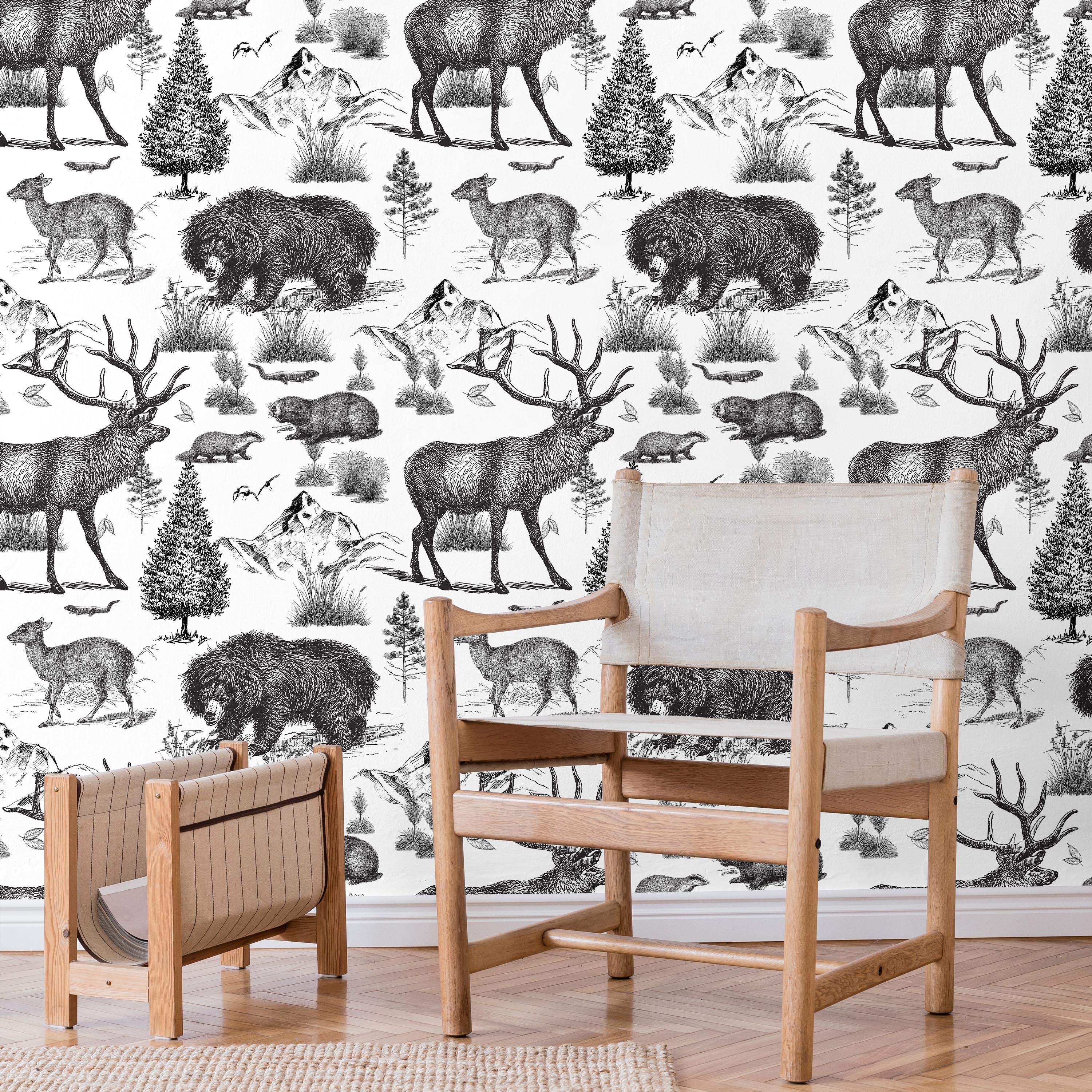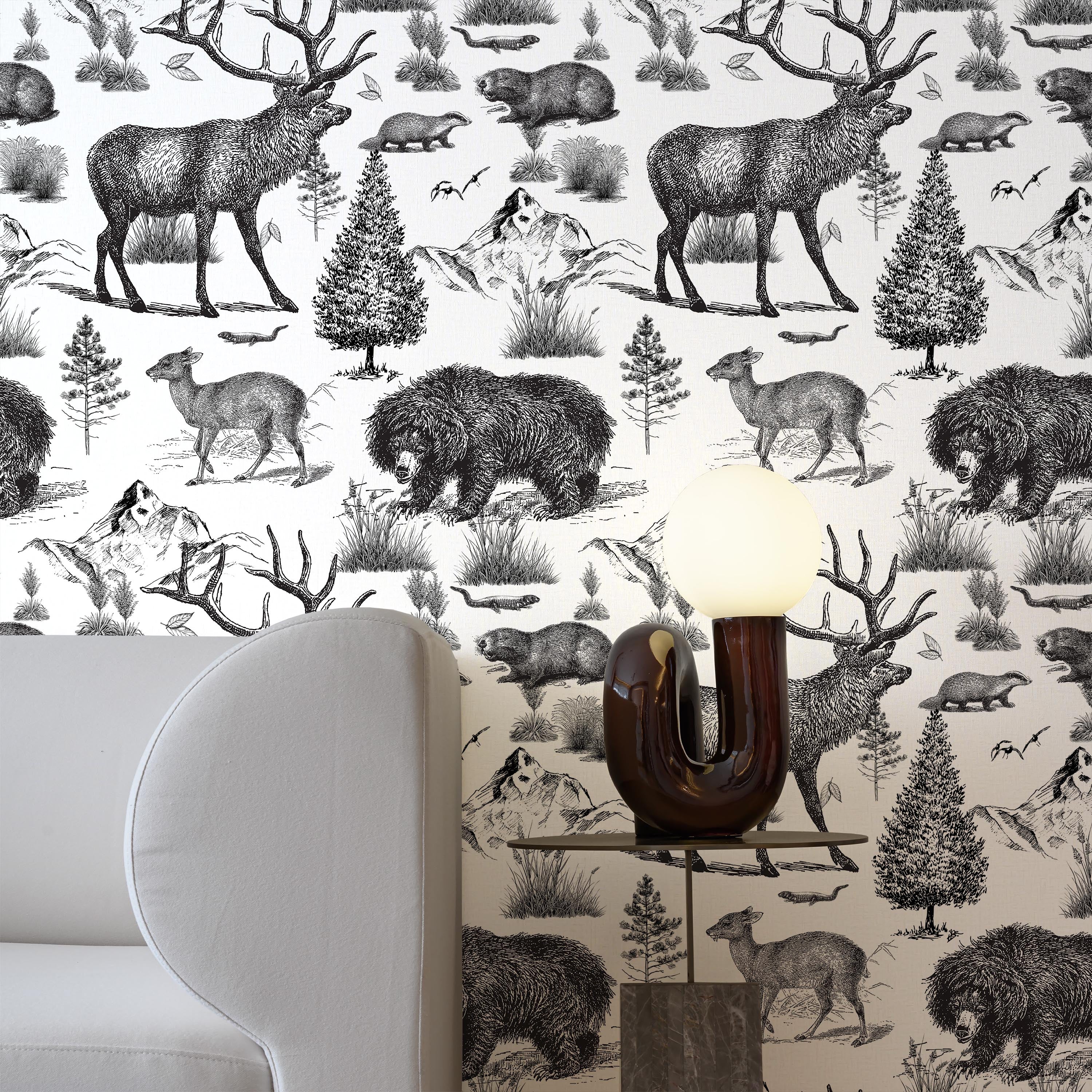 Scandinavian Woodland Wallpaper features a curated collection of forest wildlife amid lush vegetation and natural elements. This design brings serene, nature-inspired aesthetics to any interior space with authentic Nordic charm and timeless appeal.