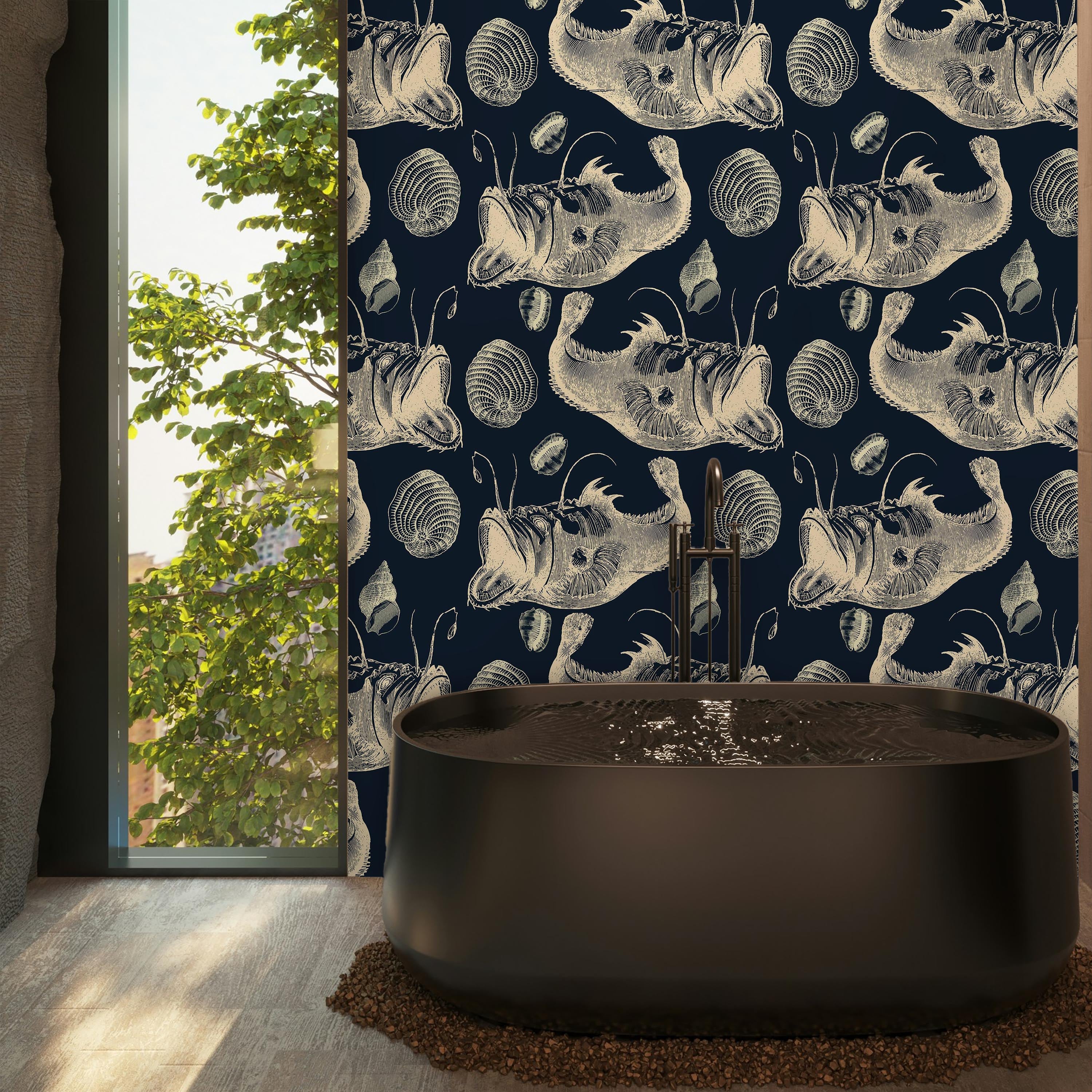Transform your space with this expertly crafted wallpaper showcasing intricate marine illustrations—fish and shells rendered in fine detail against a rich, dark backdrop. Ideal for establishing sophisticated coastal aesthetics.