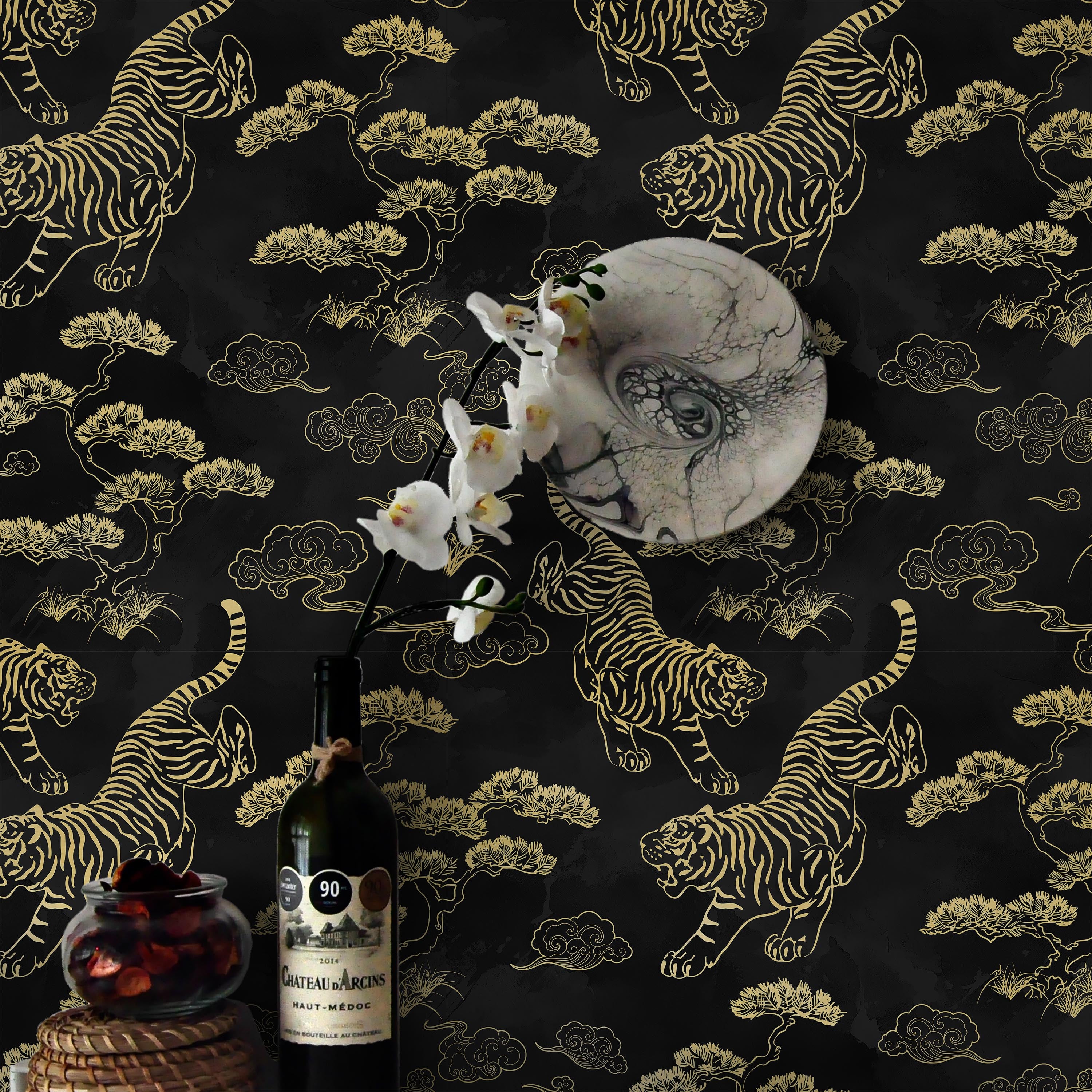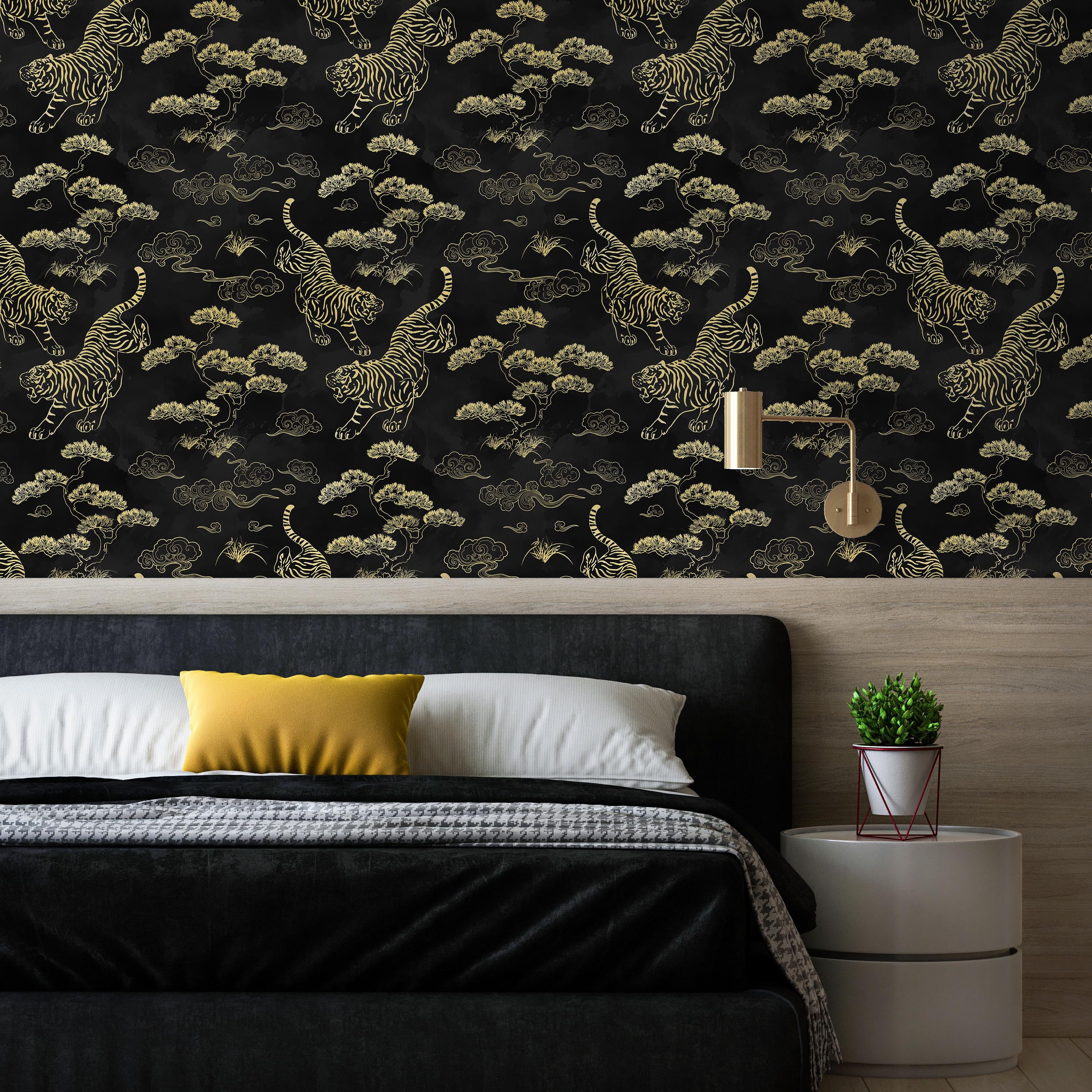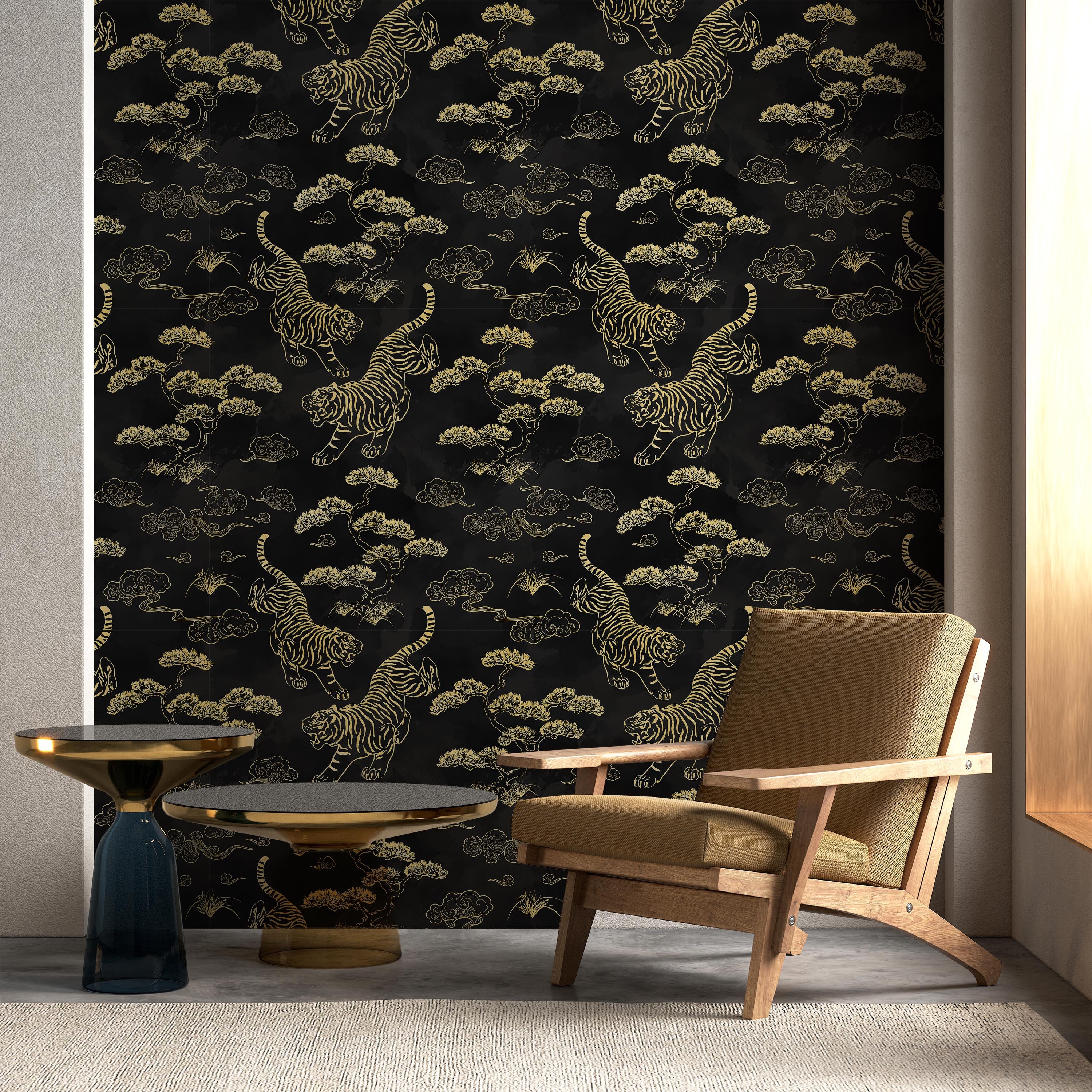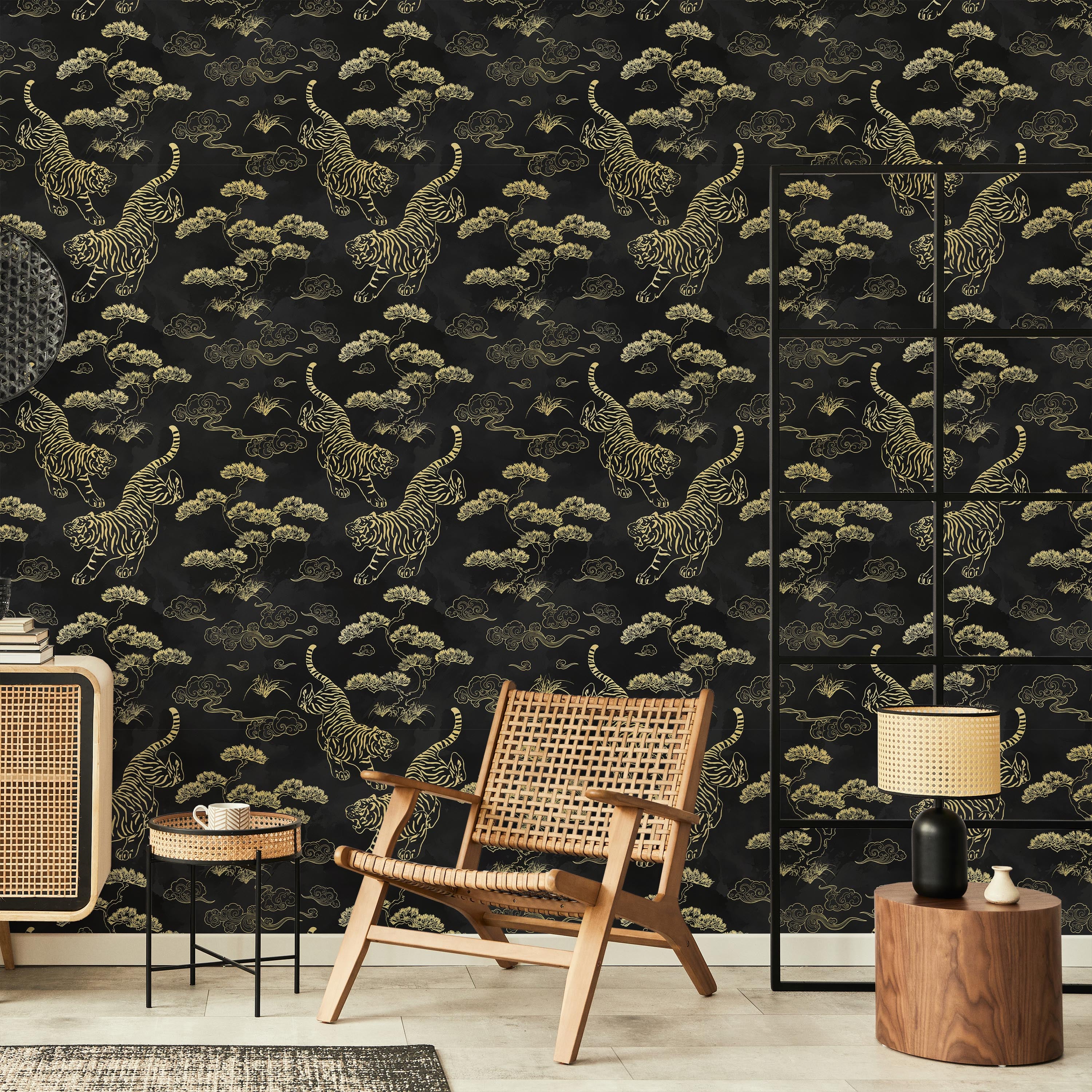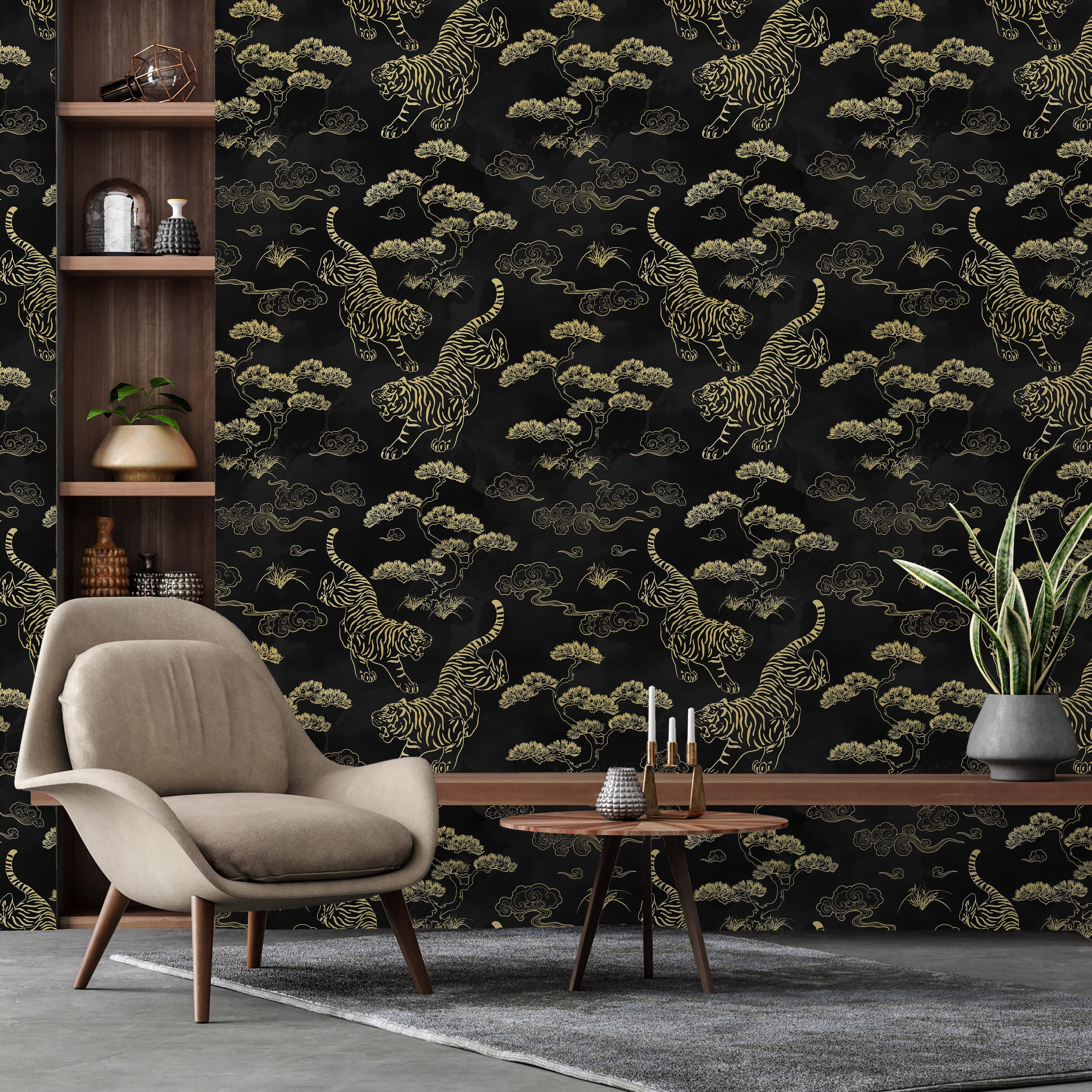 Transform your space with this striking wallpaper featuring a majestic gold tiger prowling through stylized trees against a deep black backdrop. The sophisticated metallic detailing creates dramatic visual depth, perfect for adding contemporary elegance to any room.