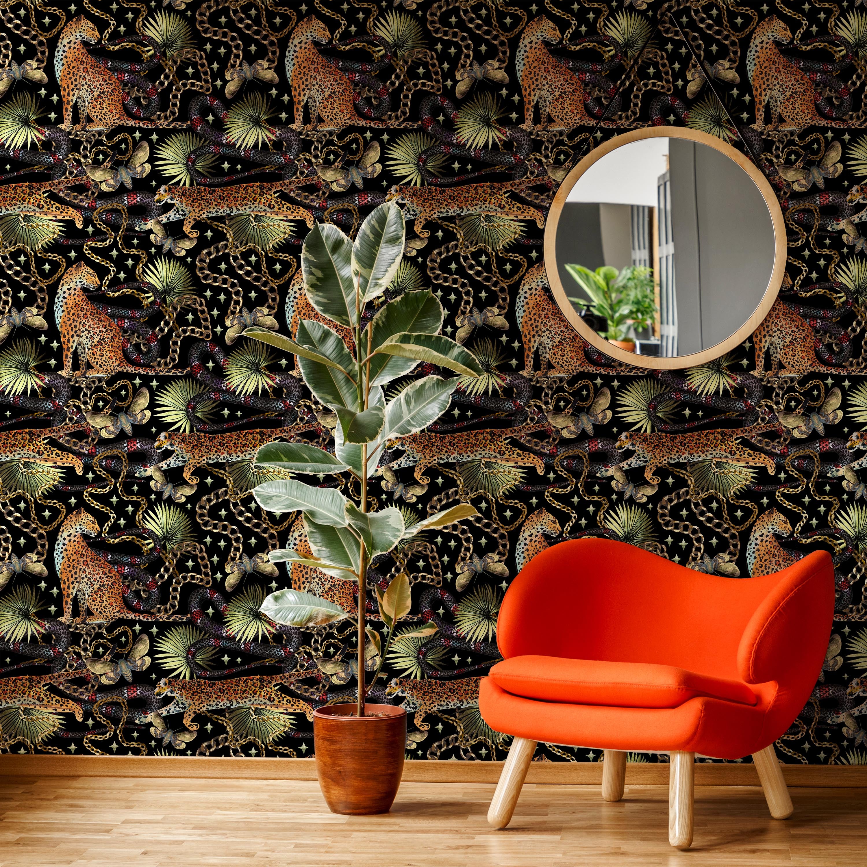 Bold tropical aesthetics meet modern edge. This striking wallpaper features leopard prints, metallic chains, and lush botanical elements layered against a sophisticated black backdrop. Perfect for creating dramatic, statement-making interiors with contemporary flair.