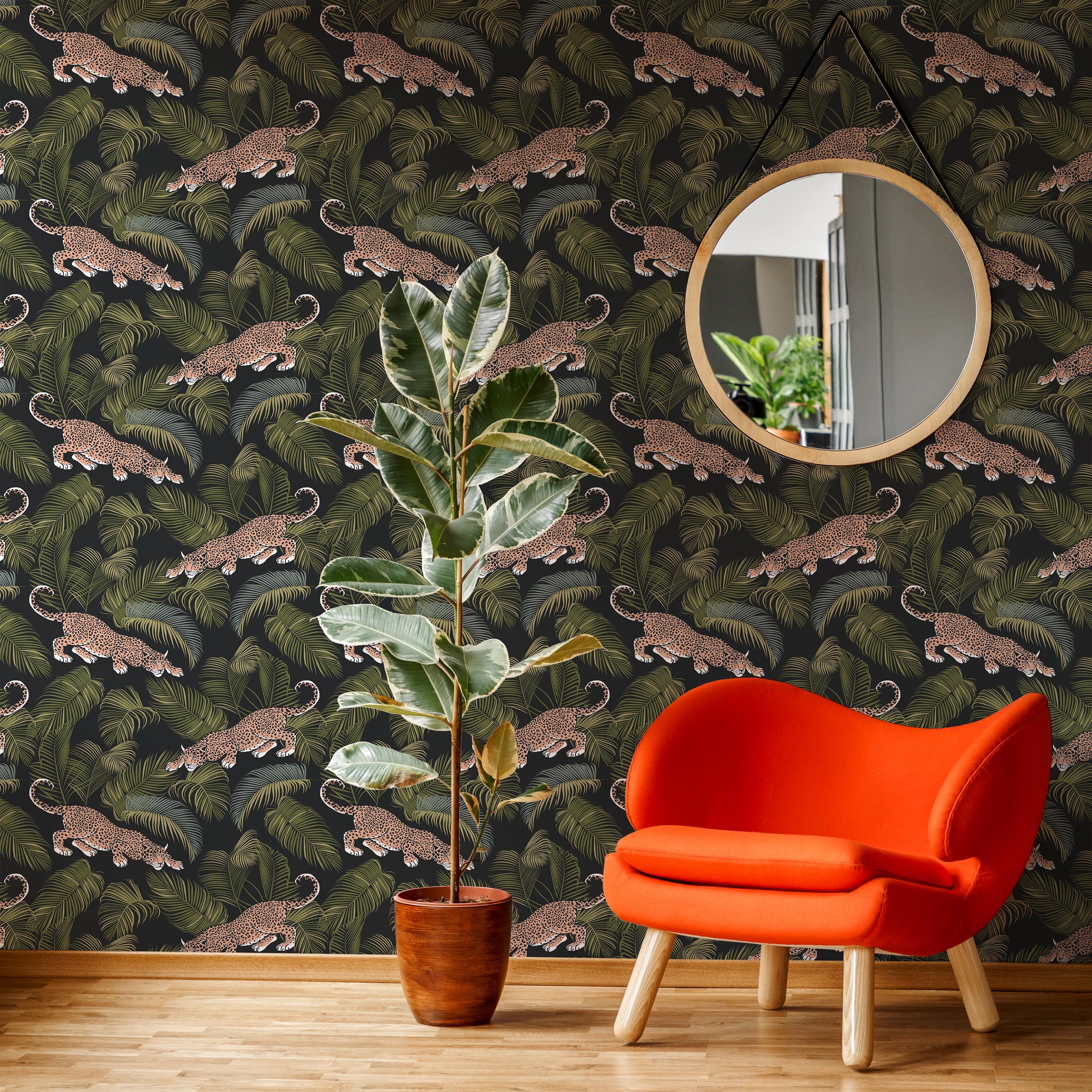 Elegant wallpaper showcasing leopard spots layered with lush green foliage on a rich black canvas. This design combines animal print sophistication with botanical elements, delivering a refined aesthetic that transforms any room into a gallery-worthy space with understated luxury.