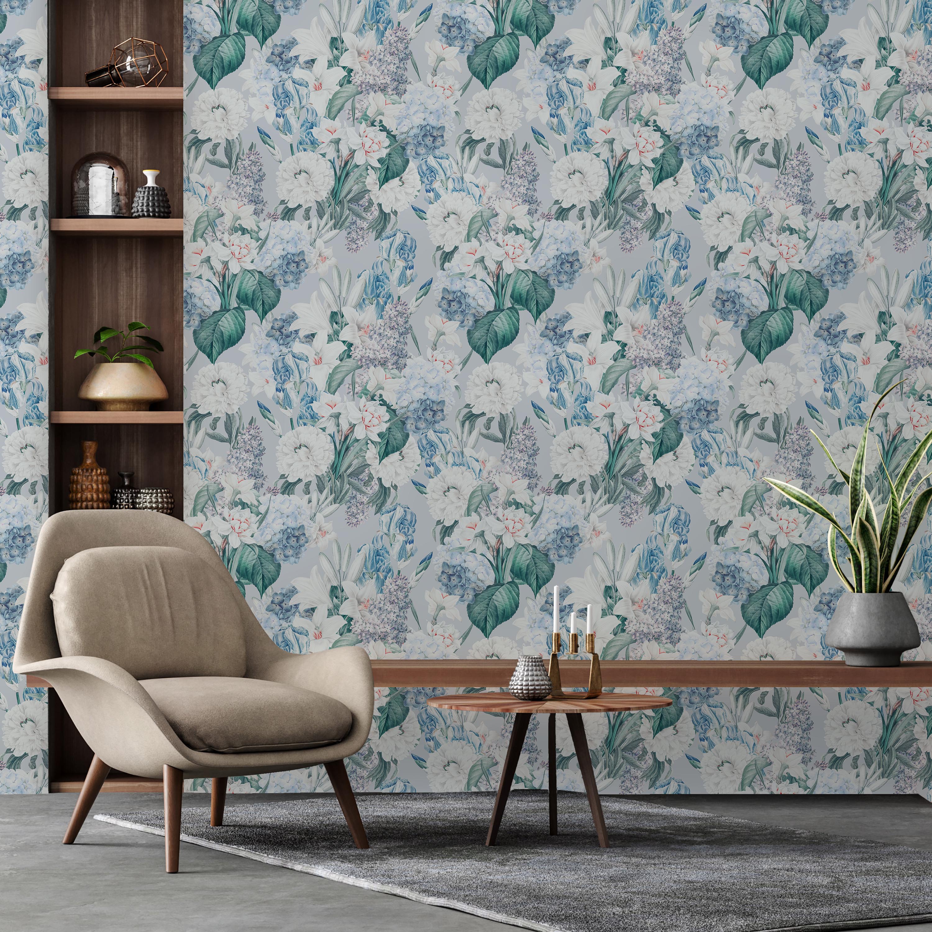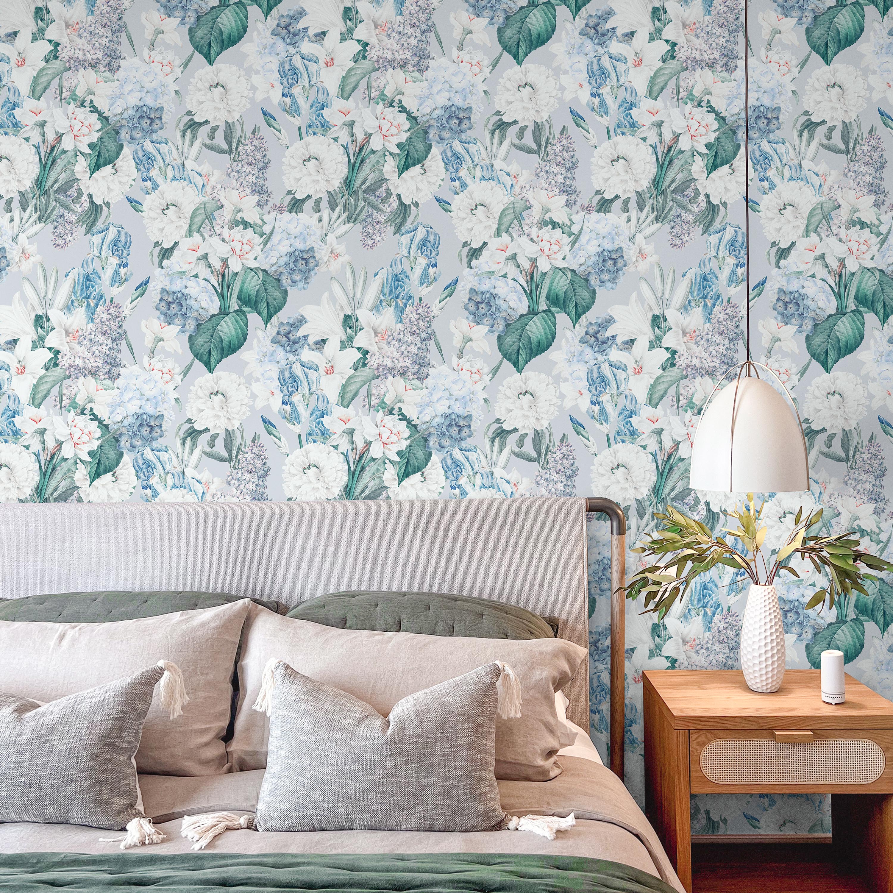 Elegant floral wallpaper featuring a sophisticated pattern of blue and white blooms with verdant foliage set against a soft gray backdrop. Perfect for creating refined, nature-inspired interiors with timeless appeal.