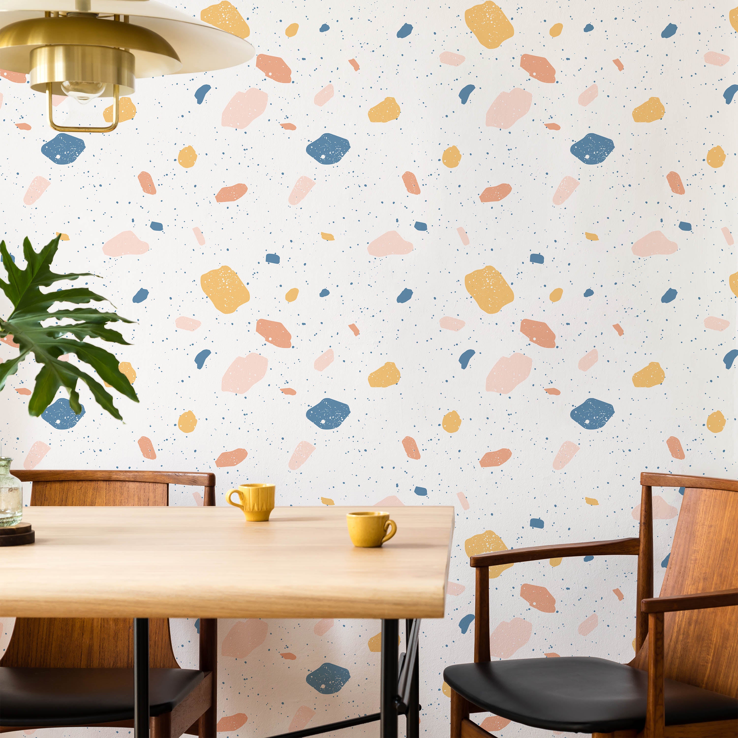 Vibrant abstract shapes in soft pastel hues create dynamic visual interest against a clean white backdrop. This contemporary wallpaper design brings artistic flair to any room while maintaining sophisticated restraint through its minimalist composition.