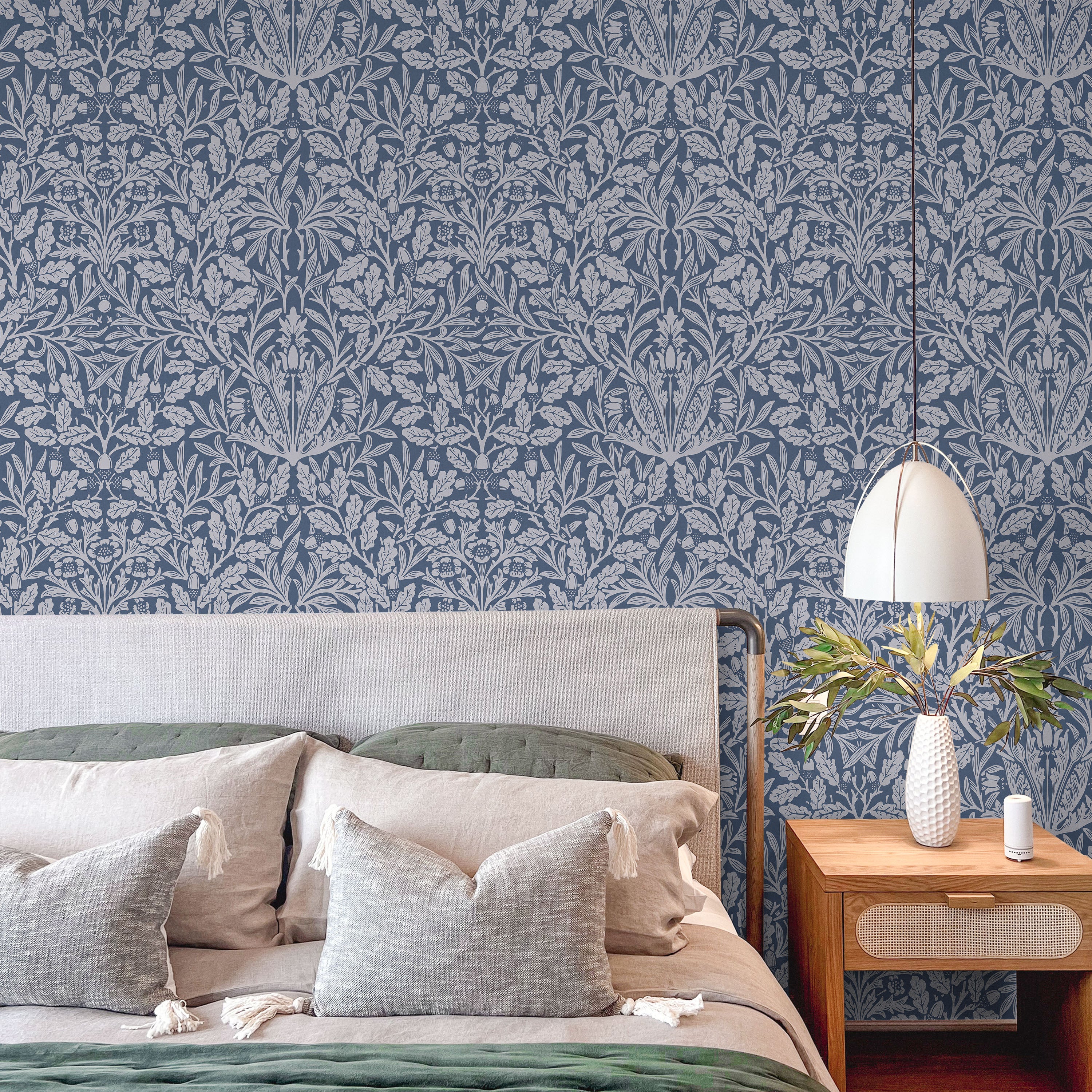 William Morris X Acorn Wallpaper brings timeless botanical elegance to your space. This striking blue backdrop features intricately detailed leaves and blooming flowers, capturing the essence of classic Arts and Crafts design. Perfect for creating a sophisticated, nature-inspired atmosphere in any room.