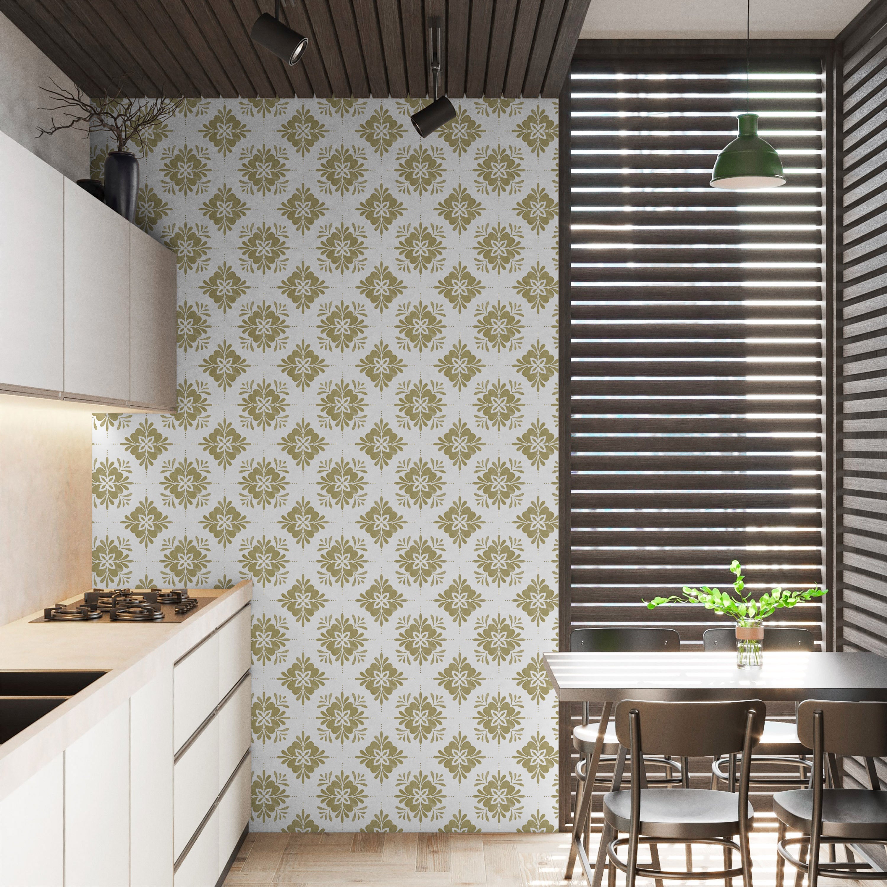 Elegant wallpaper featuring intricate gold mandala patterns set against a soft beige backdrop. The sophisticated floral design brings timeless charm and visual depth to any room, creating a refined focal point that complements both traditional and contemporary interiors.