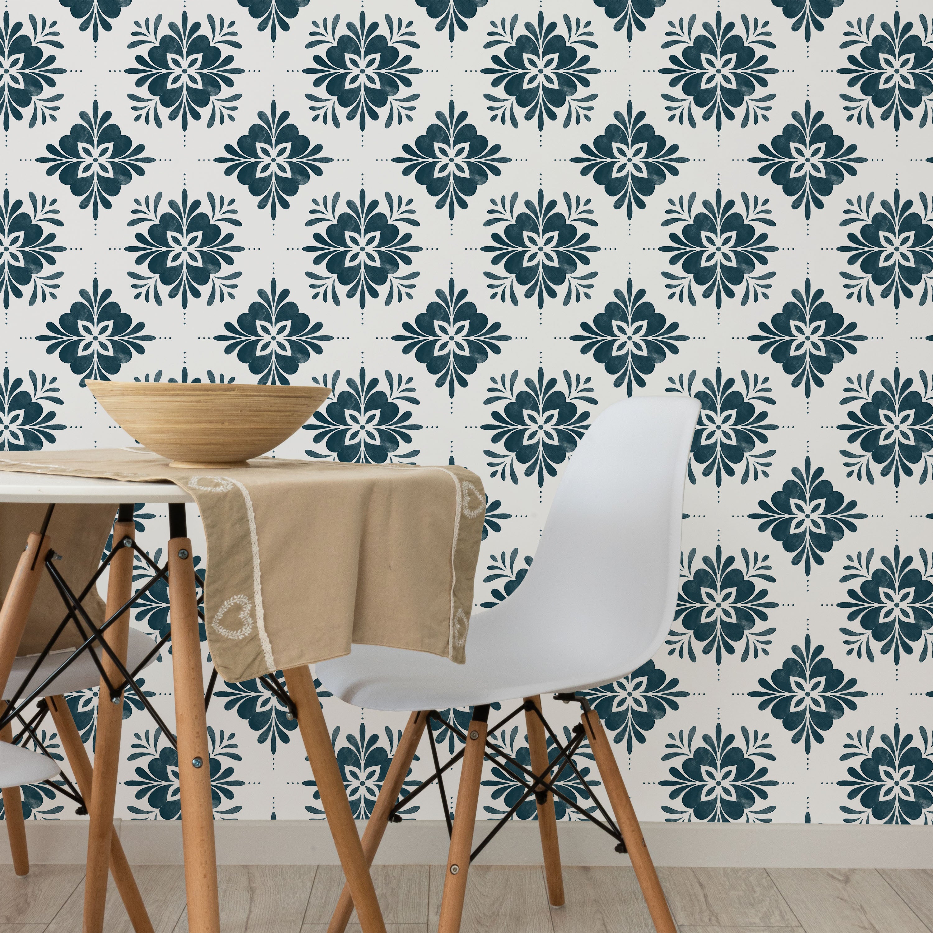 Aria Mandala Wallpaper features intricate blue floral patterns set against a crisp white backdrop. This sophisticated design brings elegance and visual depth to any room, combining traditional mandala artistry with contemporary aesthetics for a refined interior statement.