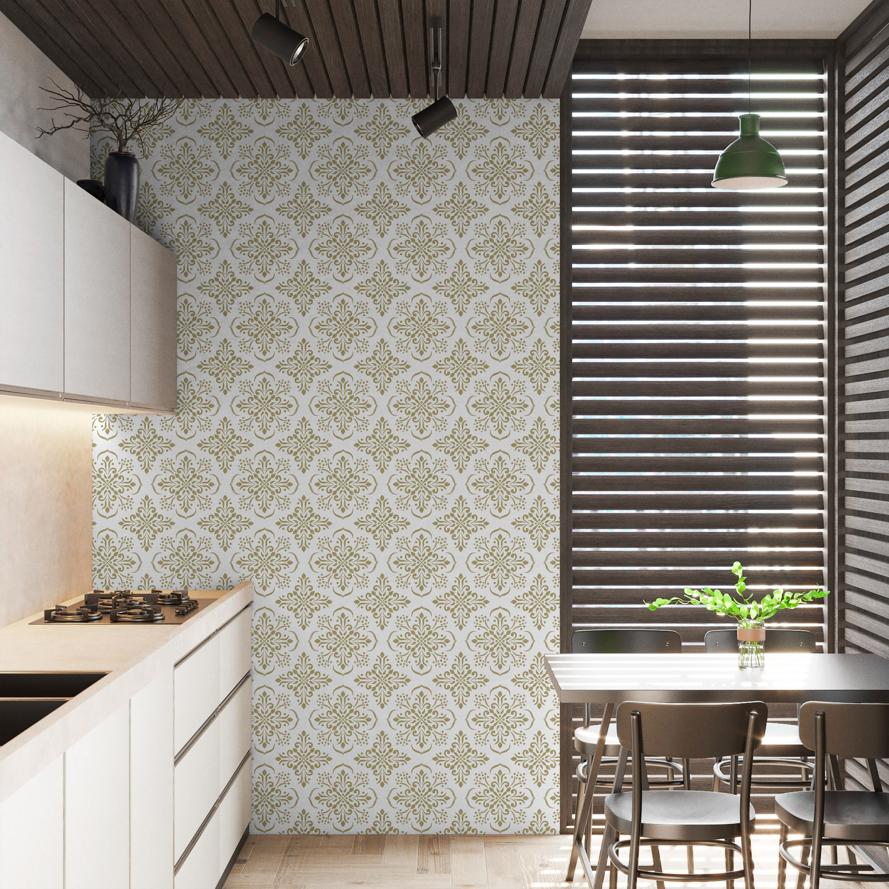 Sophisticated mandala-inspired wallpaper featuring an intricate gold geometric pattern against a serene beige backdrop. Elevates any interior with timeless elegance and refined aesthetic appeal. Perfect for creating a focal point or establishing a cohesive design scheme throughout your space.