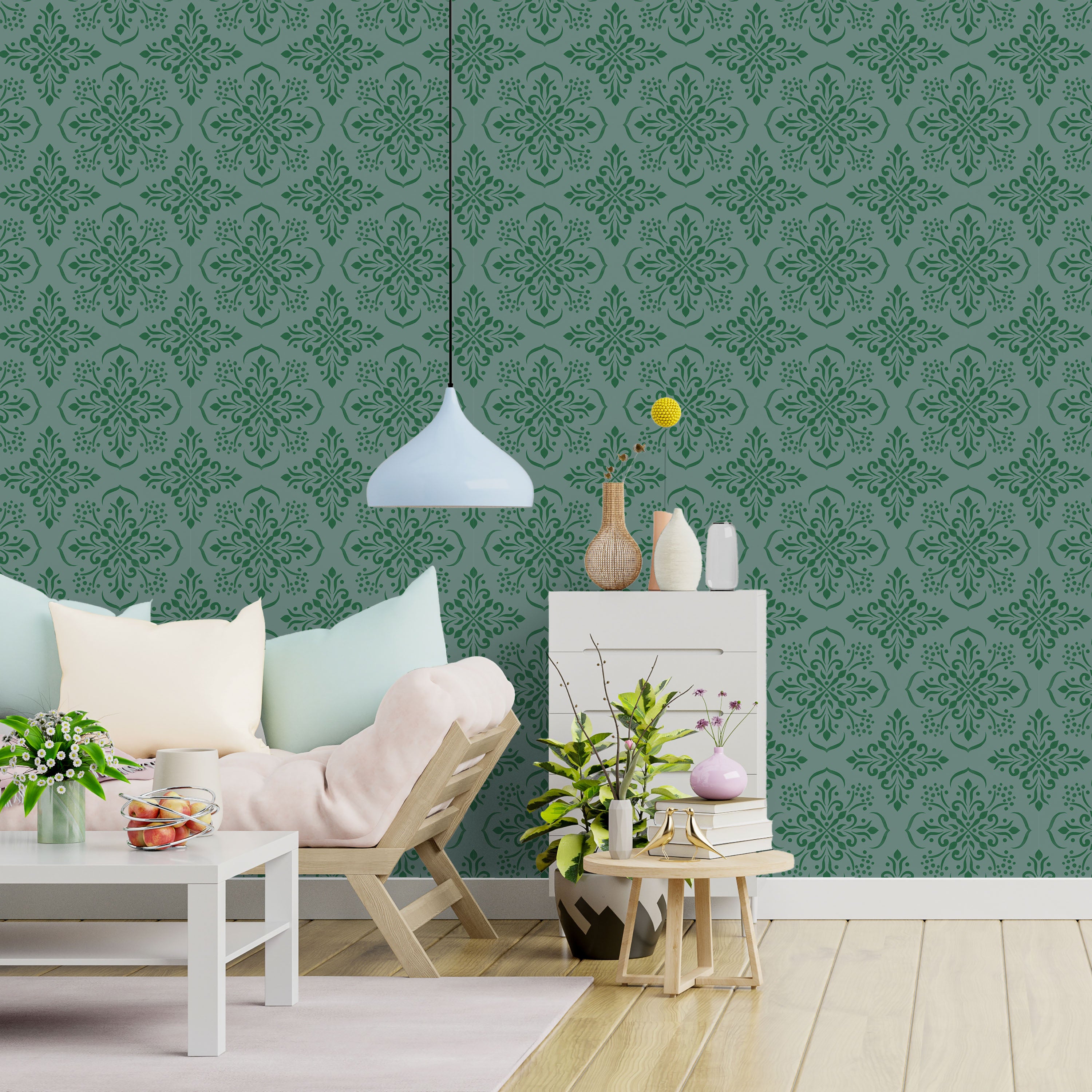 Elegant mandala wallpaper showcasing verdant geometric patterns on a calming teal foundation. The intricate design elevates interior spaces with timeless sophistication, merging ornamental detail with a harmonious color palette for discerning décor choices.