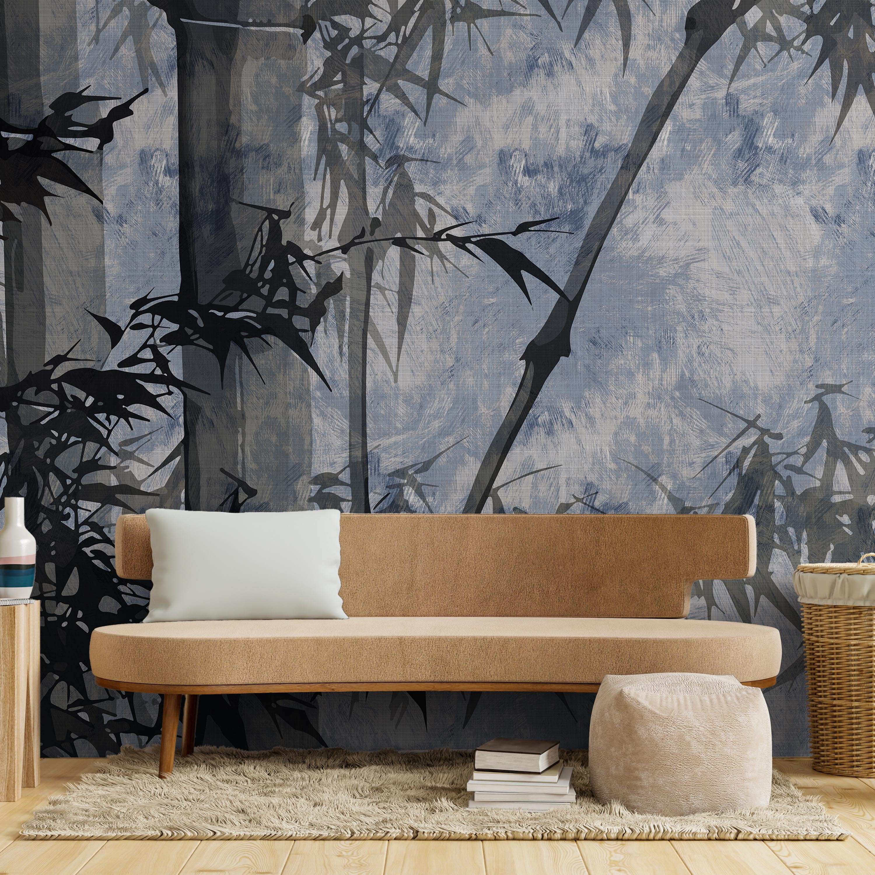 Serene bamboo stalks rendered in artistic detail against a richly textured blue backdrop. This mural wallpaper brings sophisticated botanical elegance to any space, creating a calming focal point that complements modern and traditional interiors alike.