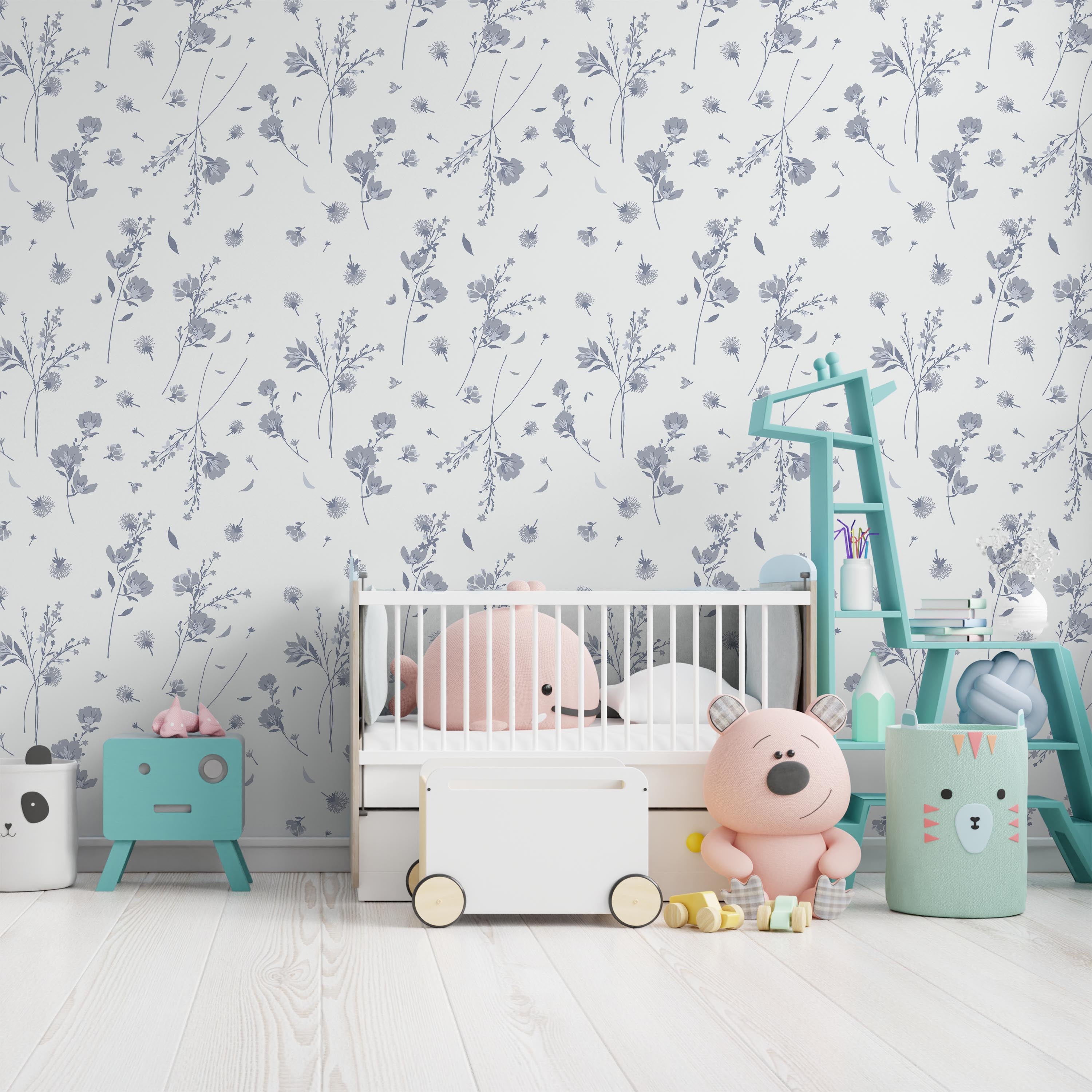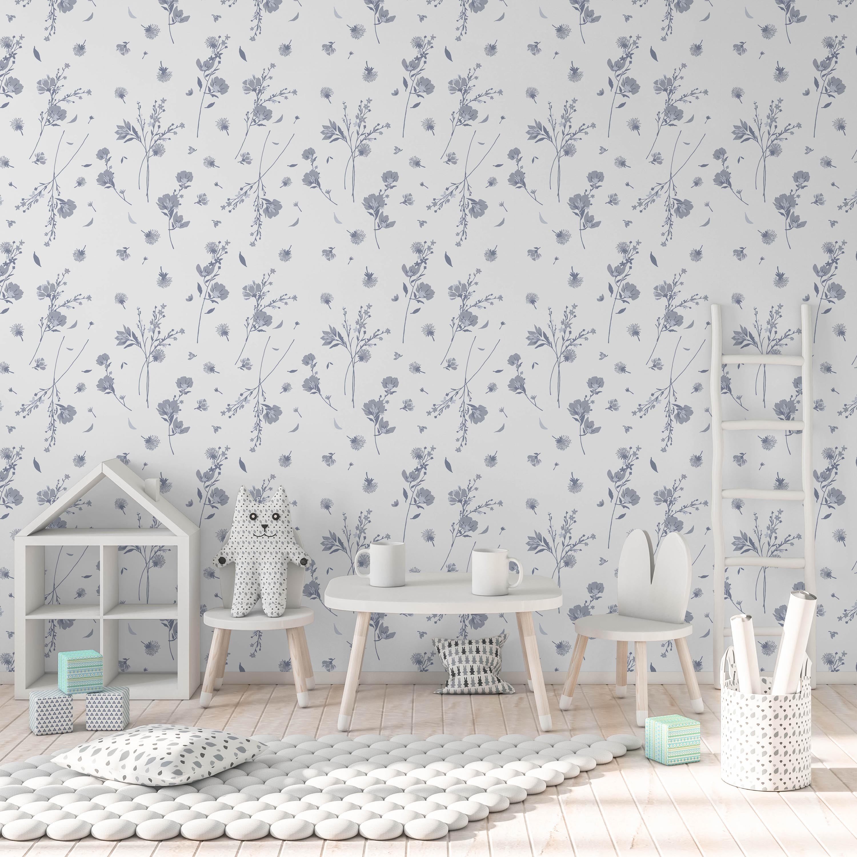 Elegant botanical wallpaper showcasing azure blossoms and leafy accents on a clean white foundation. This refined design seamlessly integrates into diverse interior styles, delivering understated sophistication and natural beauty to residential and commercial spaces alike.
