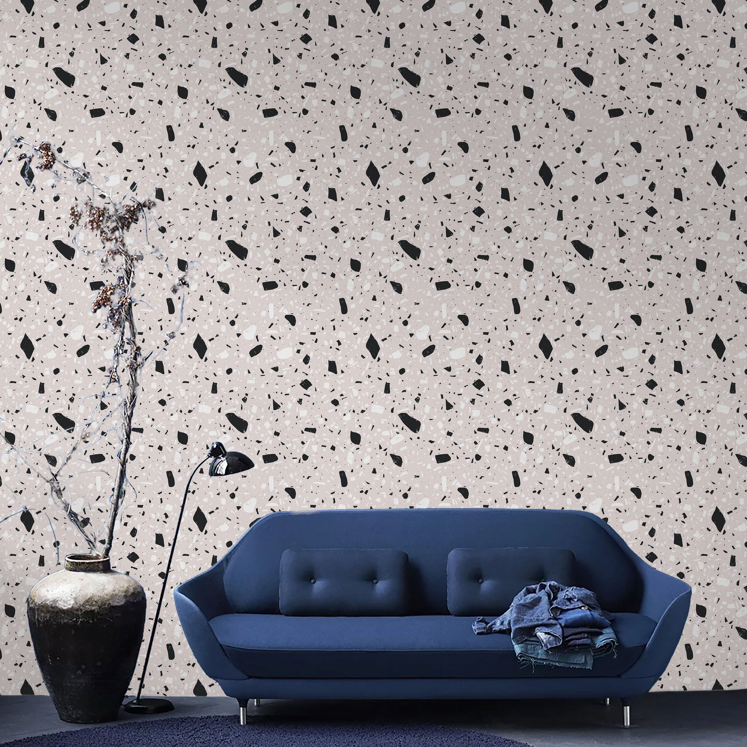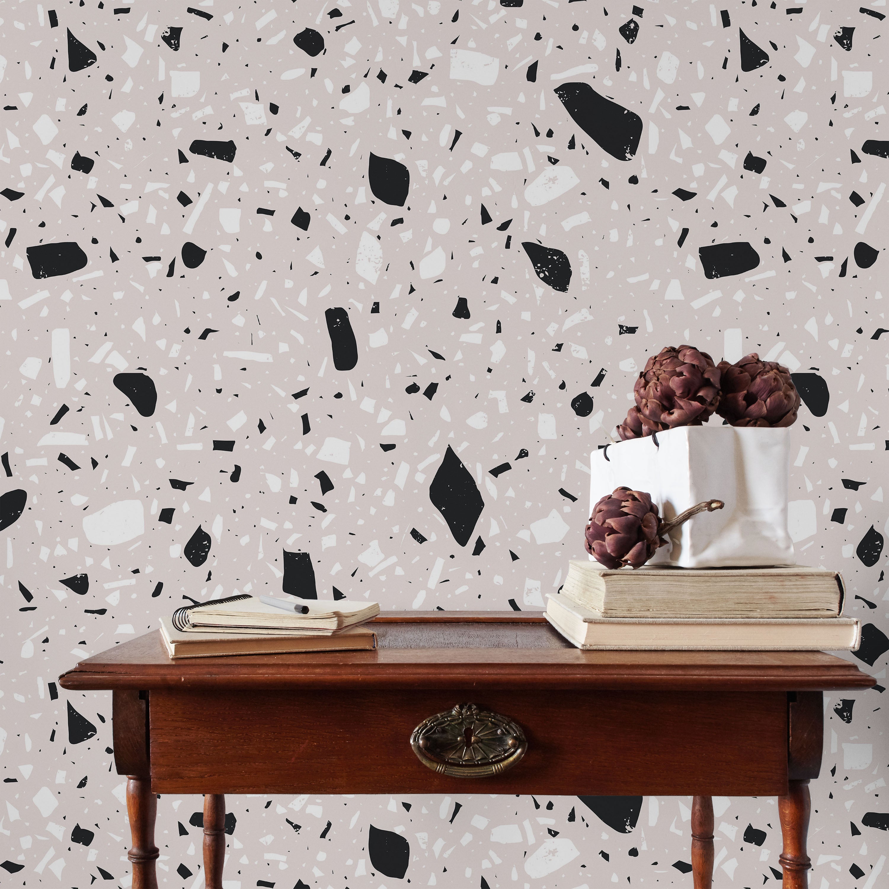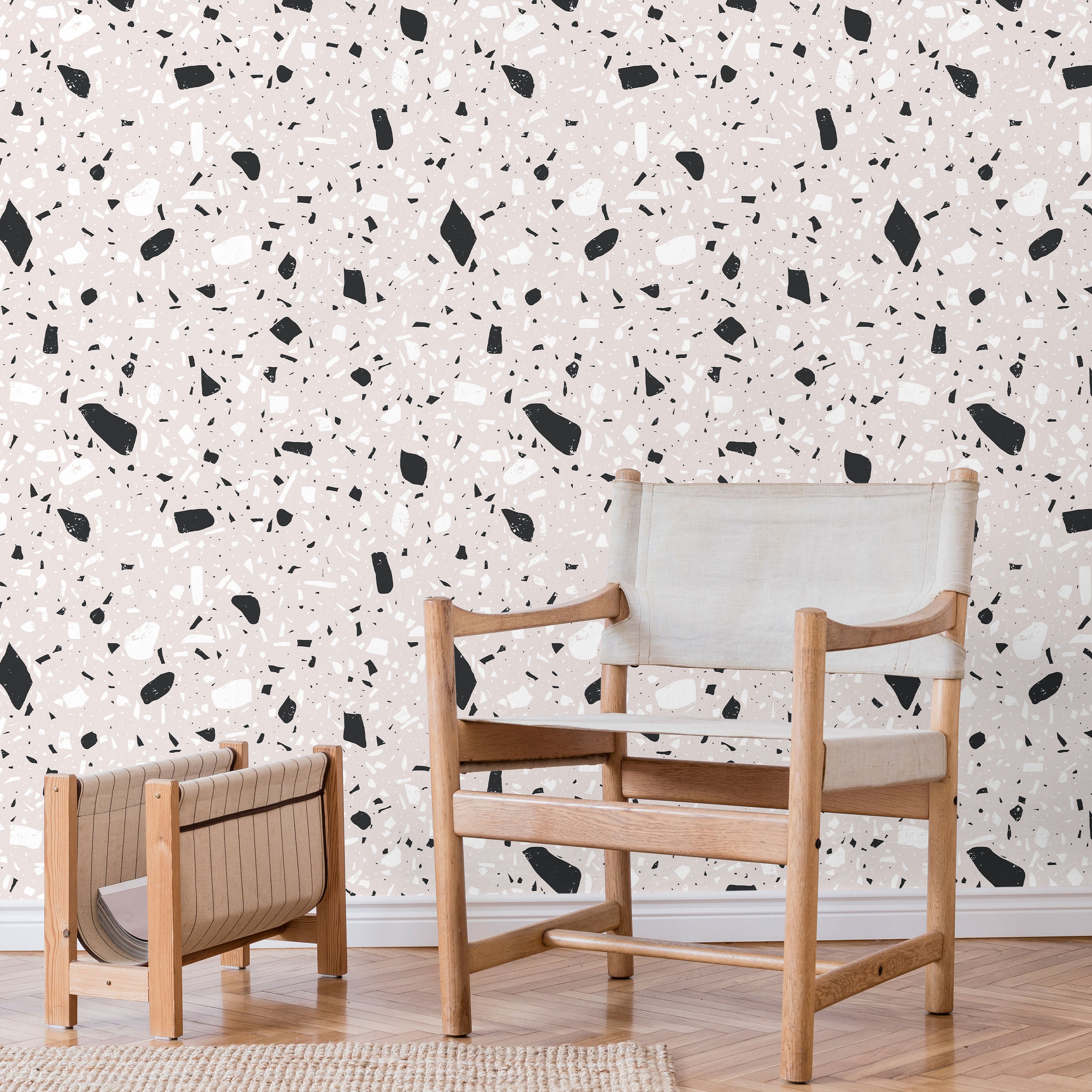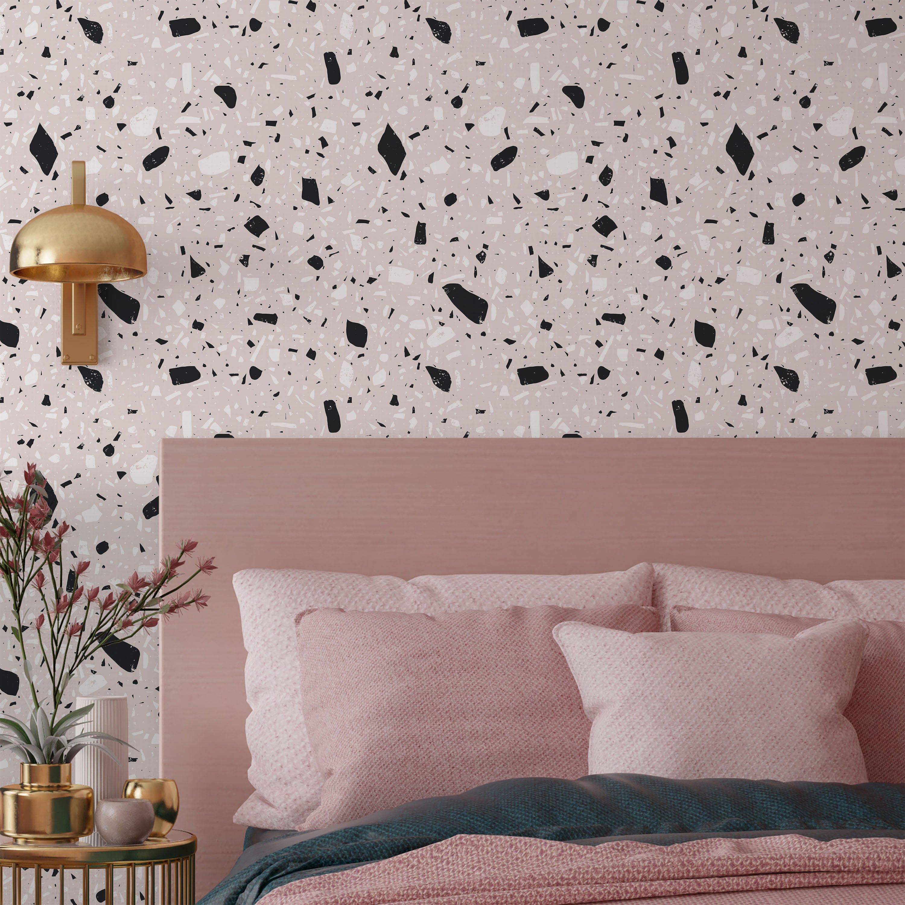 Modern geometric terrazzo pattern in black, white, and gray creates sophisticated visual interest against a soft blush pink backdrop. Perfect for contemporary interiors seeking understated elegance with architectural appeal.