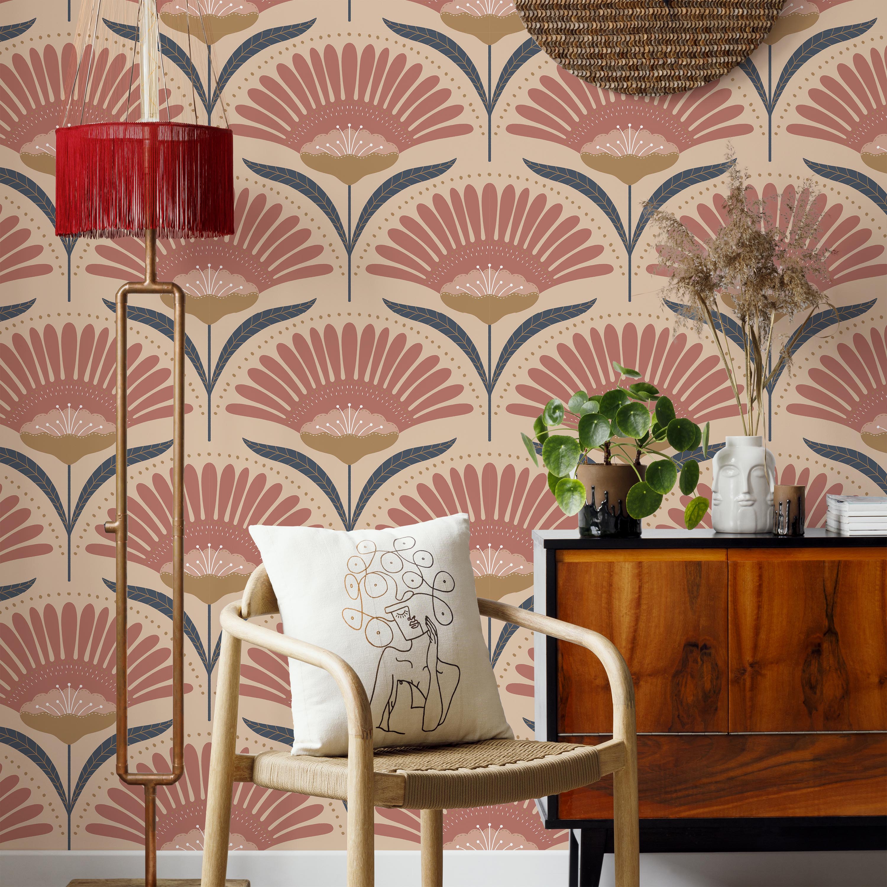 Transform your space with this refined floral wallpaper showcasing delicate pink blossoms and azure foliage against a neutral beige canvas. An expertly curated design that brings botanical elegance and timeless sophistication to any interior.