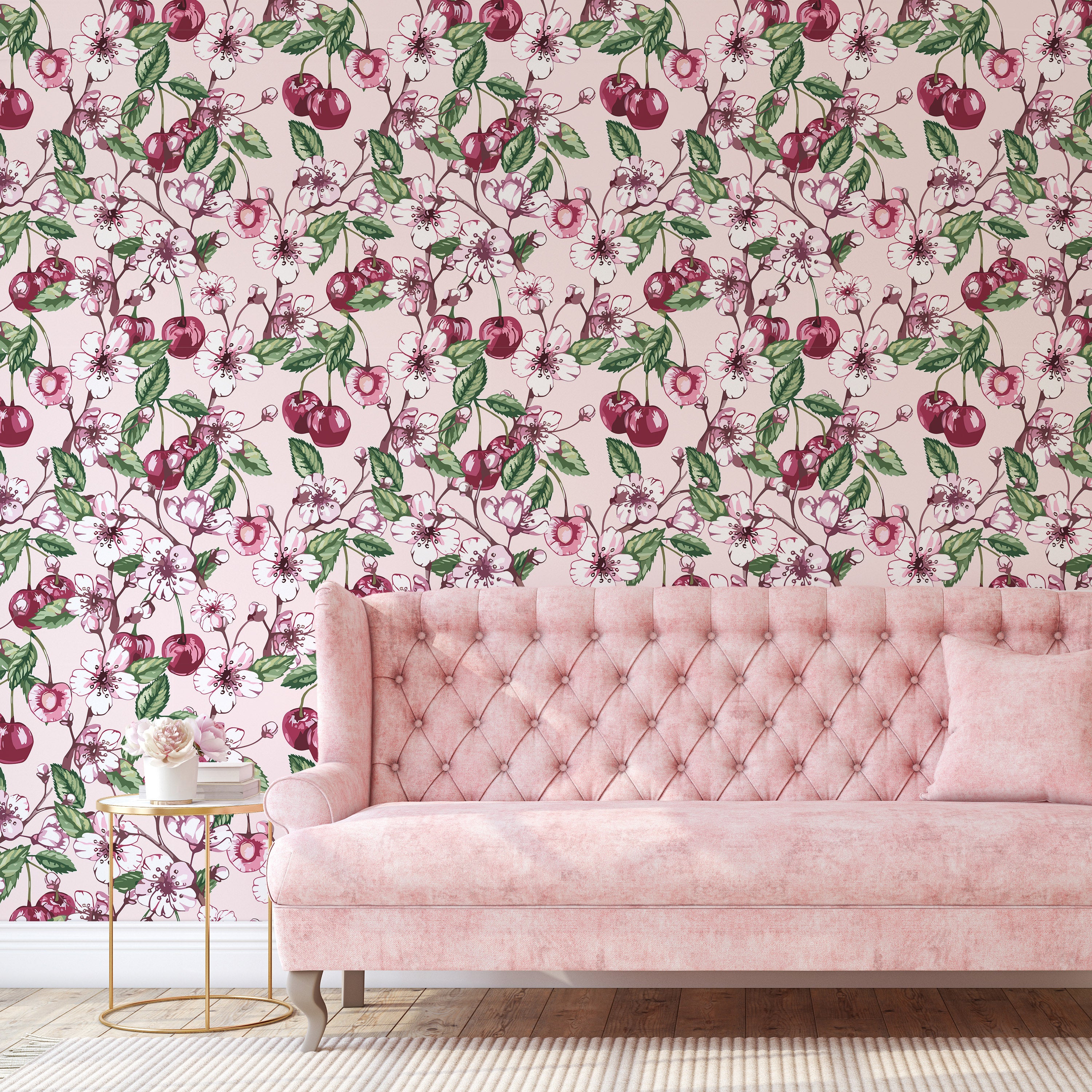 Cherry Love Wallpaper features an elegant floral and cherry motif set against a soft light pink backdrop. This sophisticated design brings botanical charm to any room, offering a refined aesthetic that complements both modern and traditional interiors with timeless appeal.