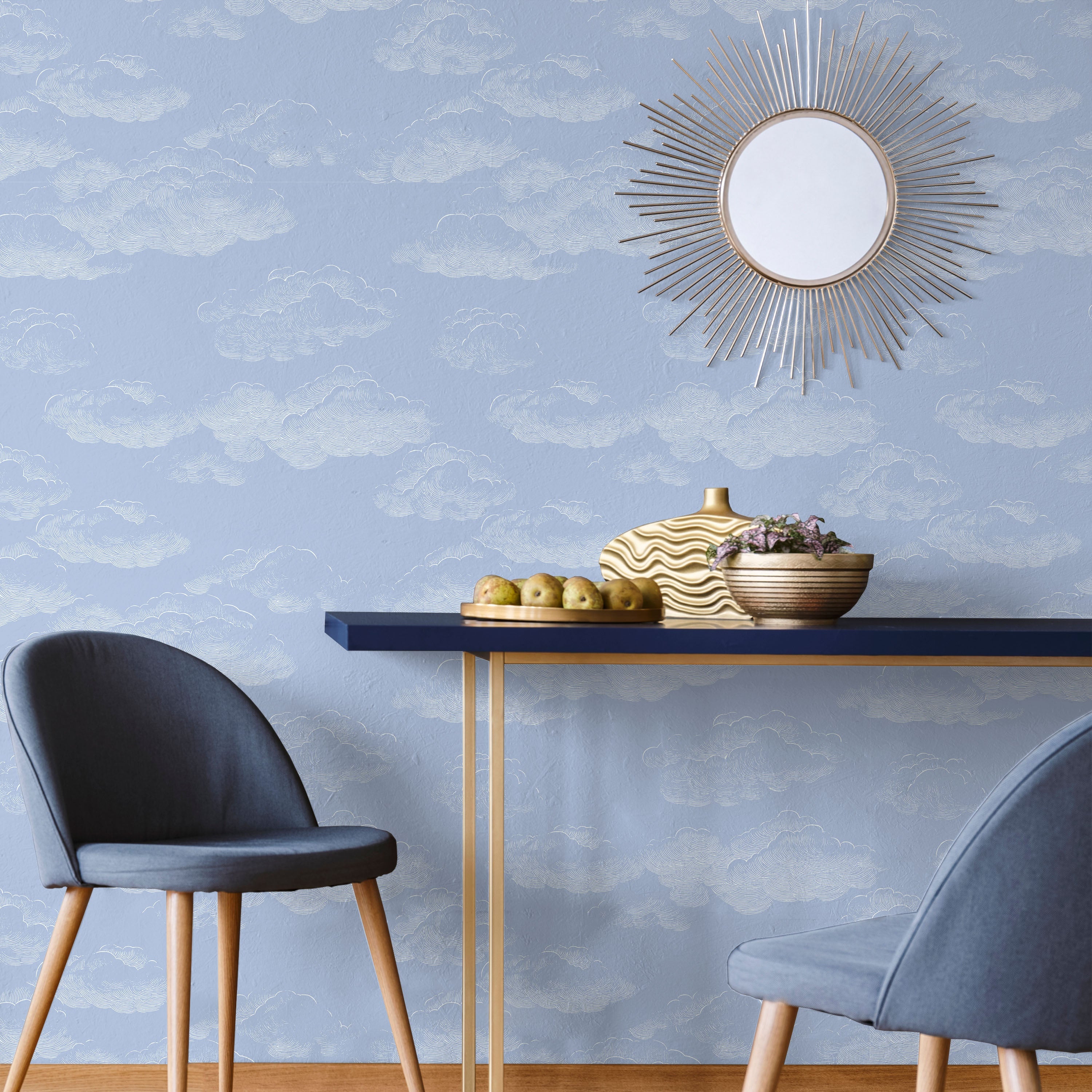 Serene white cloud formations drift across a soft blue backdrop, creating a calming visual atmosphere. This wallpaper design brings peaceful, sky-inspired aesthetics to any room while maintaining sophisticated simplicity.