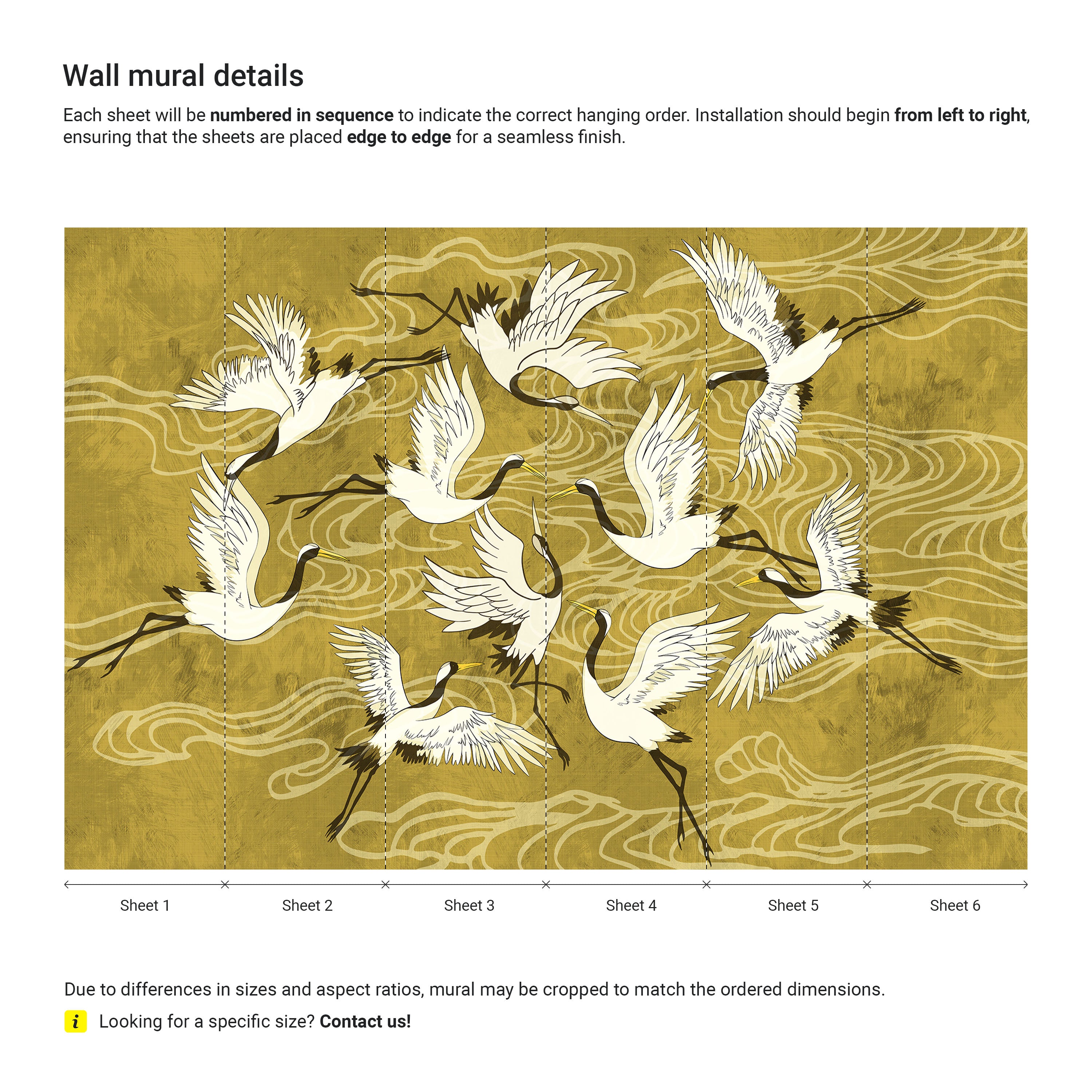 Each sheet will be numbered in sequence to indicate the correct hanging order. Installation should begin from left to right, ensuring that the sheets are placed edge to edge for a seamless finish. Due to differences in mural sizes and aspect ratios, murals may be cropped to match the ordered dimensions. Choose mural size based on your wall dimensions. Each sheet is 28" wide.