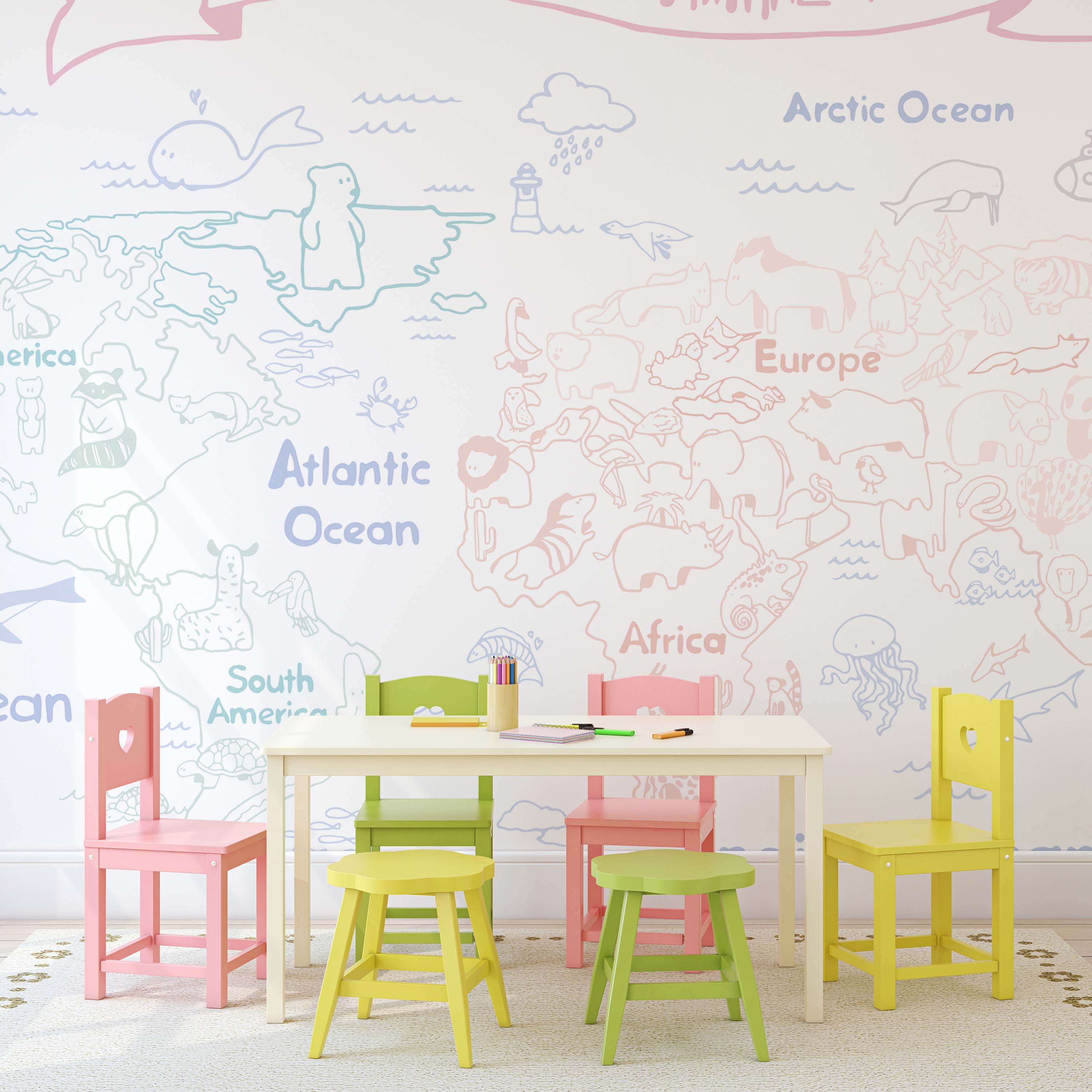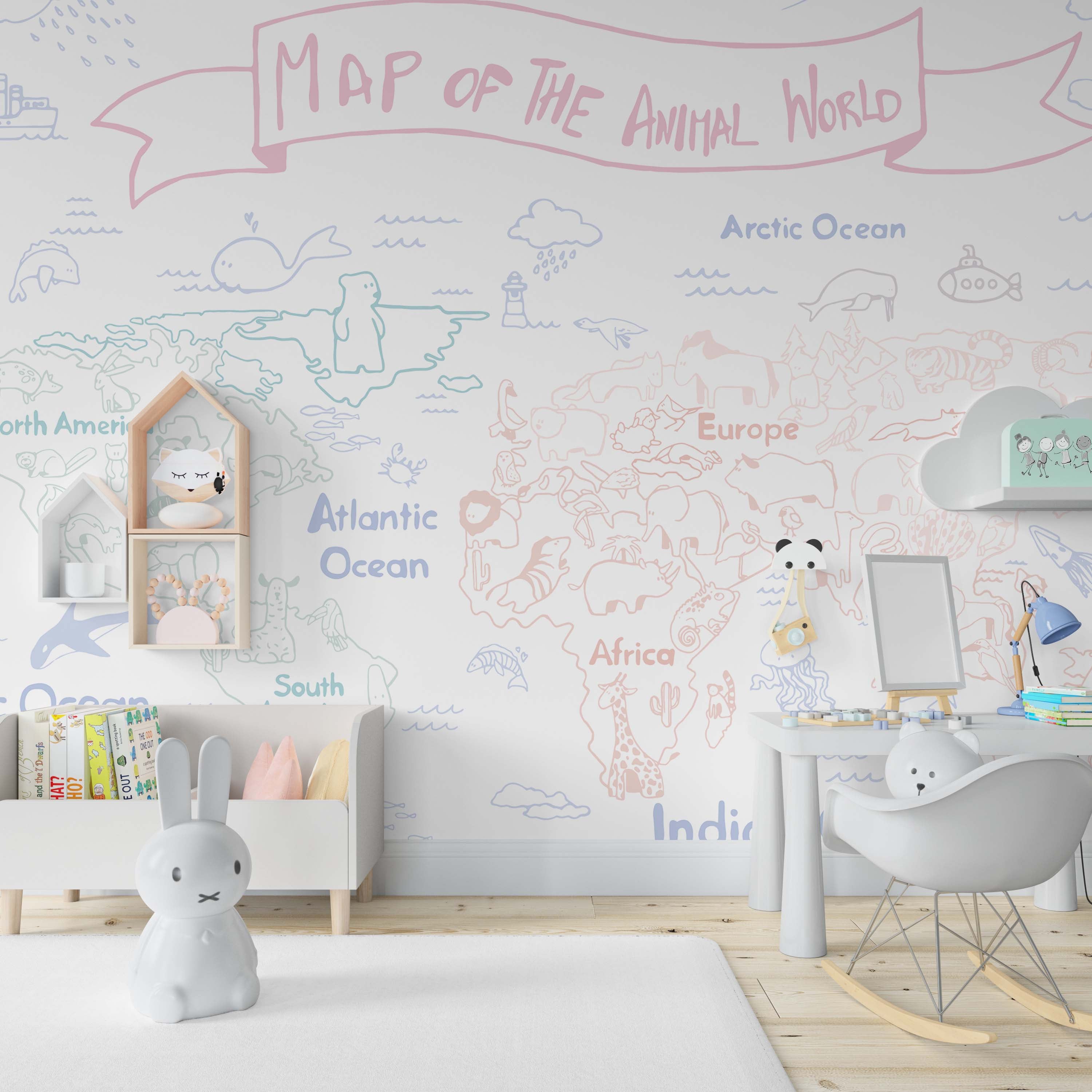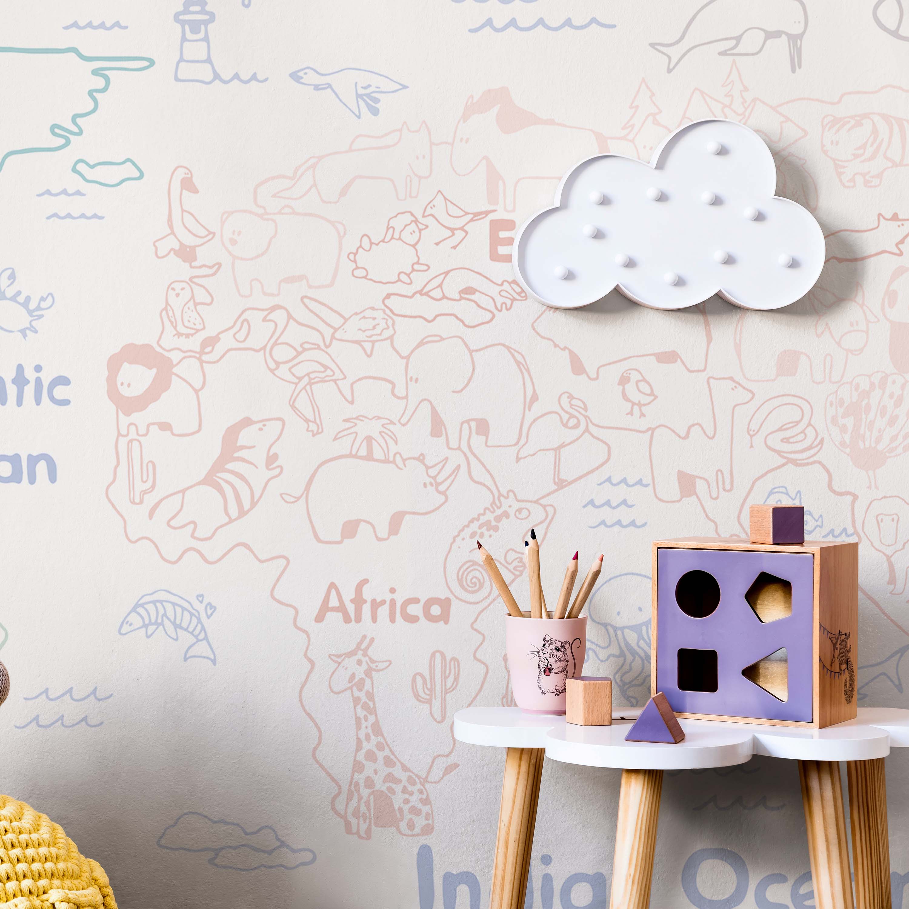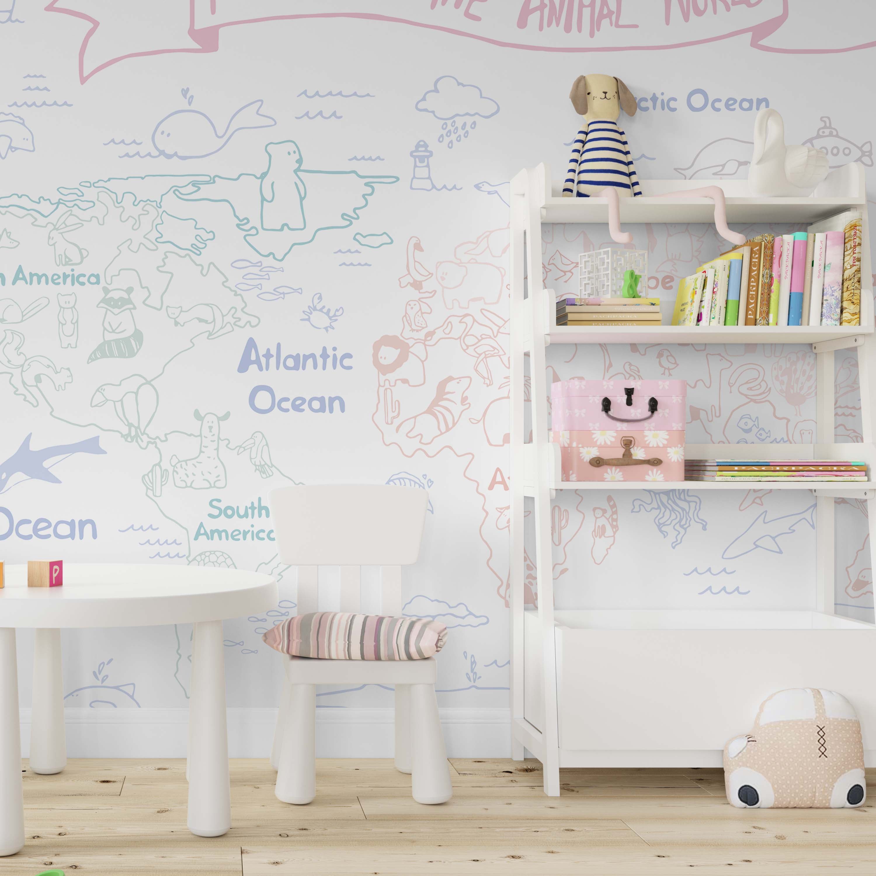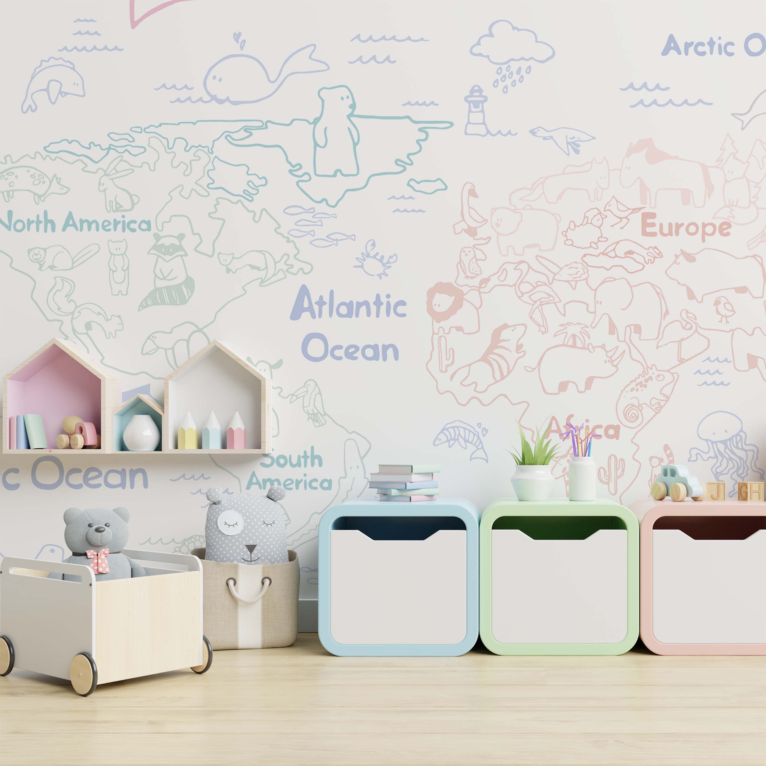Discover our Dream Map Mural Wallpaper—a sophisticated pastel-colored world map featuring charming wildlife illustrations. Perfect for nurseries, children's rooms, or creative spaces, this design combines geography education with whimsical aesthetics. Transform any wall into an inspiring focal point that sparks curiosity and imagination.