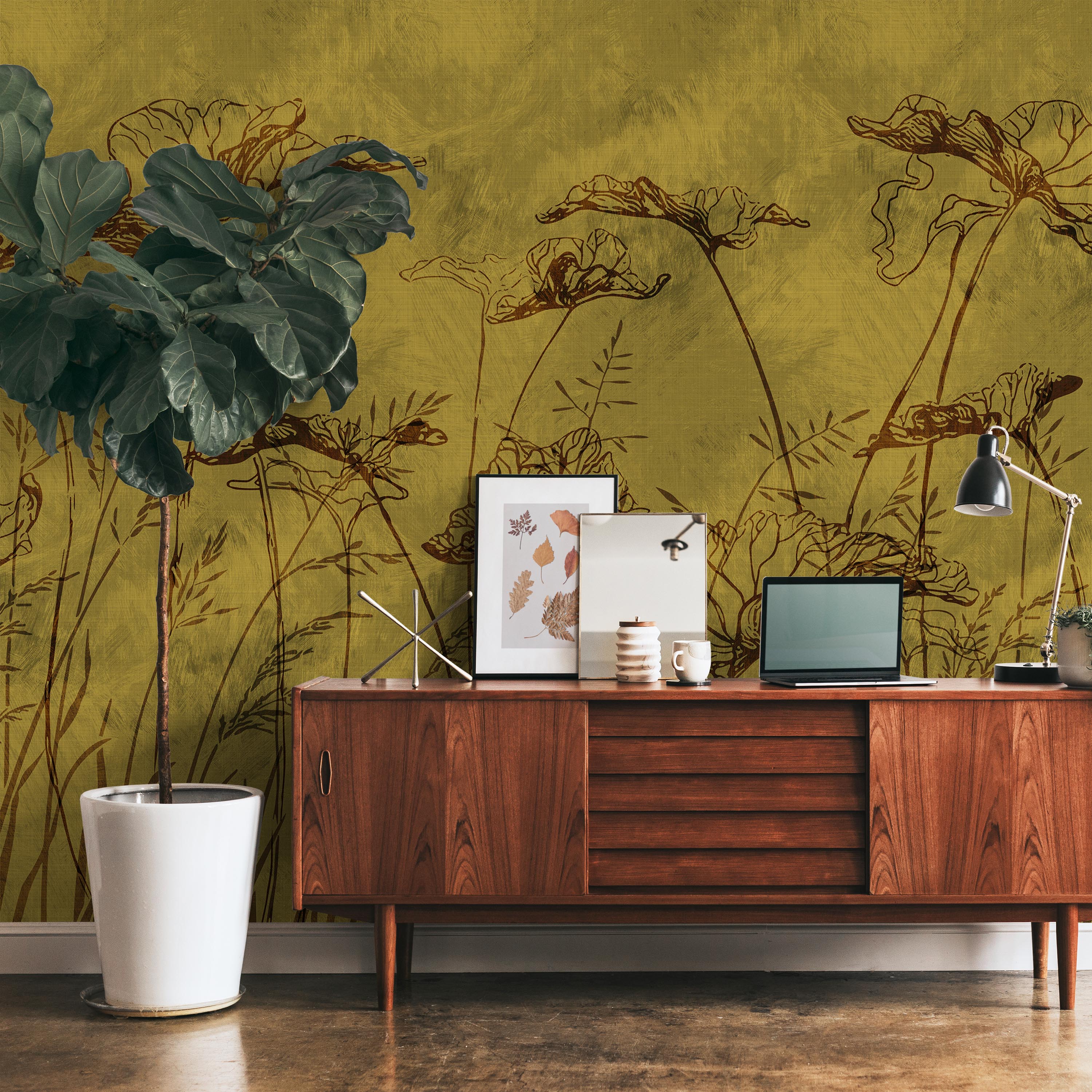 Echoes of Summer Mural Wallpaper features an artistic composition of delicate flowers and grasses rendered against a textured yellow backdrop. This sophisticated design brings warmth and botanical elegance to any interior space.
