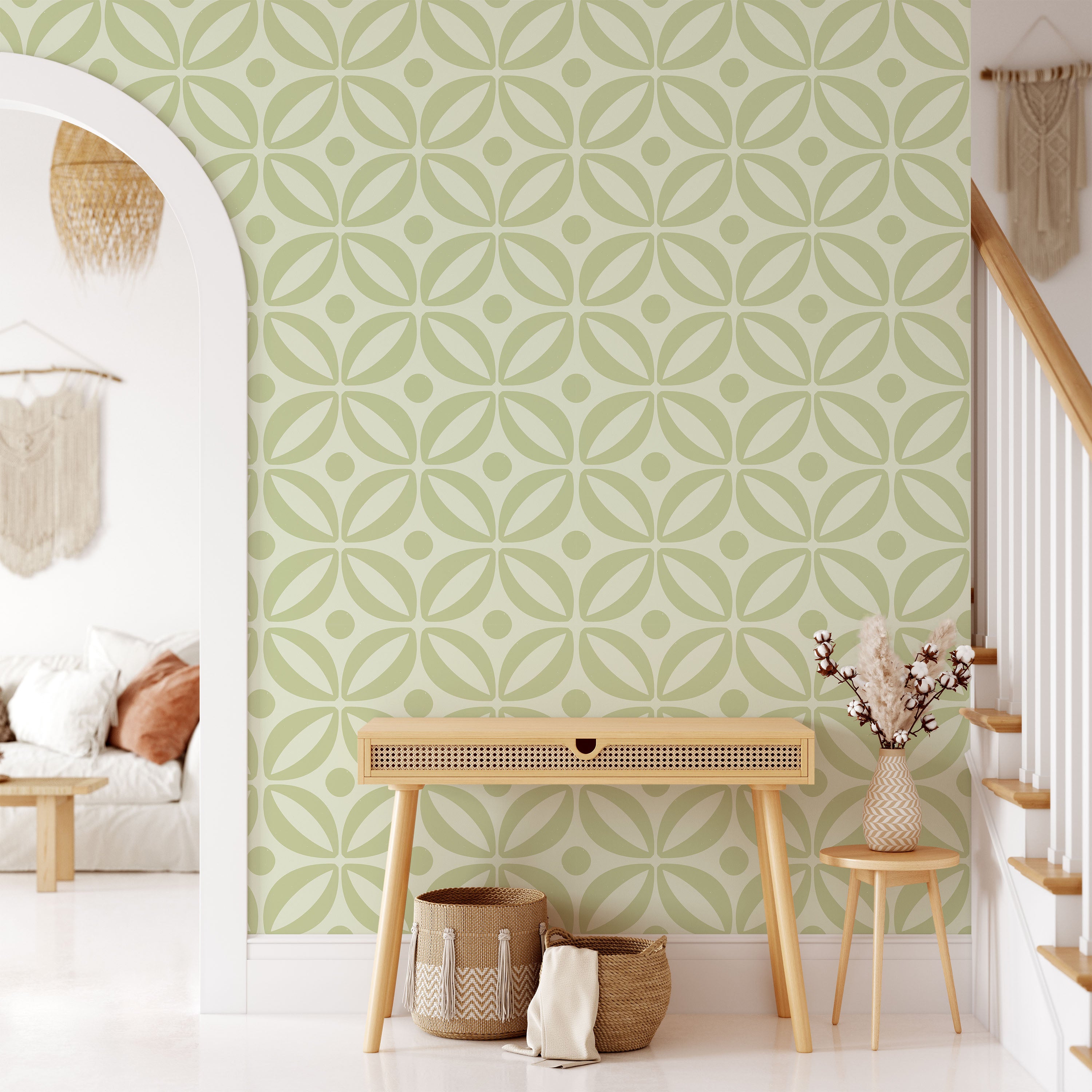 Grid Bloom Wallpaper showcases interlocking geometric forms in sage green against a neutral beige canvas. This refined pattern delivers architectural interest while maintaining visual restraint, making it an excellent choice for spaces requiring sophisticated, contemporary wall treatments.