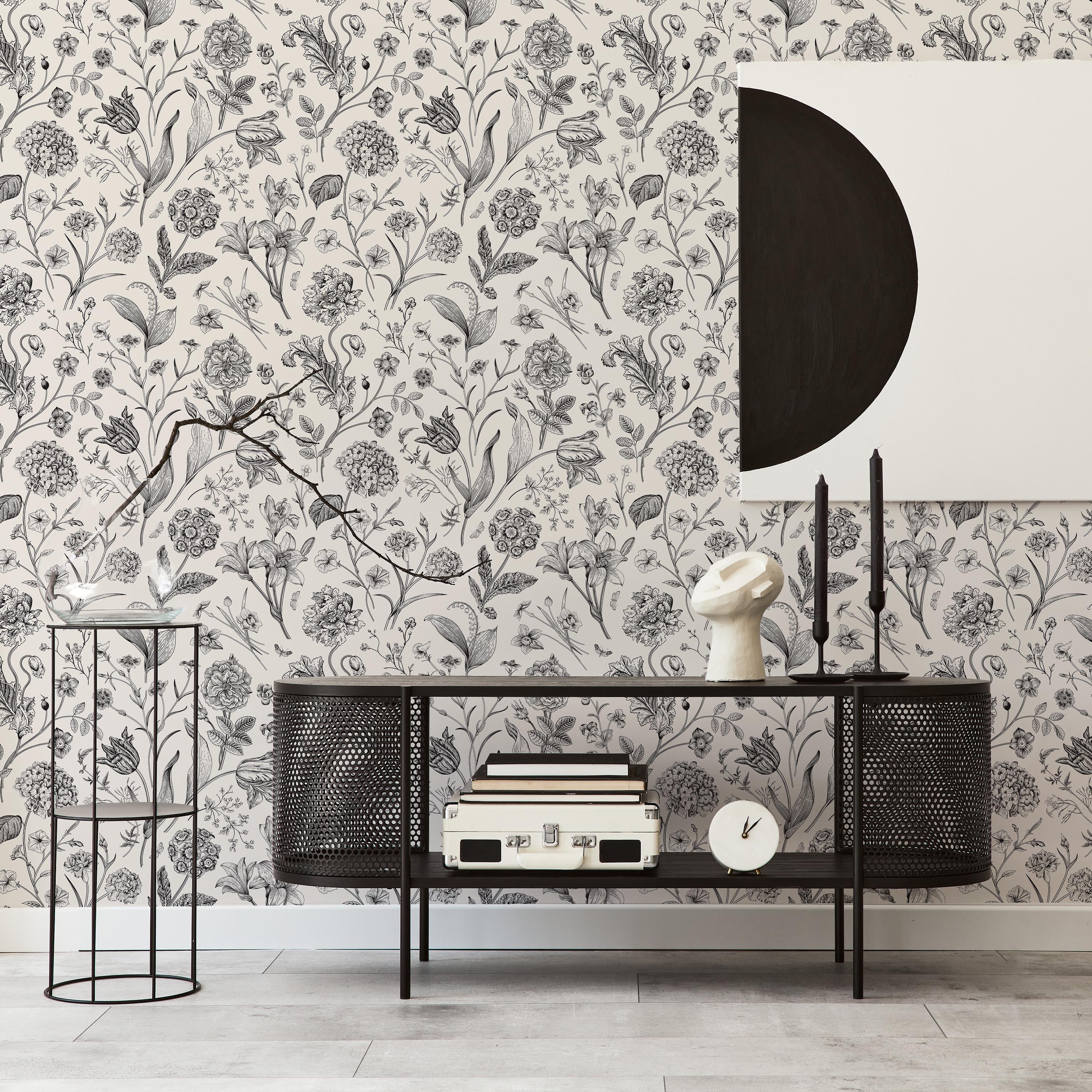 Timeless black and white floral design brings sophisticated elegance to any room. This wallpaper features intricate botanical patterns on a light background, creating visual depth while maintaining a classic aesthetic. Perfect for traditional and contemporary interiors seeking refined, understated beauty.