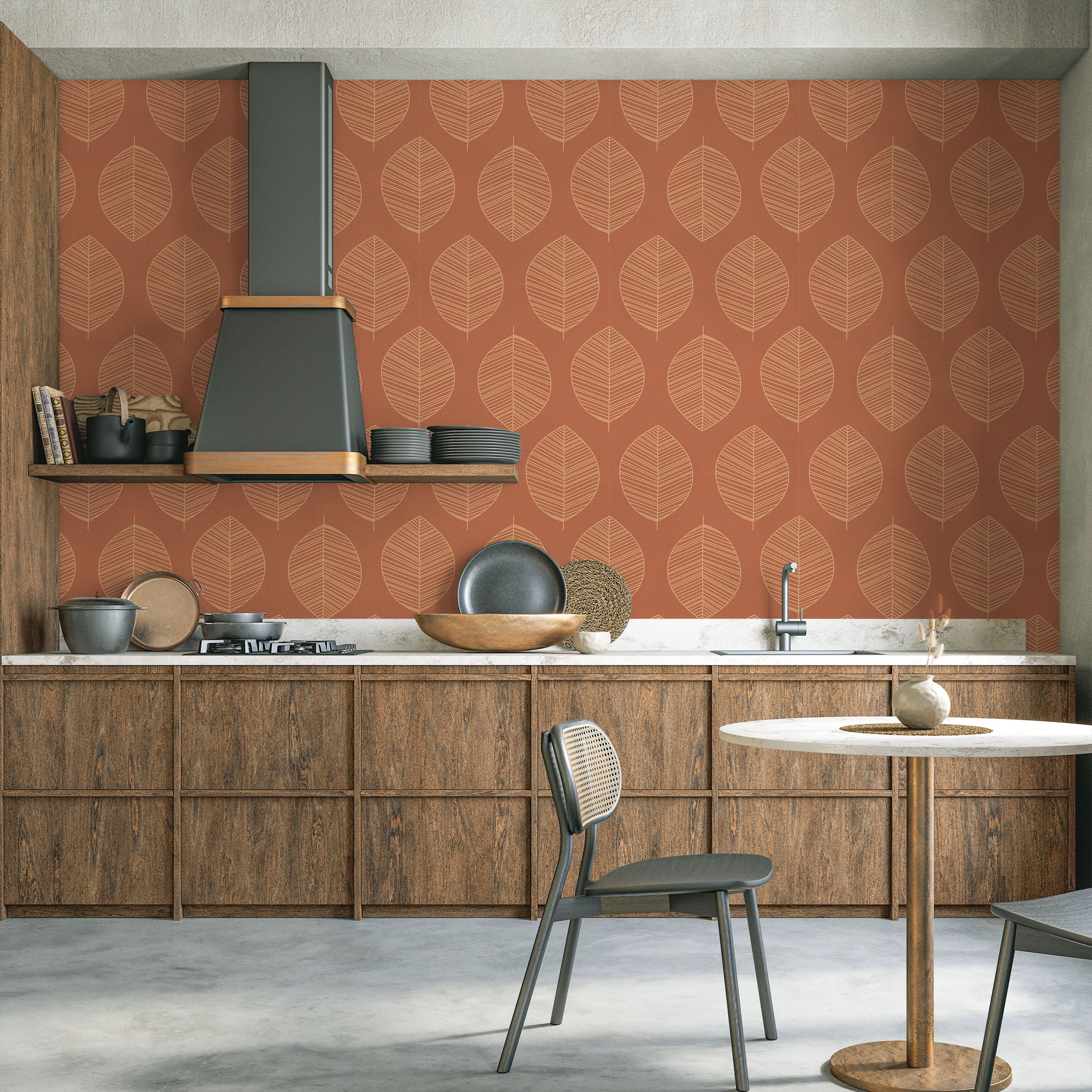 Botanical leaf pattern wallpaper with refined foliage silhouettes rendered on a rich brown ground. The dimensional leaf composition delivers understated sophistication, enhancing residential and commercial interiors with organic visual interest and timeless appeal.