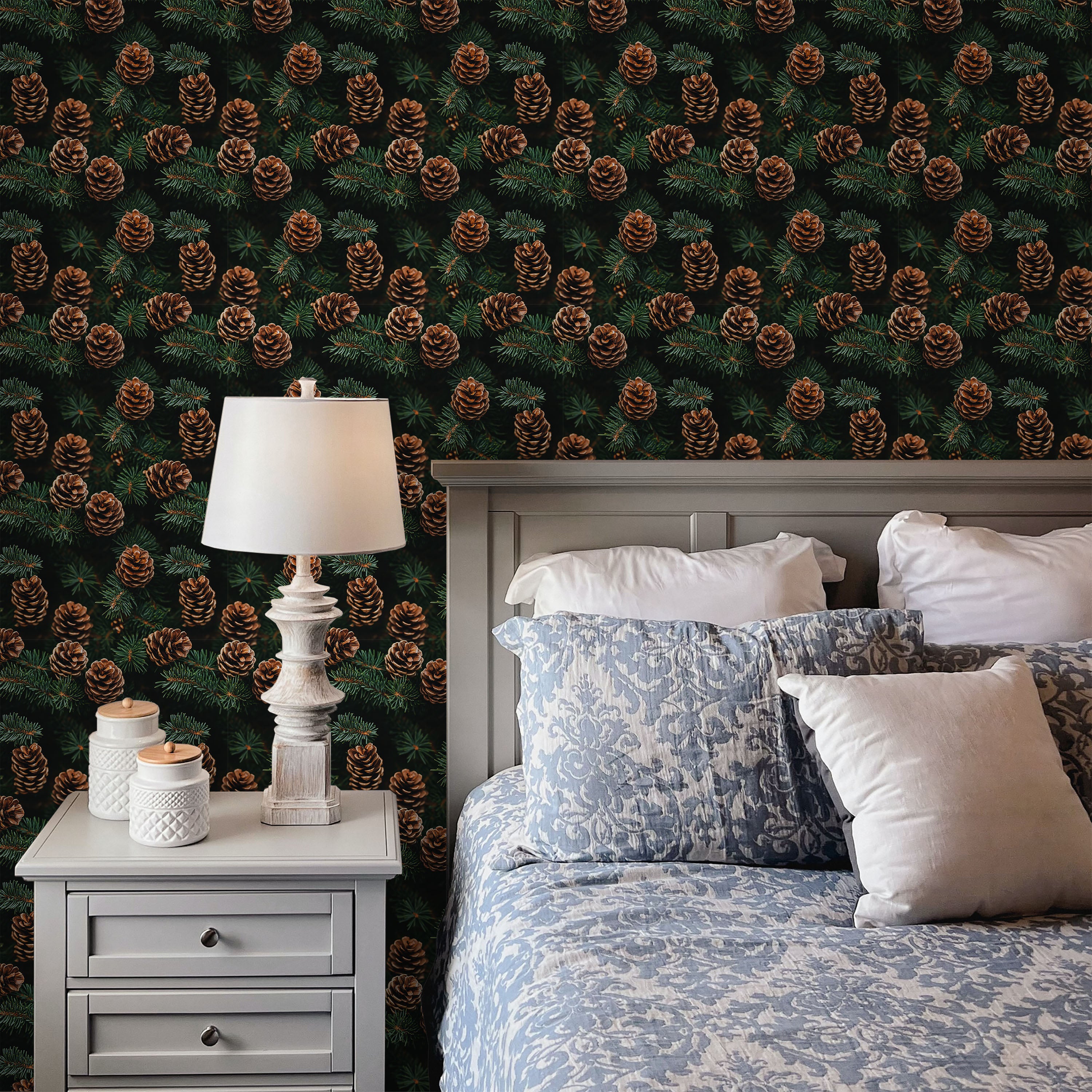 Lush Pines Wallpaper features an intricate pattern of pine cones and delicate branches set against a rich, dark background. This sophisticated design brings natural woodland elegance to any room, creating depth and visual interest while maintaining a refined aesthetic.