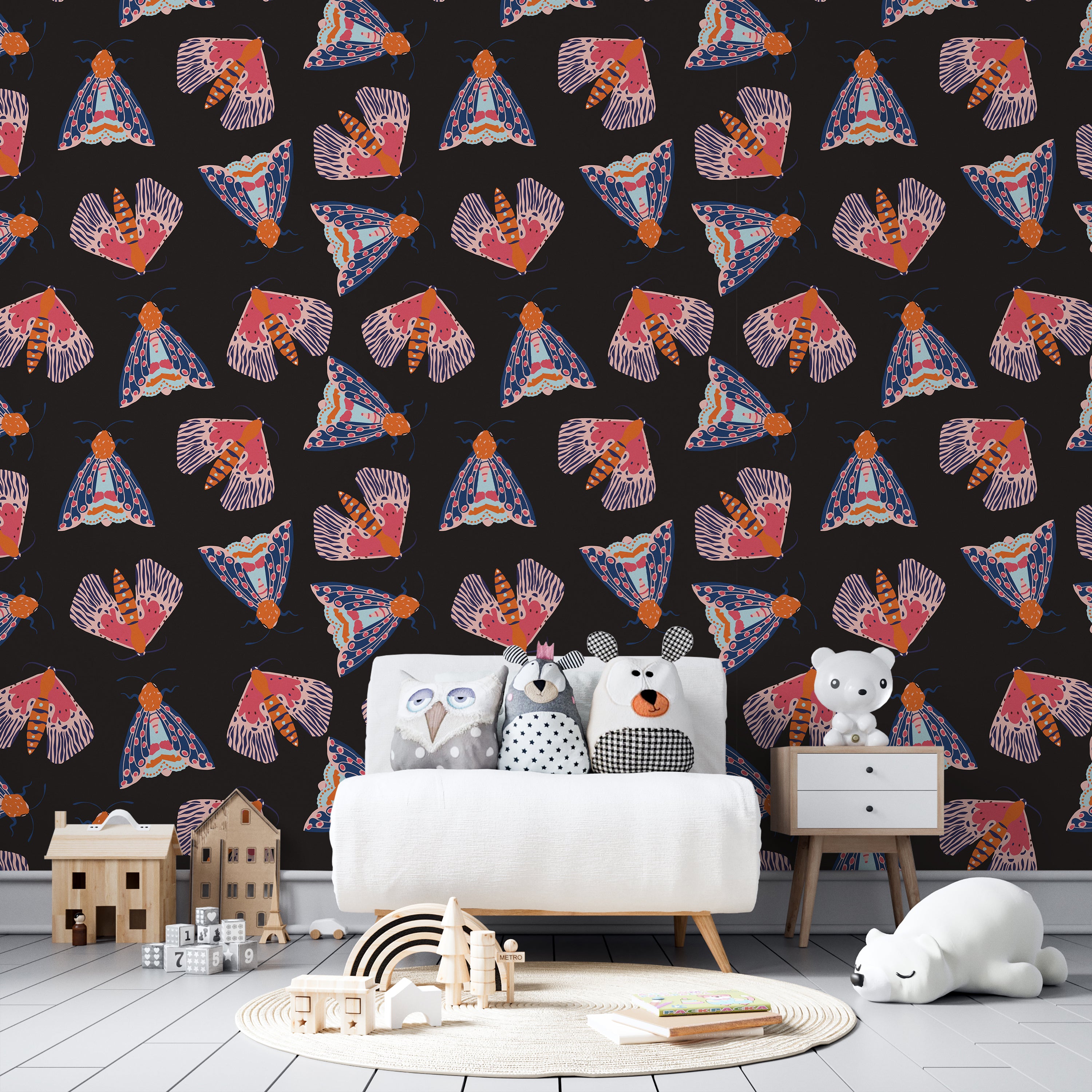 Striking wallpaper featuring an intricate moth pattern rendered in vibrant hues against a deep black backdrop. The design combines naturalistic detail with bold color contrasts, creating visual depth and contemporary appeal. Ideal for accent walls or spaces seeking sophisticated botanical-inspired décor.