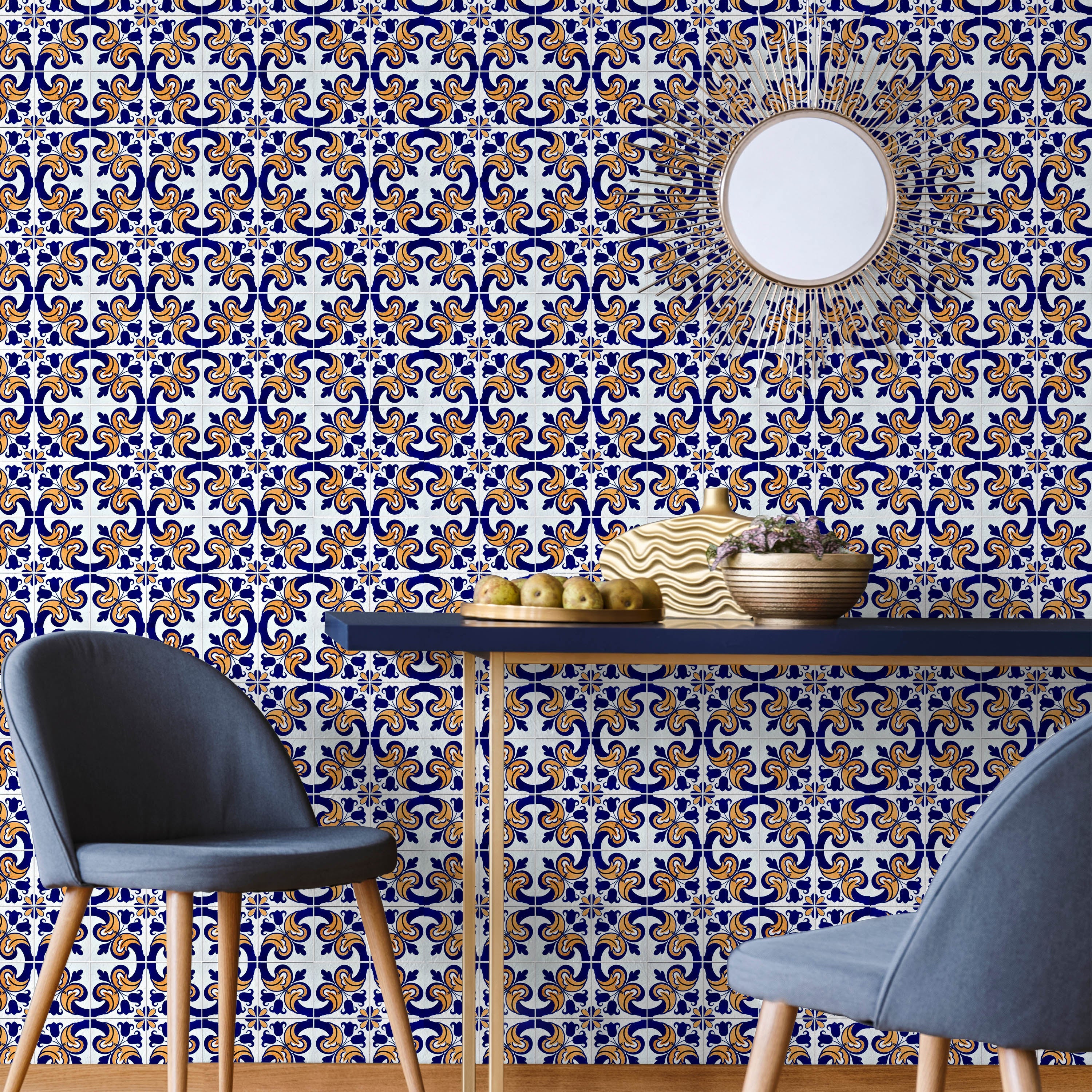 Seville Wallpaper features a sophisticated geometric pattern combining vibrant blue and orange tiles with intricate detailing against a crisp white backdrop. This design brings Mediterranean-inspired elegance to any interior space.