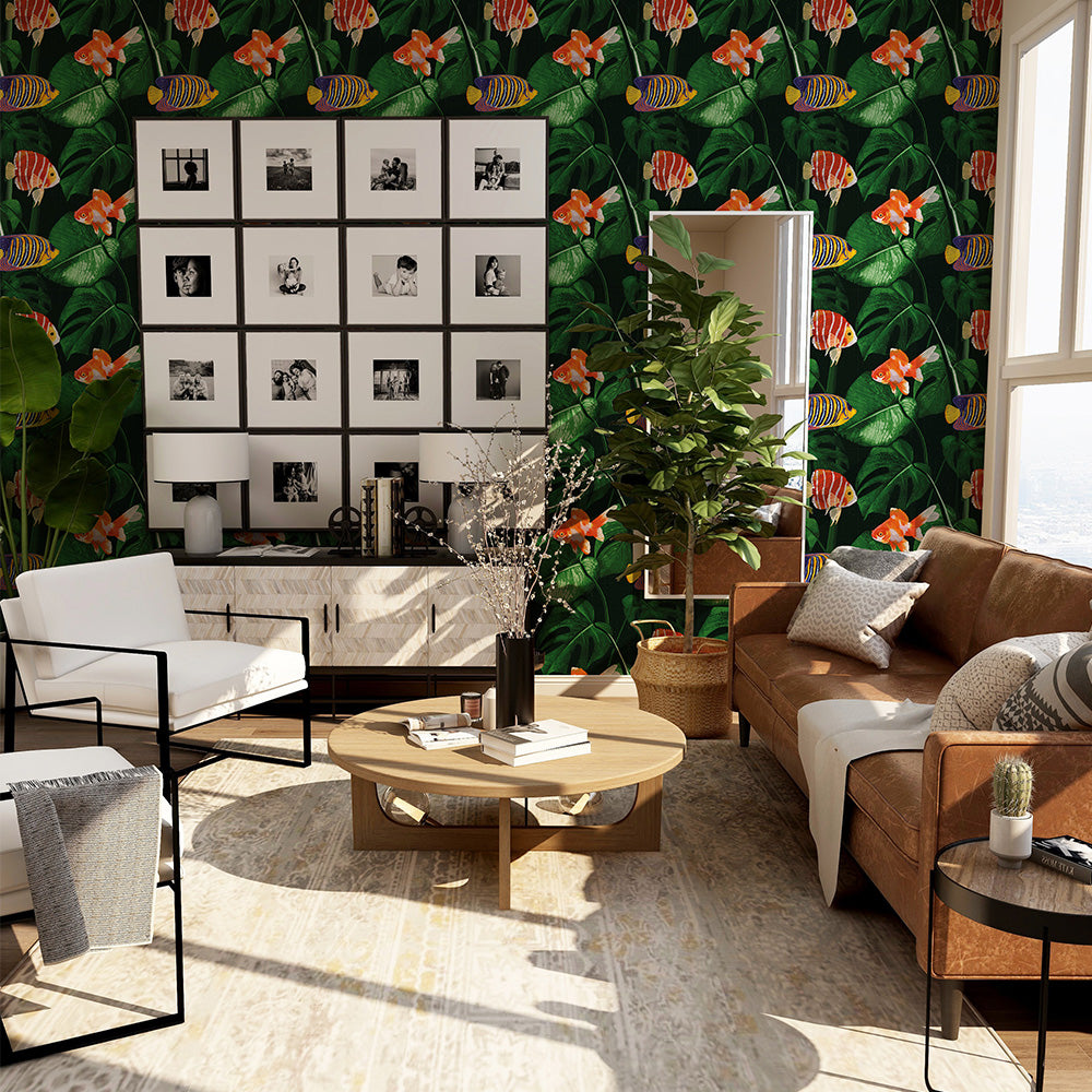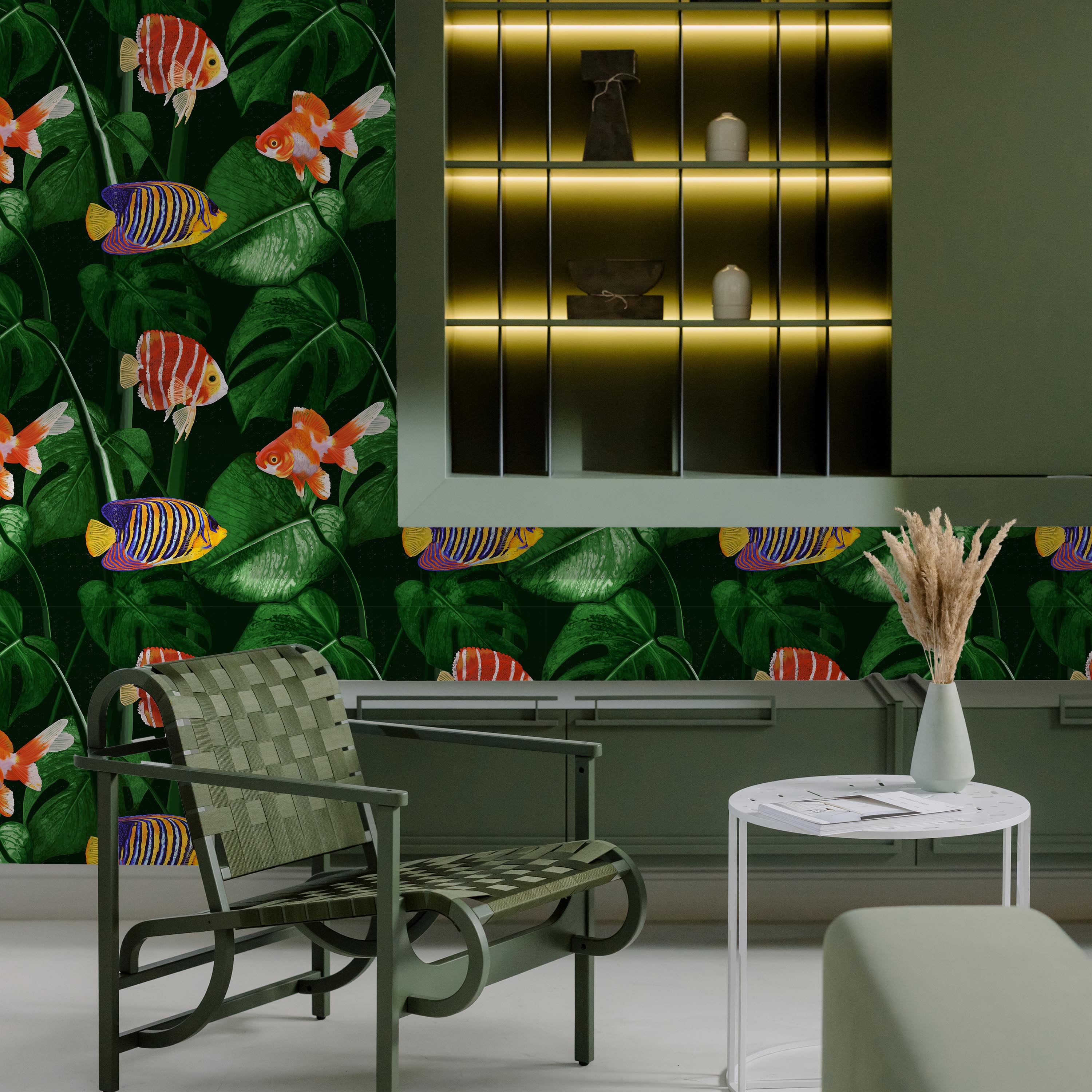 Vibrant tropical fish swim among lush foliage against a striking dark backdrop. This wallpaper brings aquatic elegance and botanical richness to any room, creating a sophisticated focal point that balances bold color with refined design. Perfect for adding depth and visual interest to modern interiors.