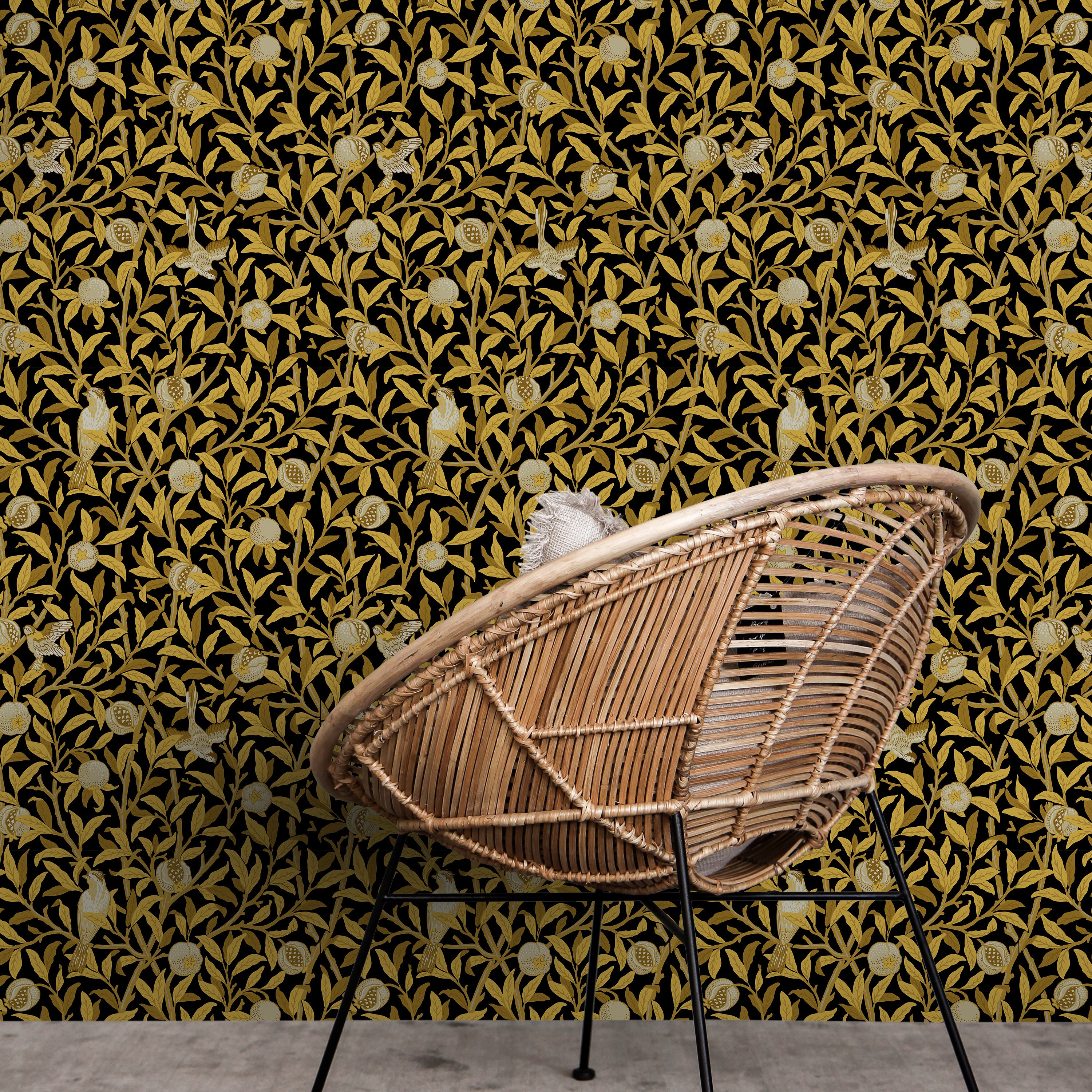 Inspired by William Morris's iconic design, this wallpaper features an elegant pomegranate and bird motif rendered in lustrous gold leaf against a deep black ground. A timeless pattern that brings sophisticated botanical artistry to any interior.