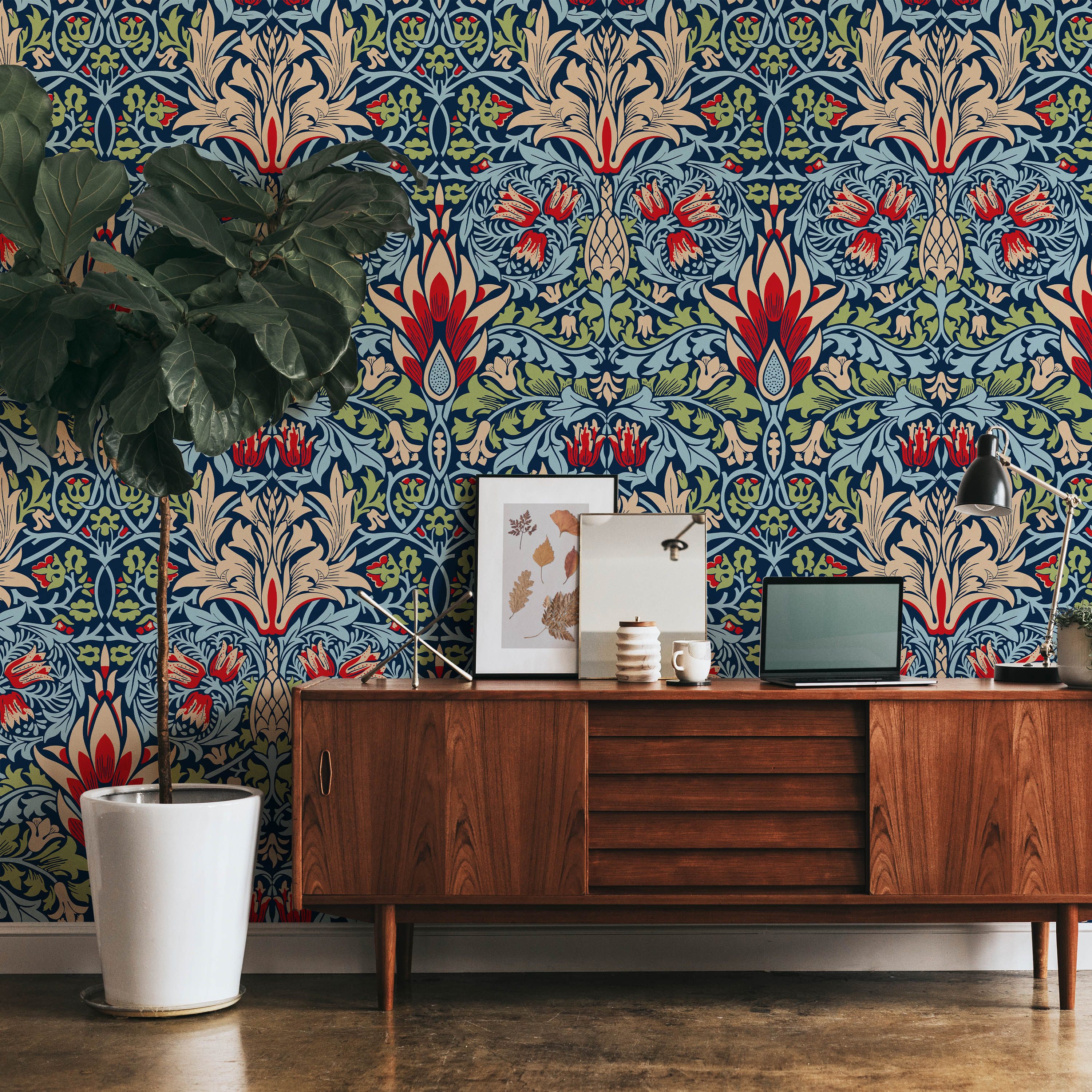 Inspired by William Morris design principles, this striking wallpaper features an intricate floral pattern in rich reds, warm beiges, and forest greens set against a sophisticated blue backdrop. Perfect for creating a refined, nature-inspired aesthetic in any room.