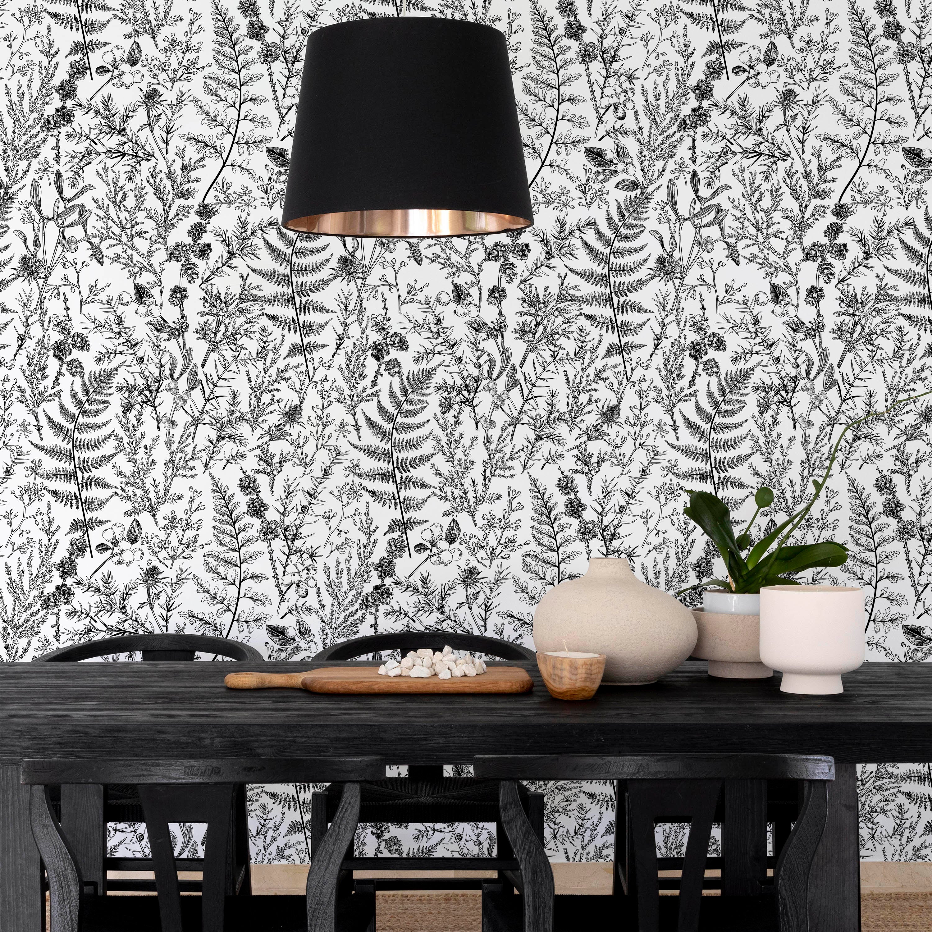 Forest Dream Wallpaper features an intricate black and white botanical pattern showcasing diverse plants and leaves against a clean white backdrop. This sophisticated design brings natural elegance to any space while maintaining timeless appeal through its monochromatic palette.