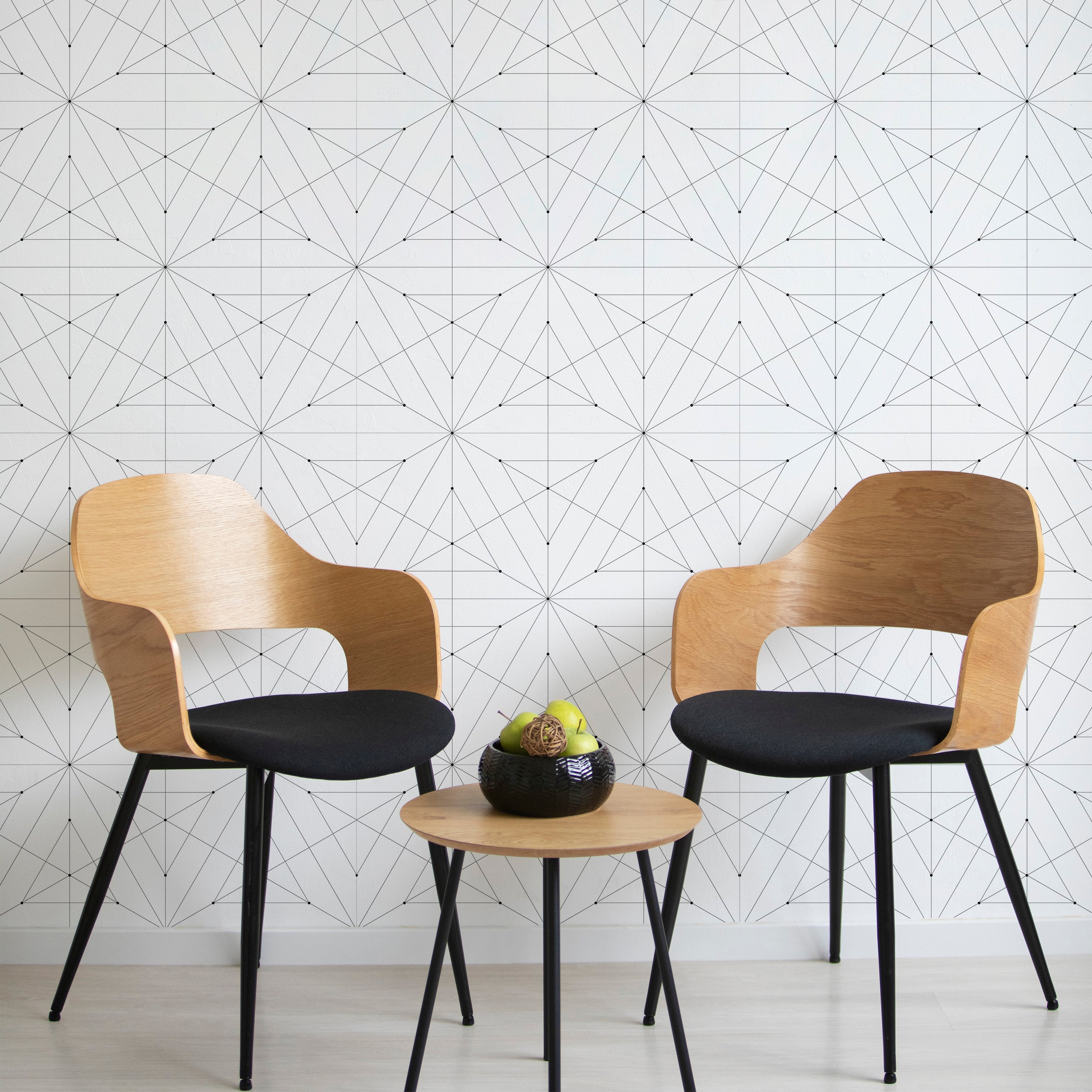 Prismatic Grid Wallpaper features a sophisticated geometric composition of black lines and triangles arranged across a clean white background. This contemporary design brings architectural precision and visual depth to any space, ideal for modern interiors seeking understated elegance.