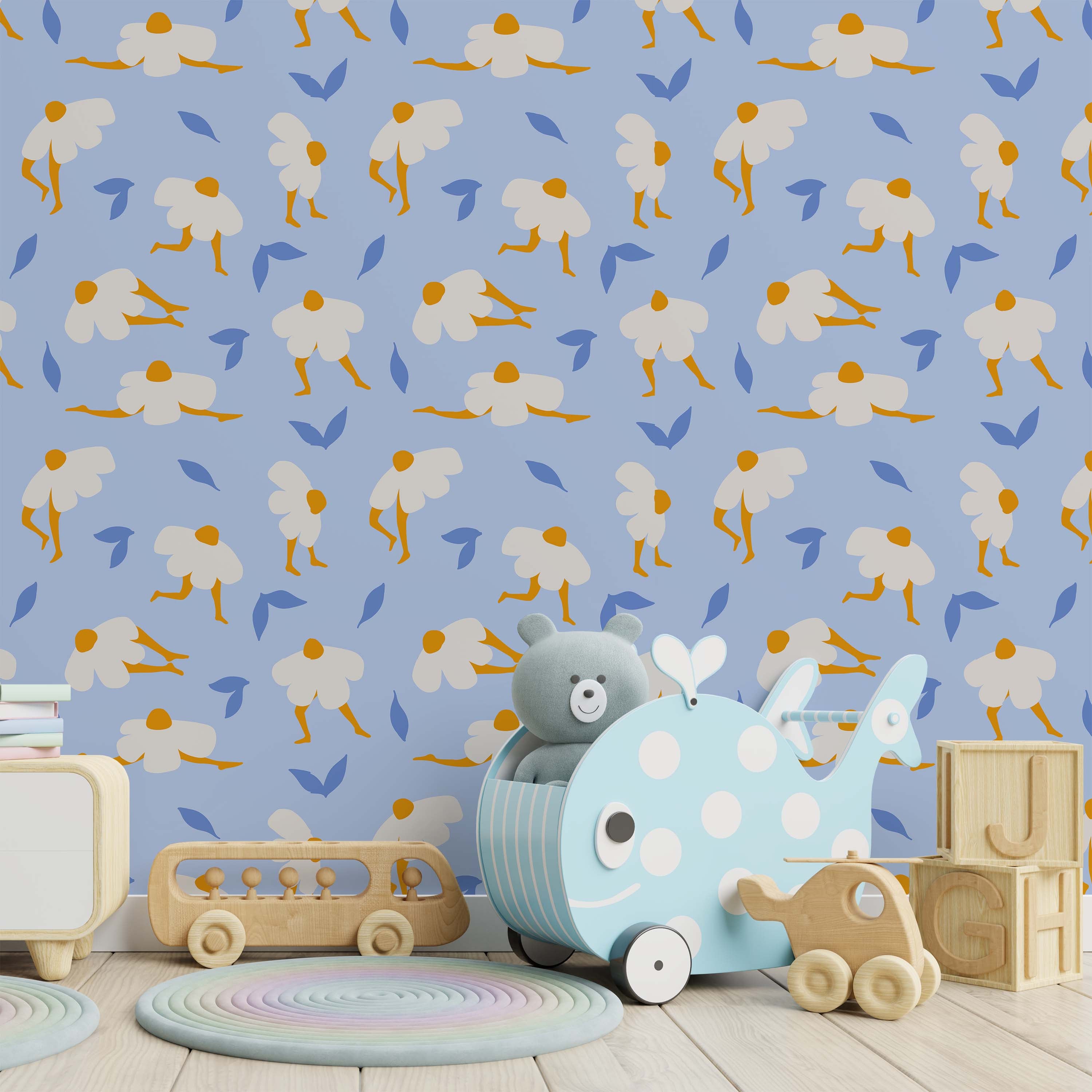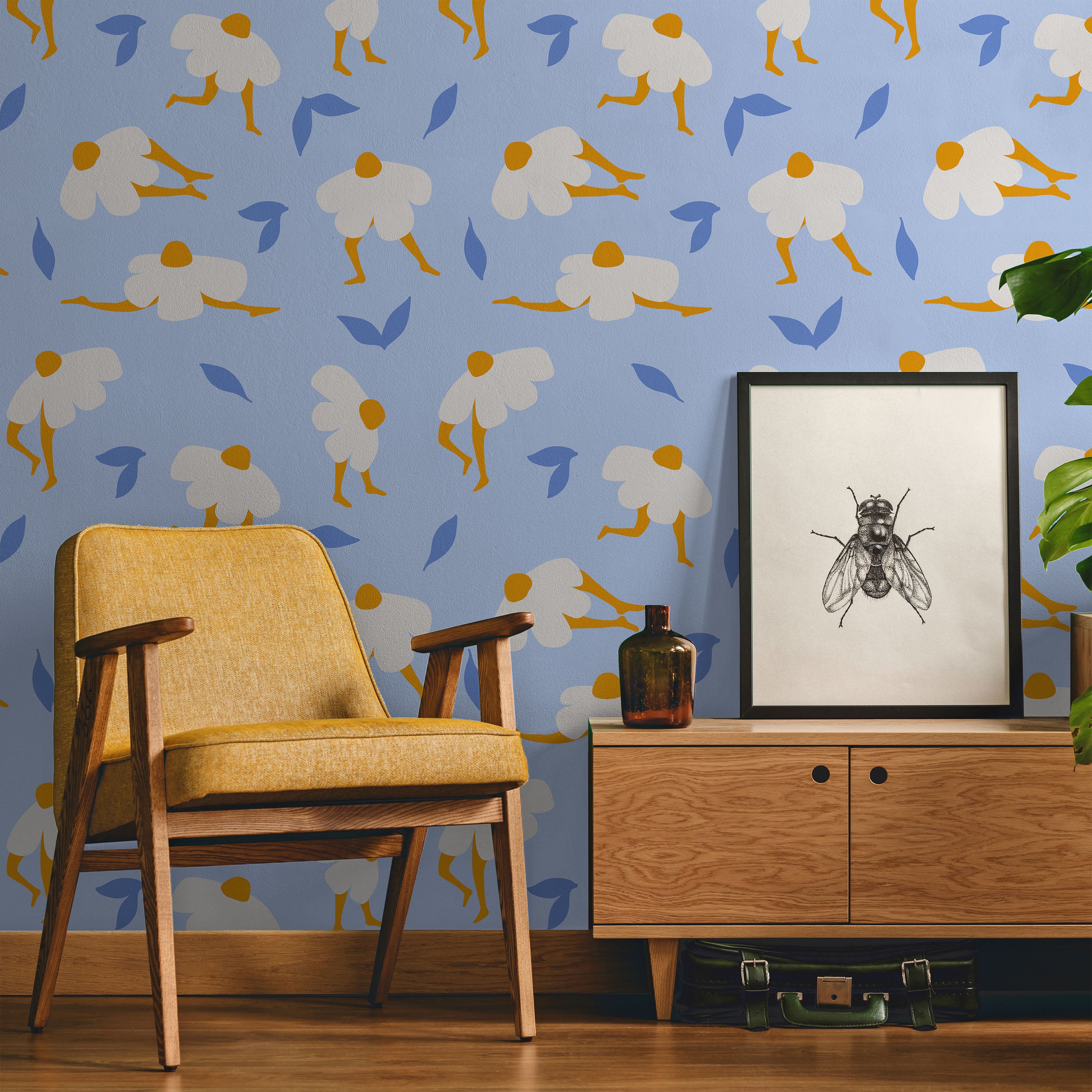 Contemporary wallpaper presenting an artfully rendered composition of kinetic floral forms in motion against a calming blue field. Delivers botanical elegance with dynamic visual rhythm, ideal for discerning interior design applications.