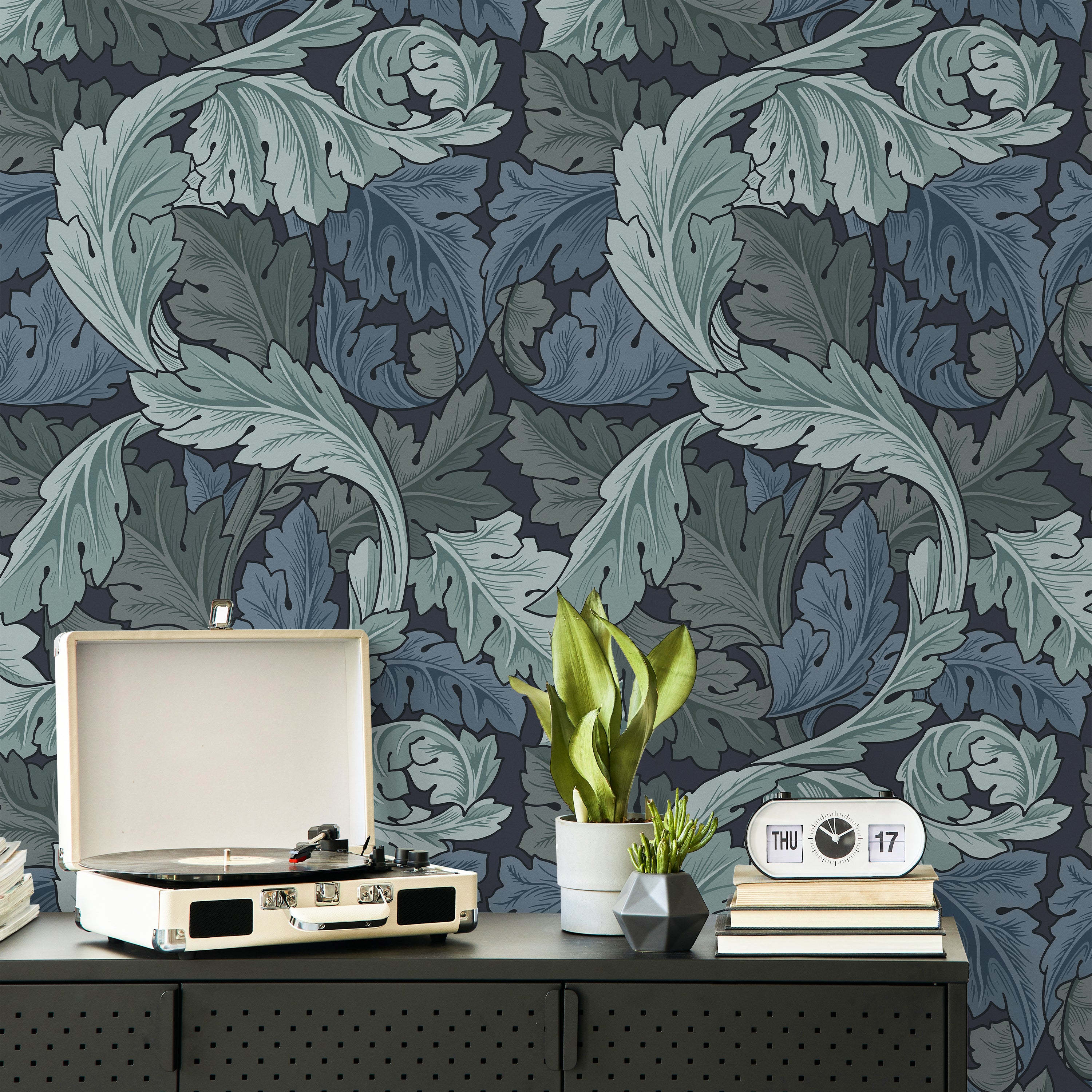 Inspired by William Morris's iconic botanical designs, this wallpaper features elegant acanthus leaves in rich blue tones against a sophisticated dark backdrop. Perfect for creating a refined, nature-inspired atmosphere in any room.
