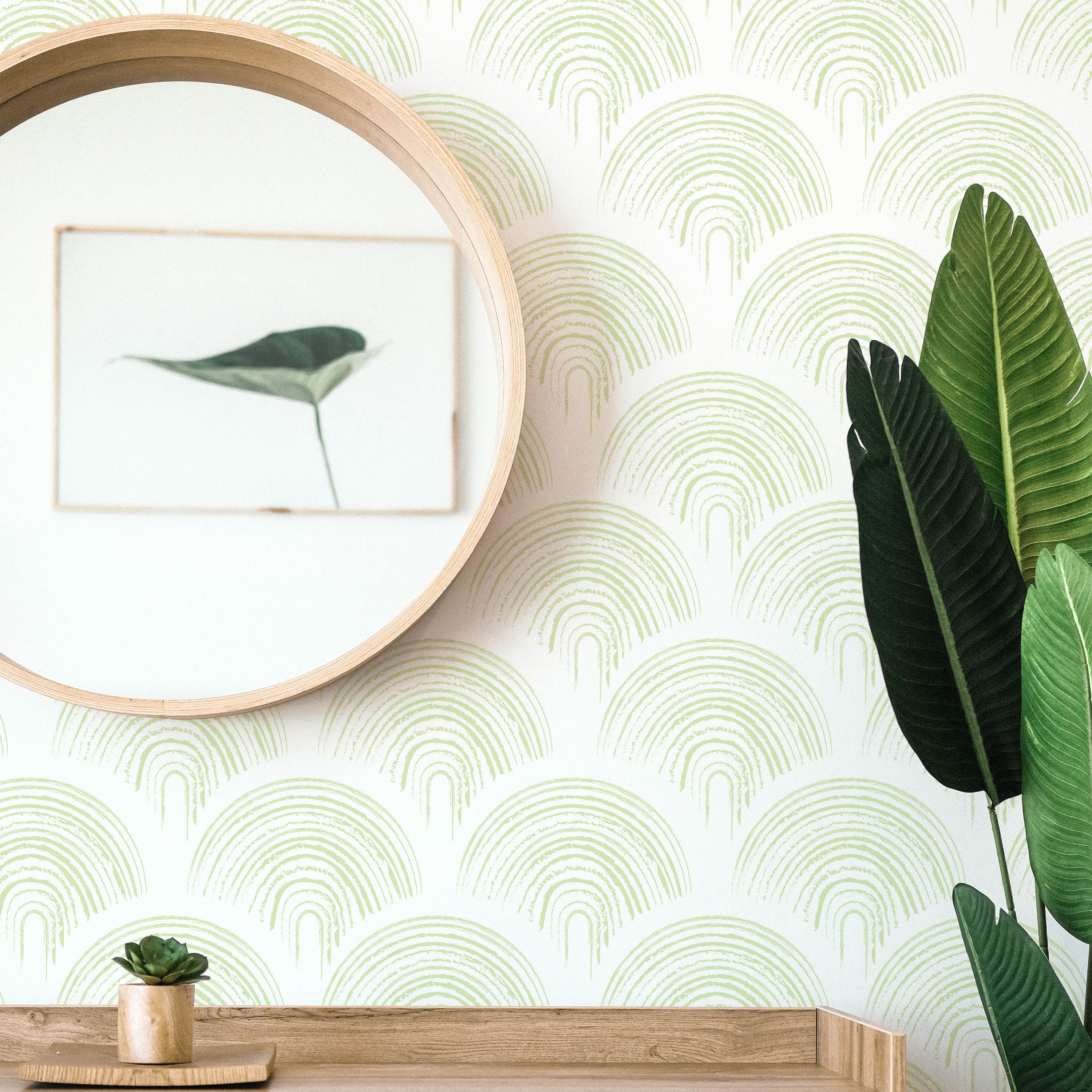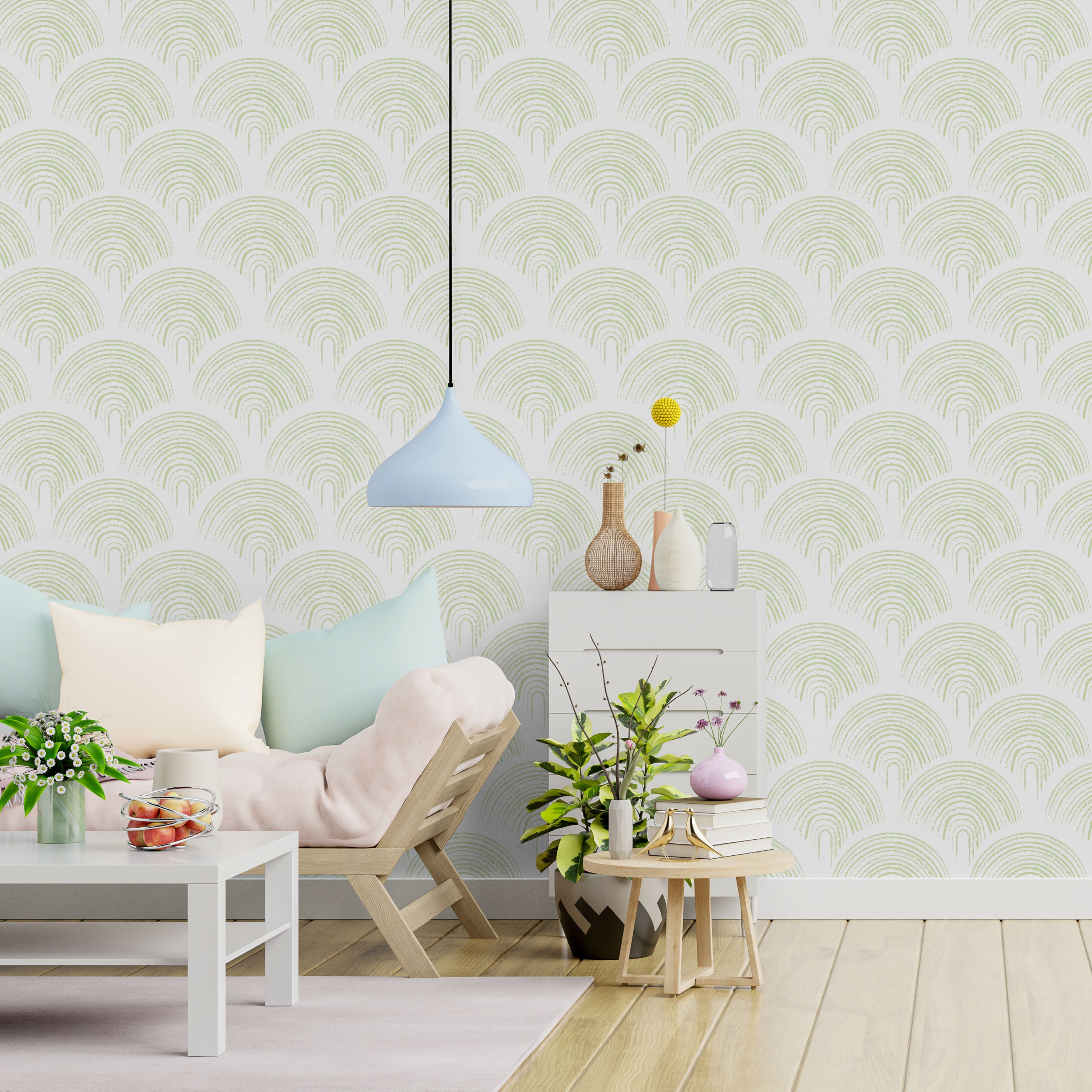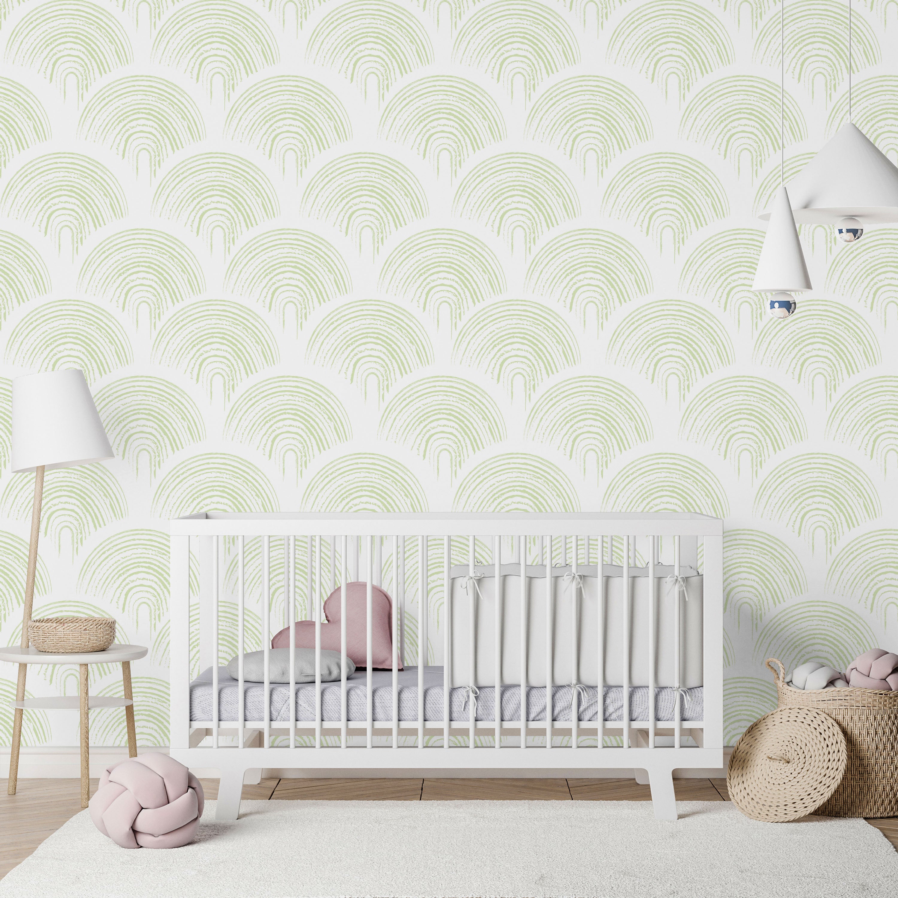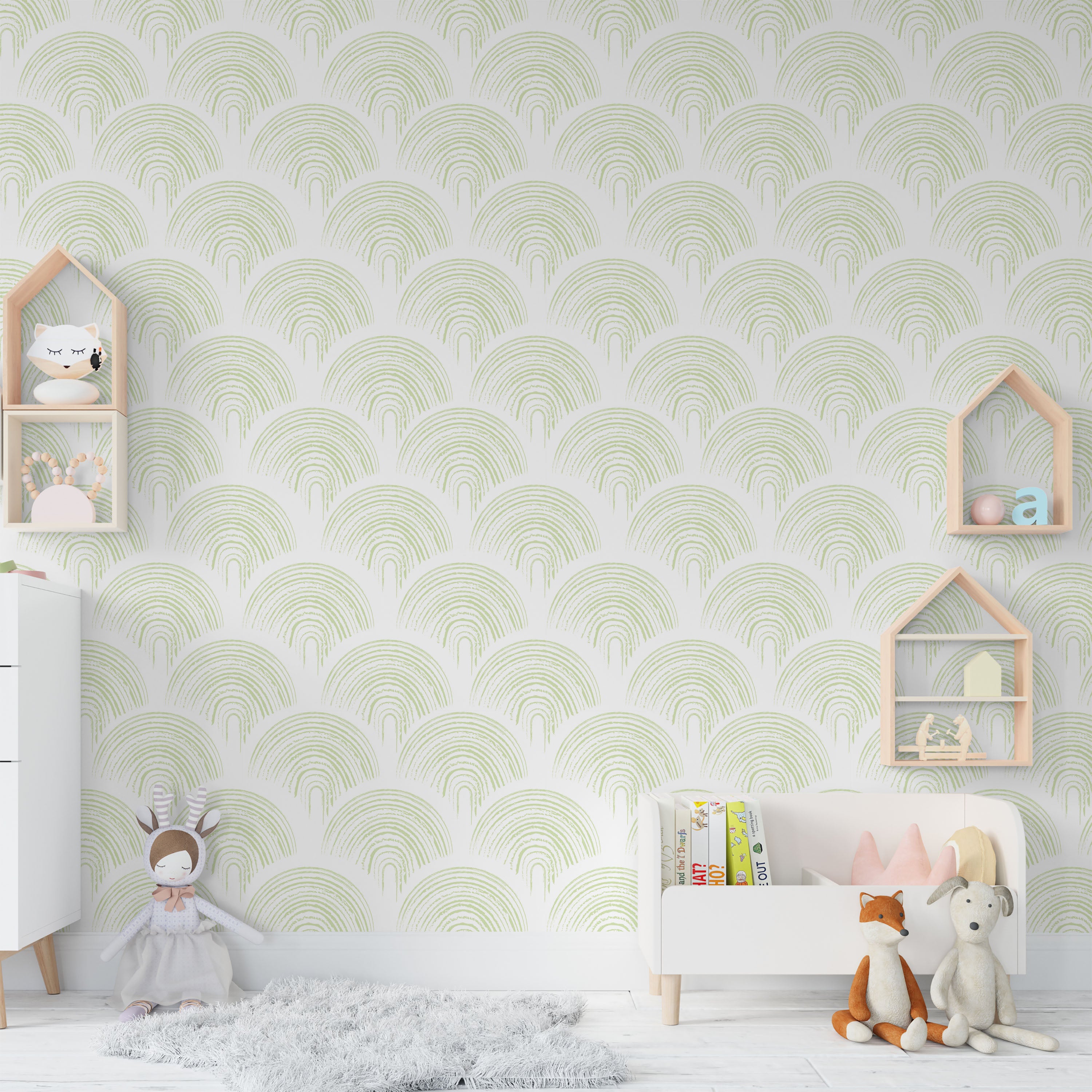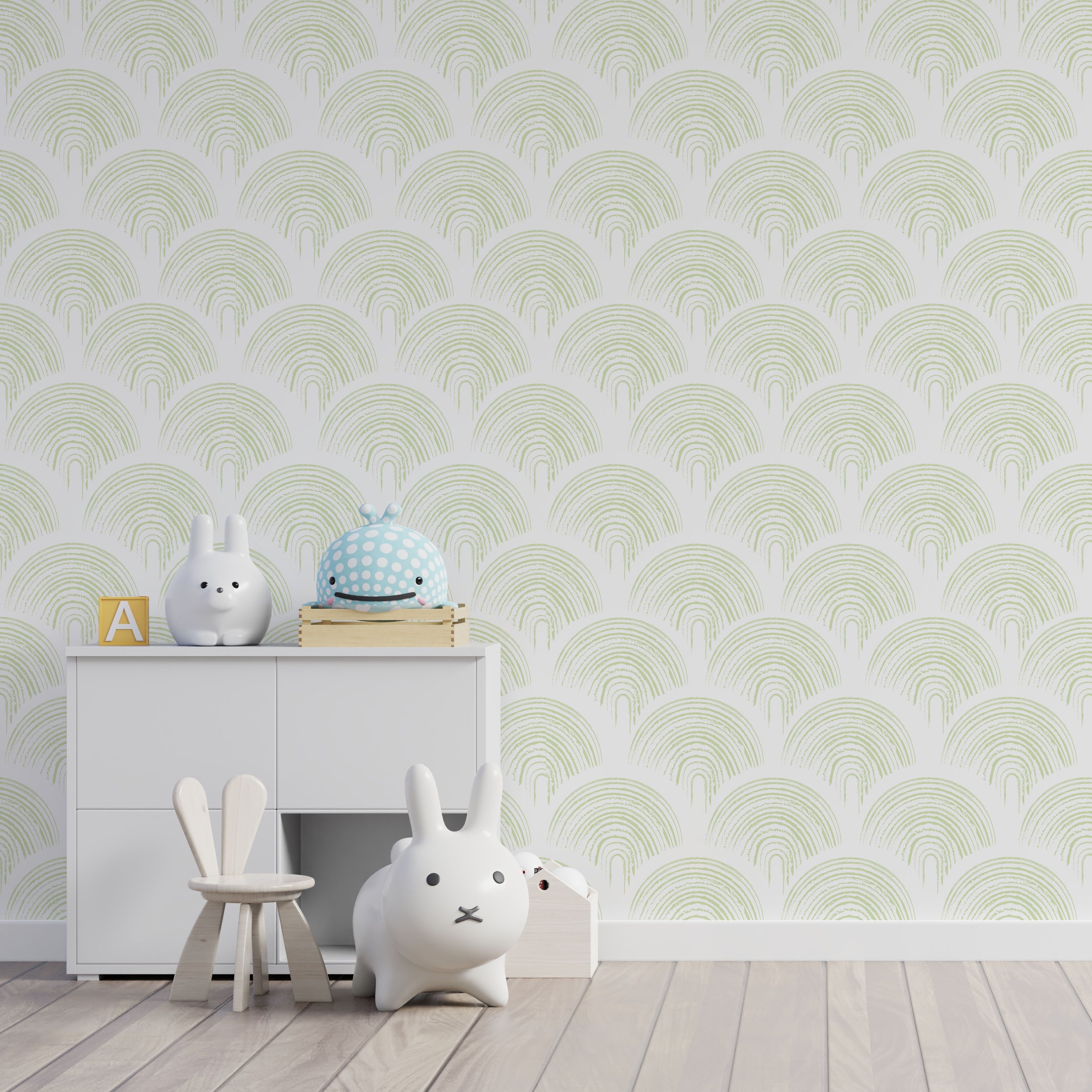 Refined wallpaper featuring soft green arches arranged across a clean white surface. This geometric design brings understated sophistication to playrooms and nurseries, creating a tranquil backdrop that encourages focus and creativity without visual clutter.