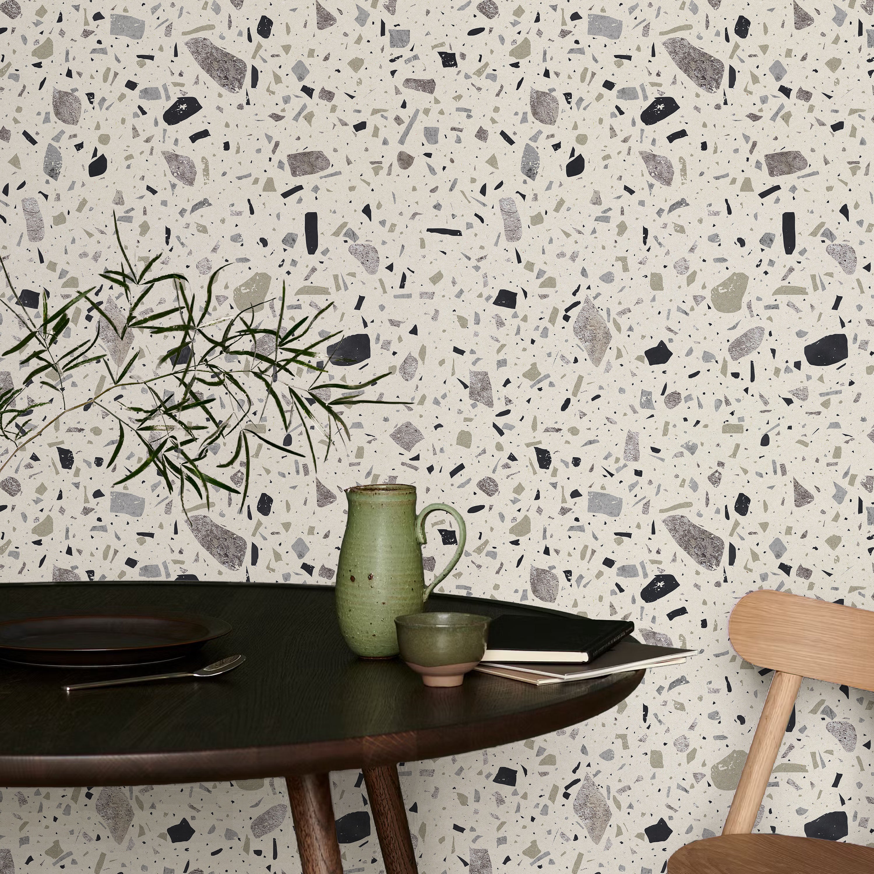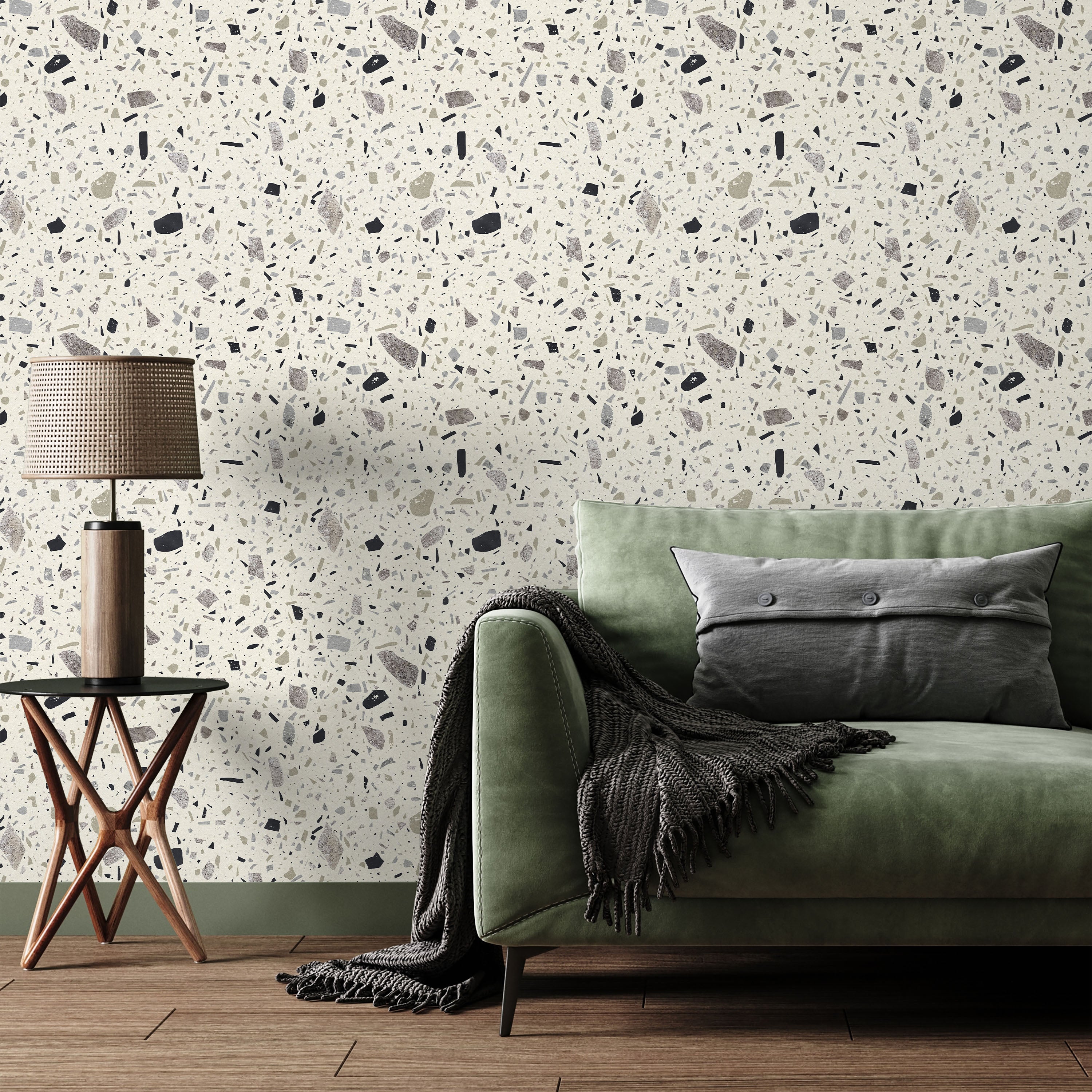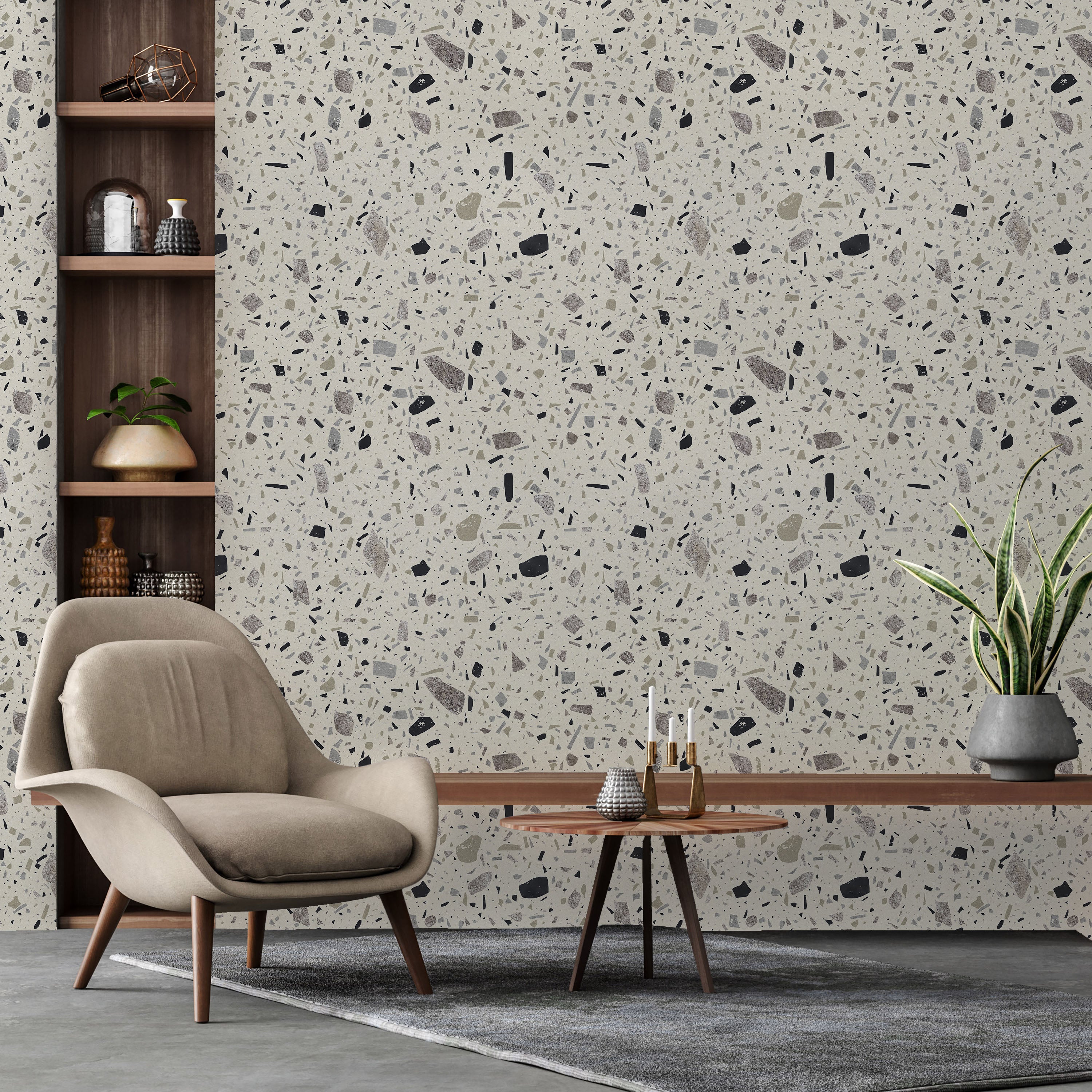 Sophisticated terrazzo wallpaper featuring authentic beige and multicolored textured chips scattered across a pristine white base. This contemporary design brings dimensional elegance and timeless appeal to any interior space.