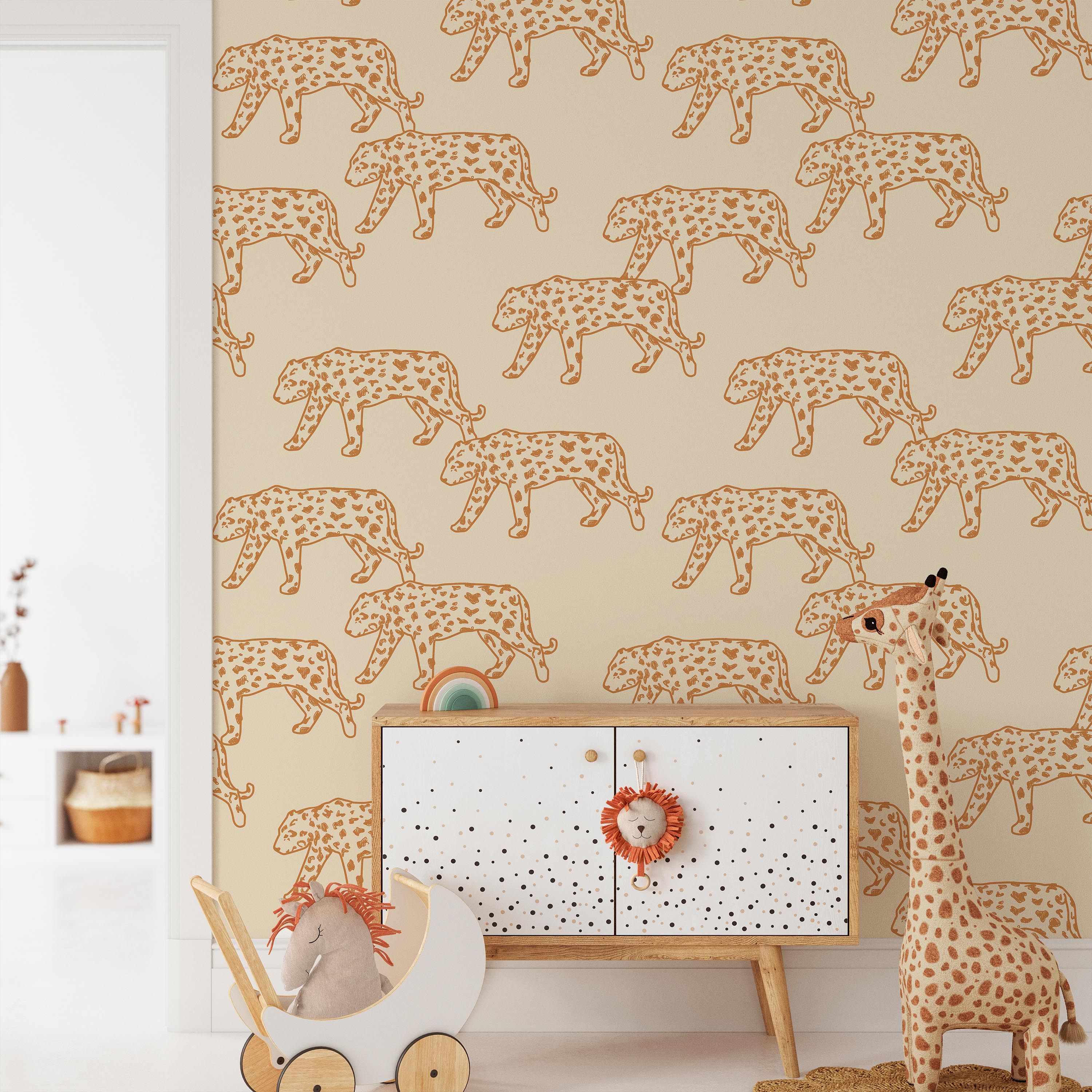 Royal Leopard Wallpaper features a sophisticated leopard spot pattern rendered in rich tones against a warm beige backdrop. This timeless design brings refined elegance to any interior space, offering a bold yet balanced aesthetic that complements both contemporary and classic décor schemes.