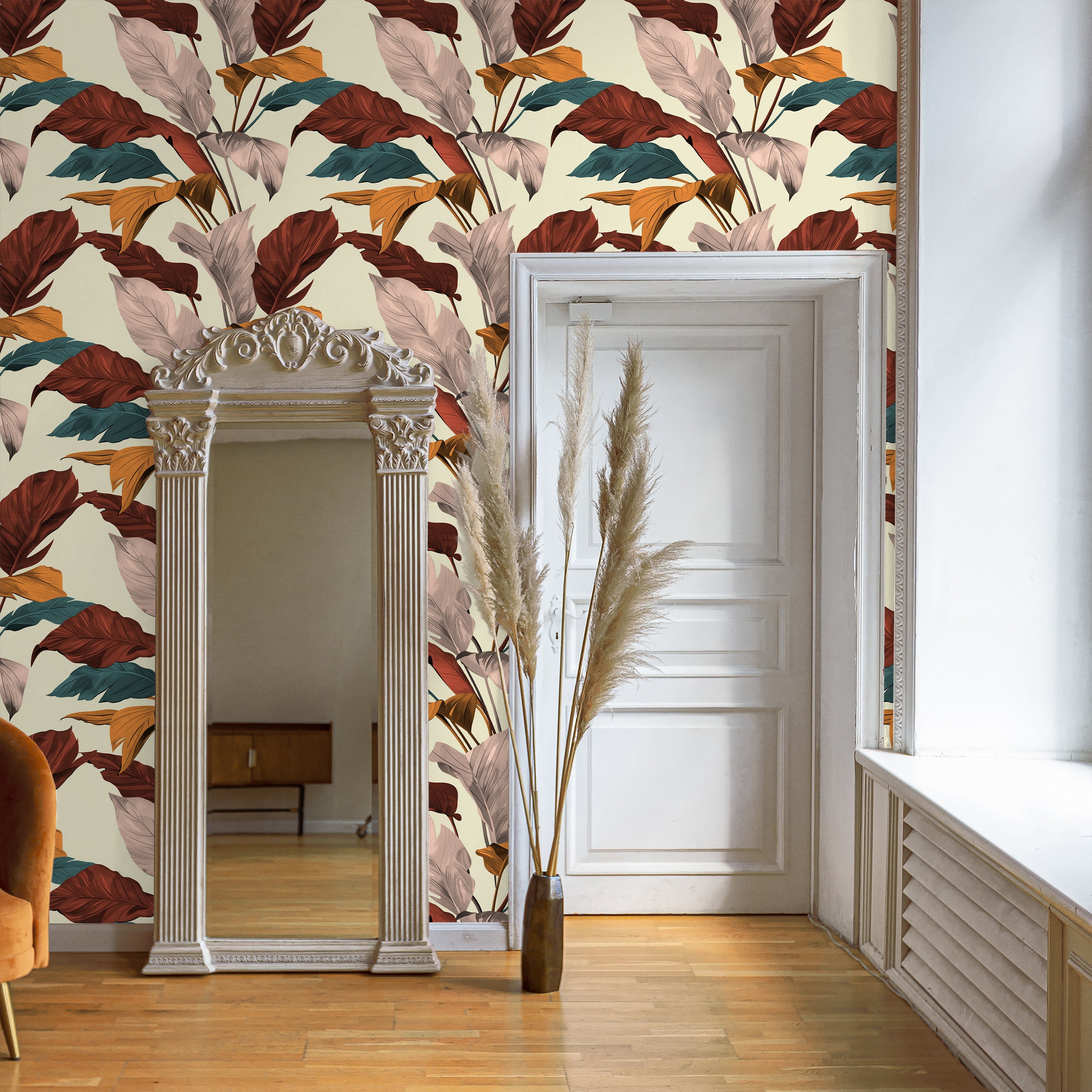 Tropical Elegance Wallpaper features vibrant, multicolored leaves dancing across a serene beige backdrop. This sophisticated design brings natural warmth and botanical charm to any room, perfect for creating an inviting atmosphere with understated luxury.