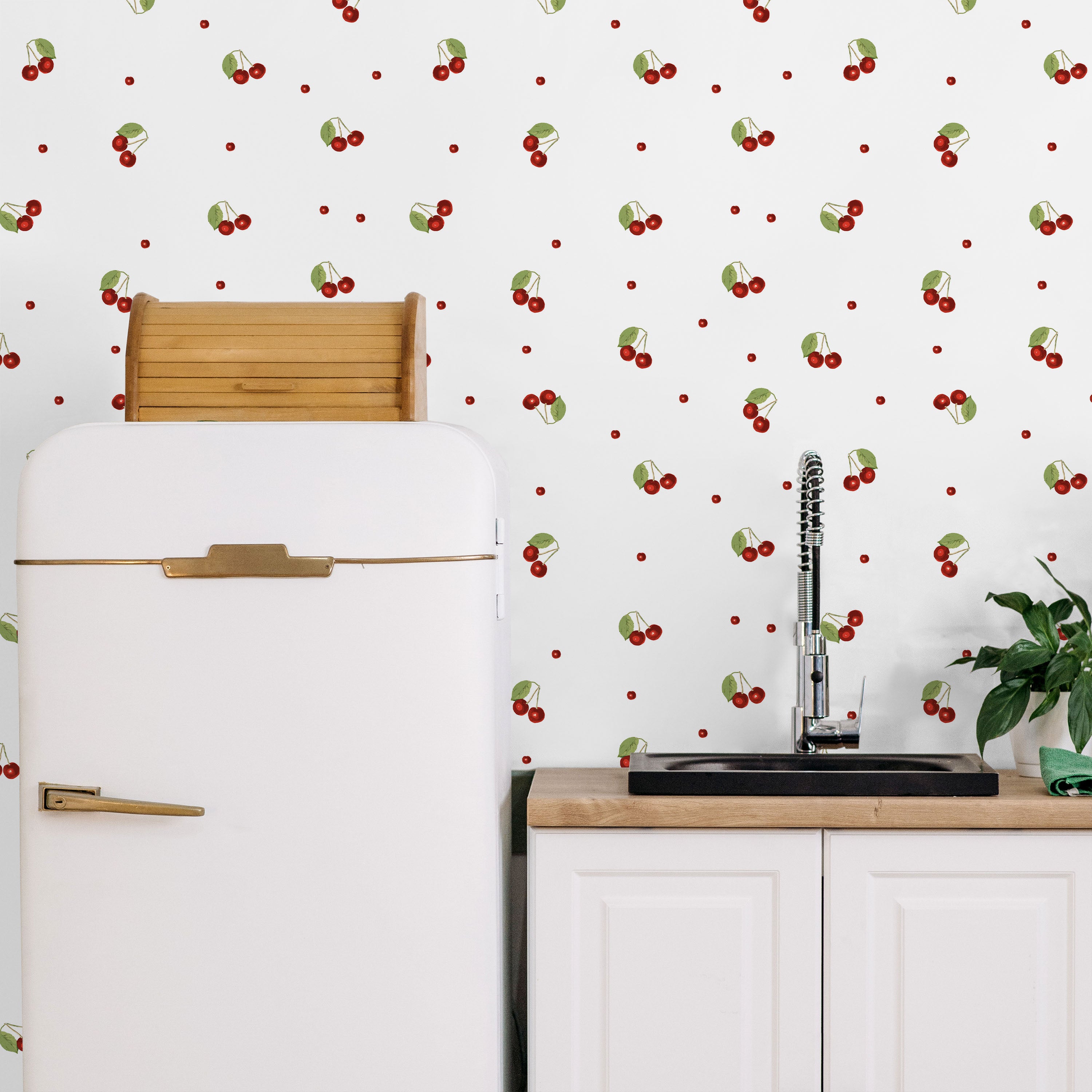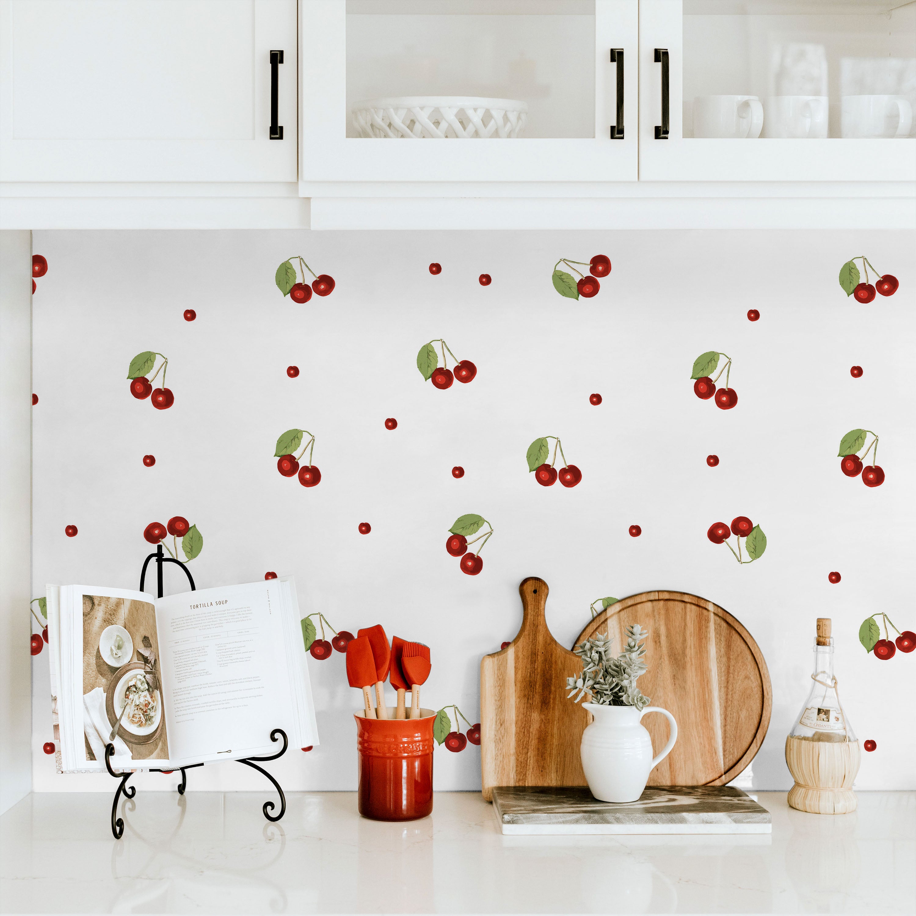 Vibrant red cherries with verdant foliage arranged across a pristine white canvas. This timeless pattern delivers visual interest while maintaining sophisticated restraint, ideal for kitchens, dining areas, or accent walls seeking understated elegance with botanical charm.