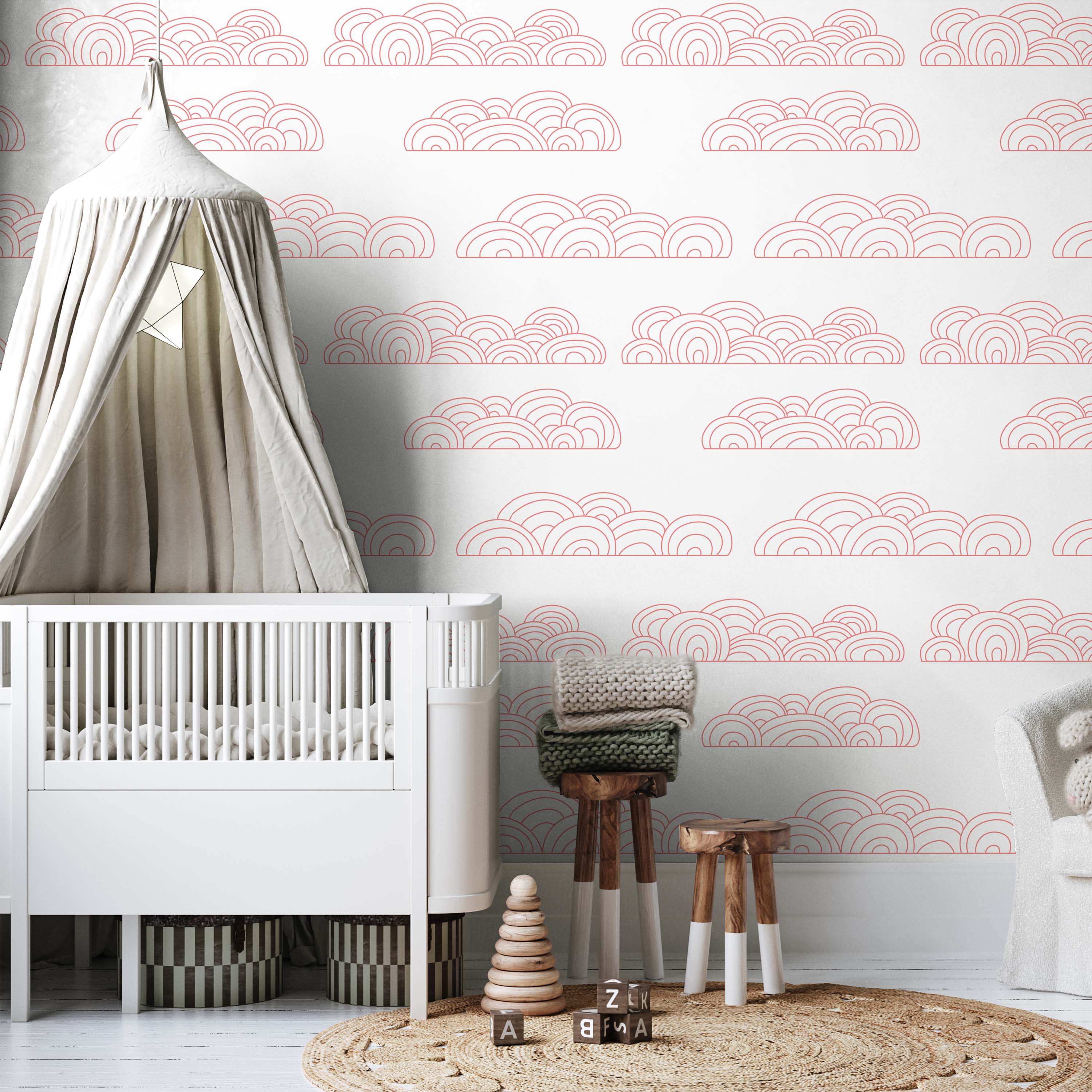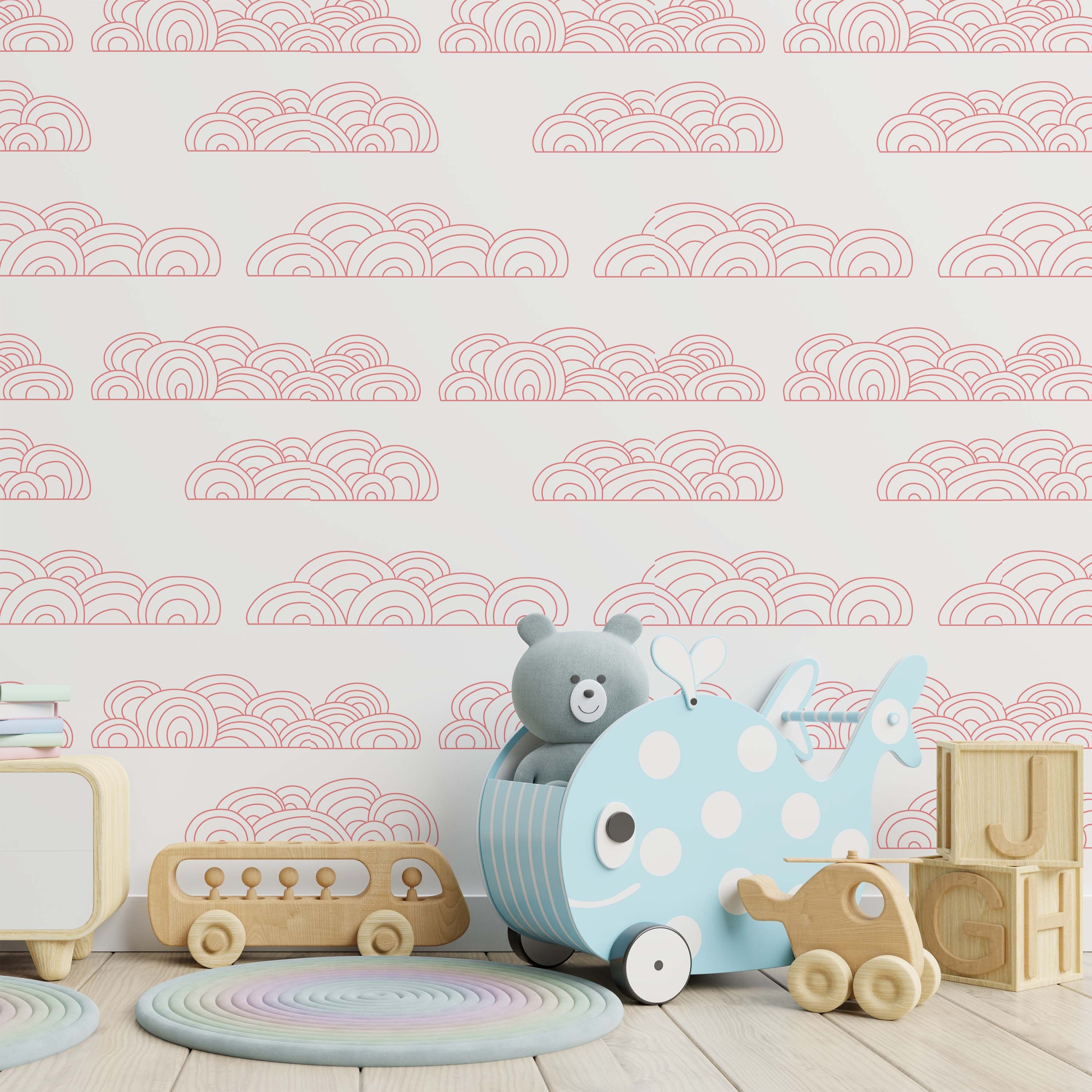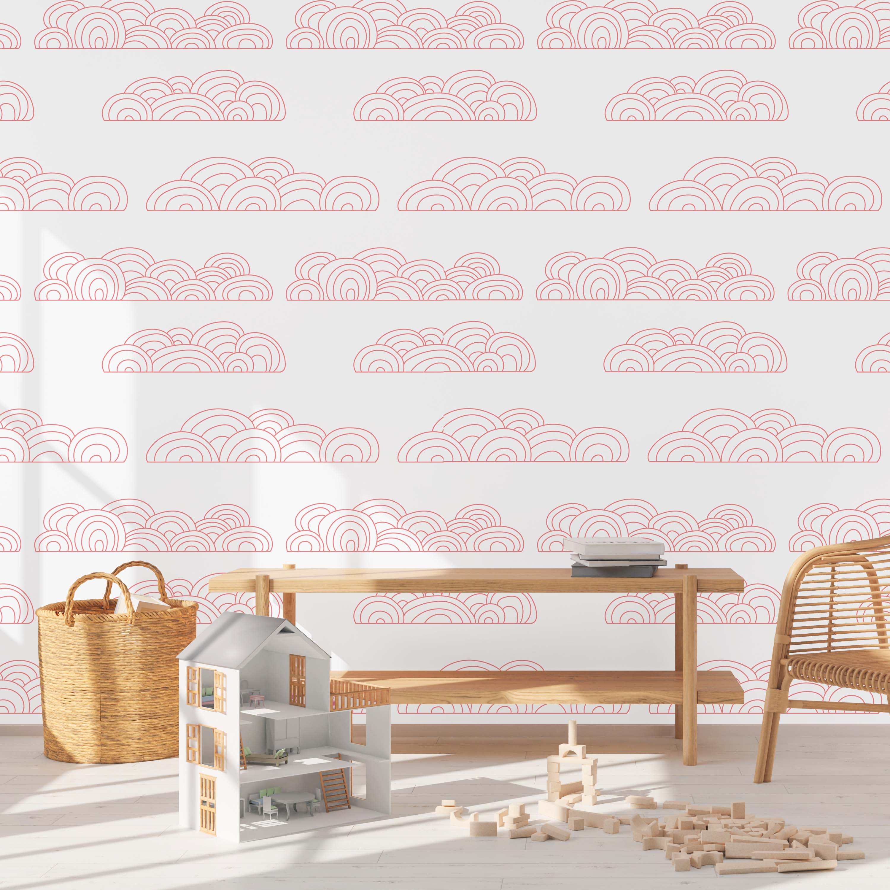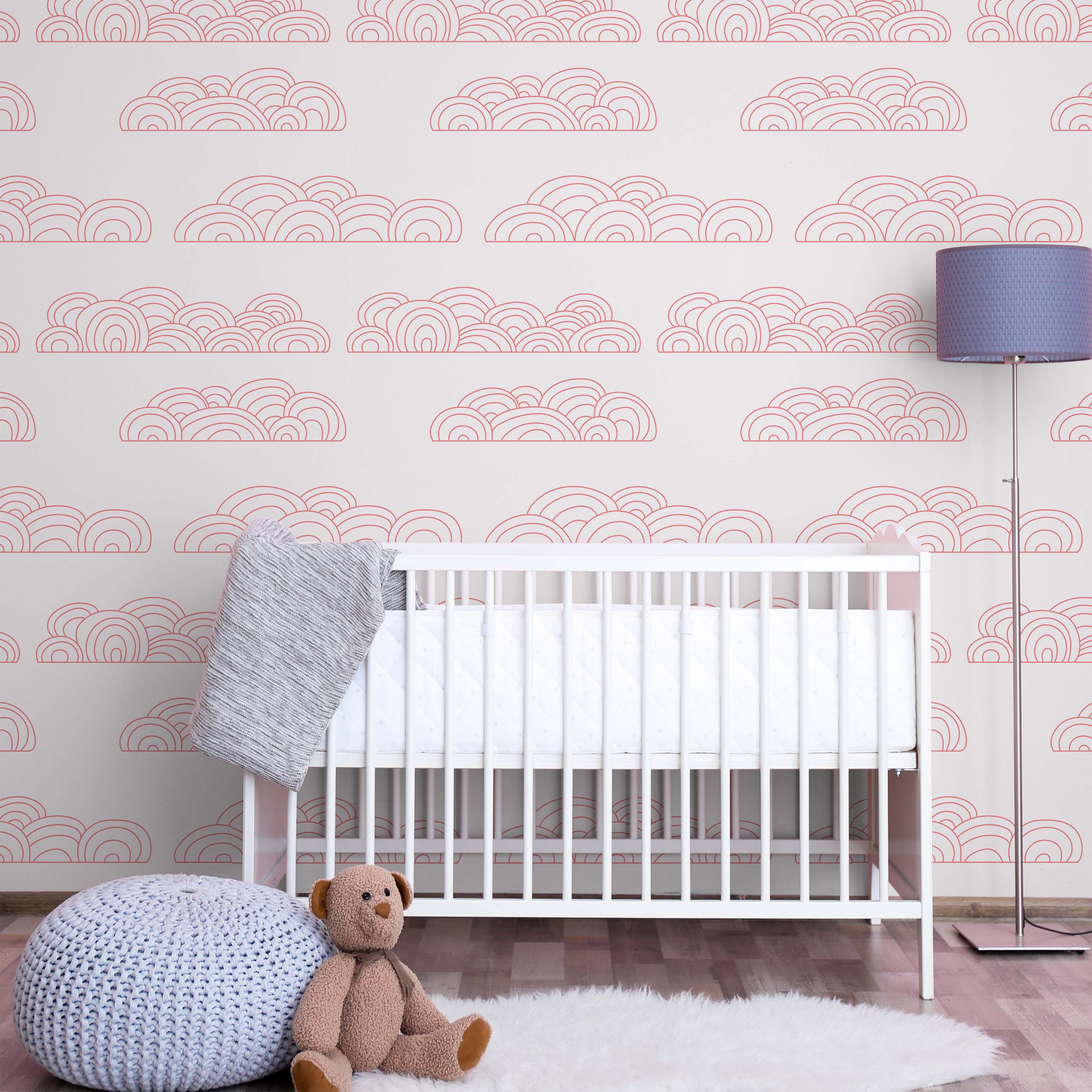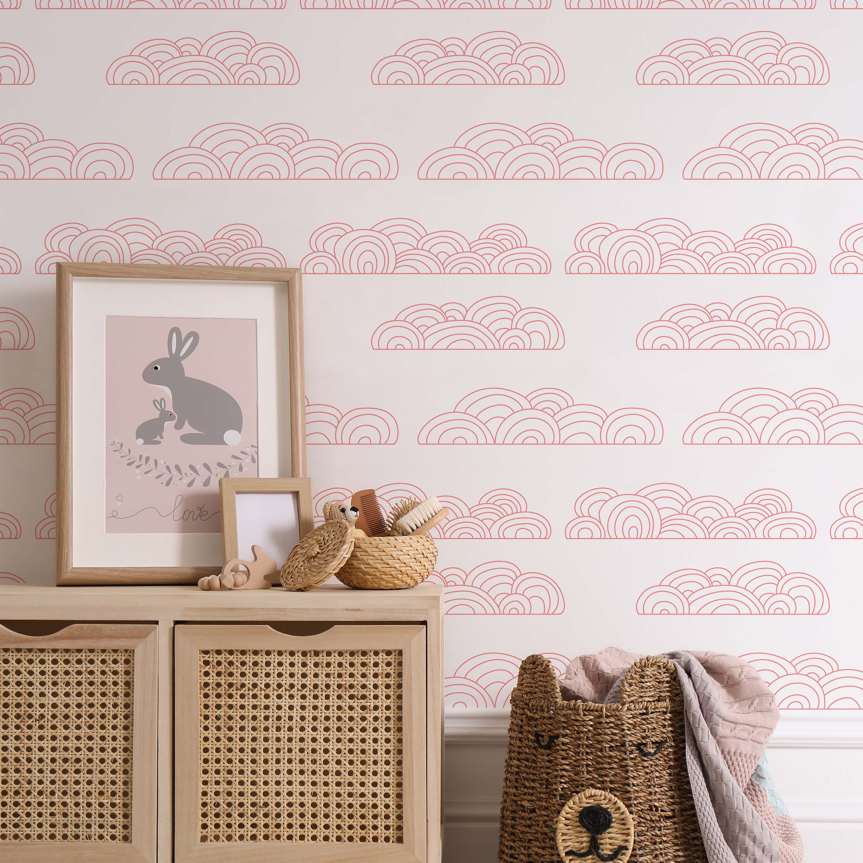Cloudy Wallpaper showcases delicate pink circular clouds on a pristine white backdrop. This refined pattern brings serene elegance to any room, offering a versatile design that complements modern and traditional interiors alike.