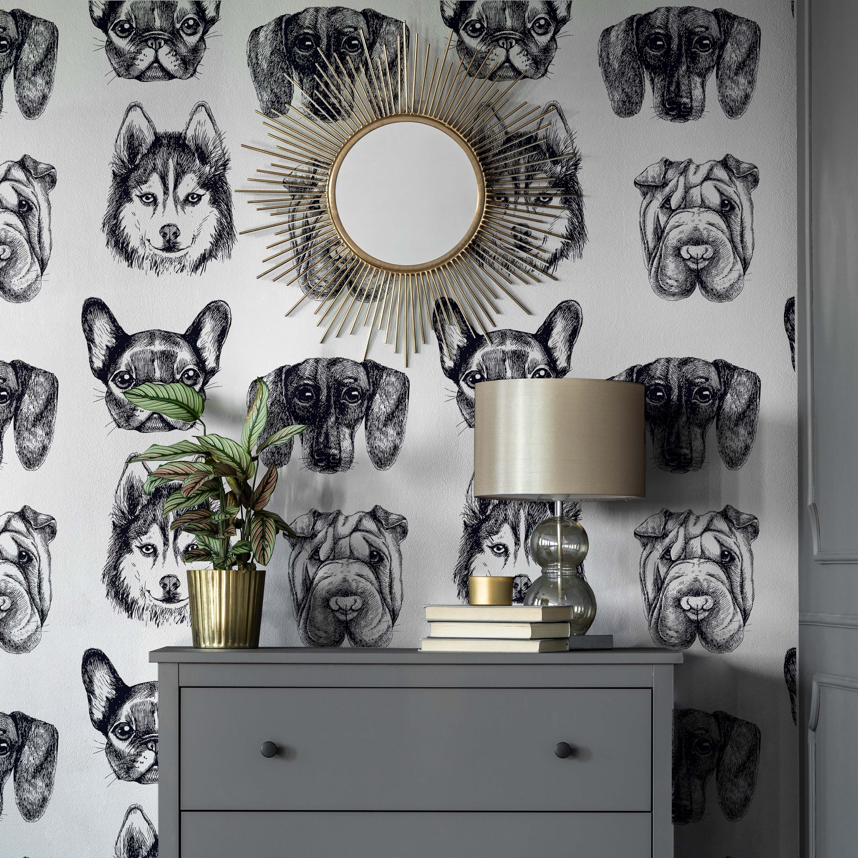 Distinguished wallpaper presenting a thoughtfully curated selection of grayscale dog illustrations positioned across a luminous white surface. This design delivers visual interest through artistic restraint, making it an ideal choice for creating gallery-quality interiors with enduring appeal.