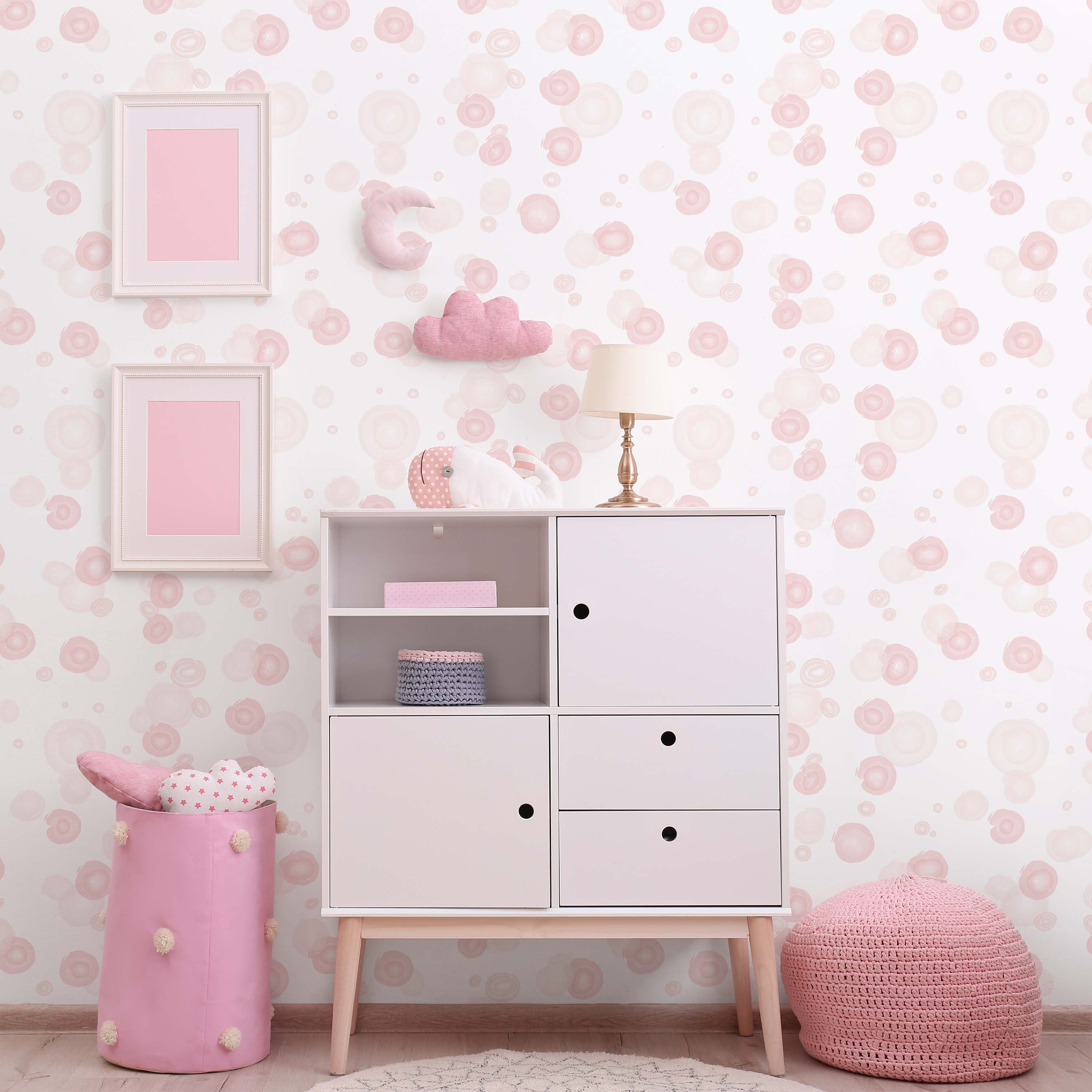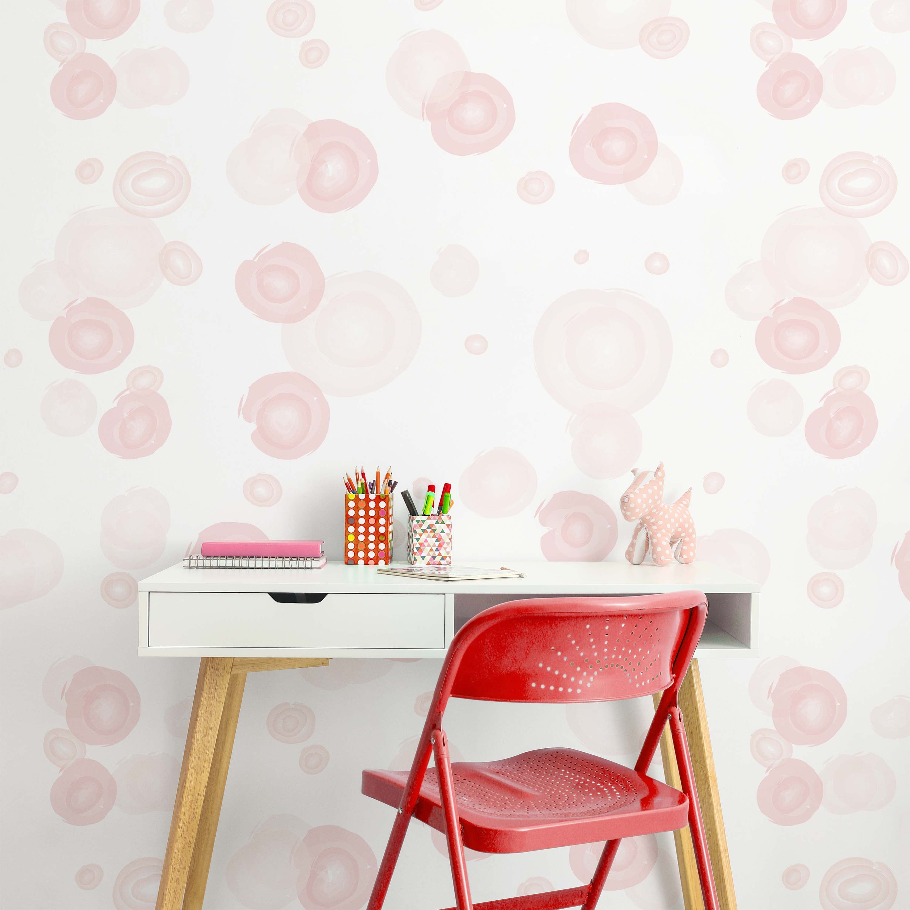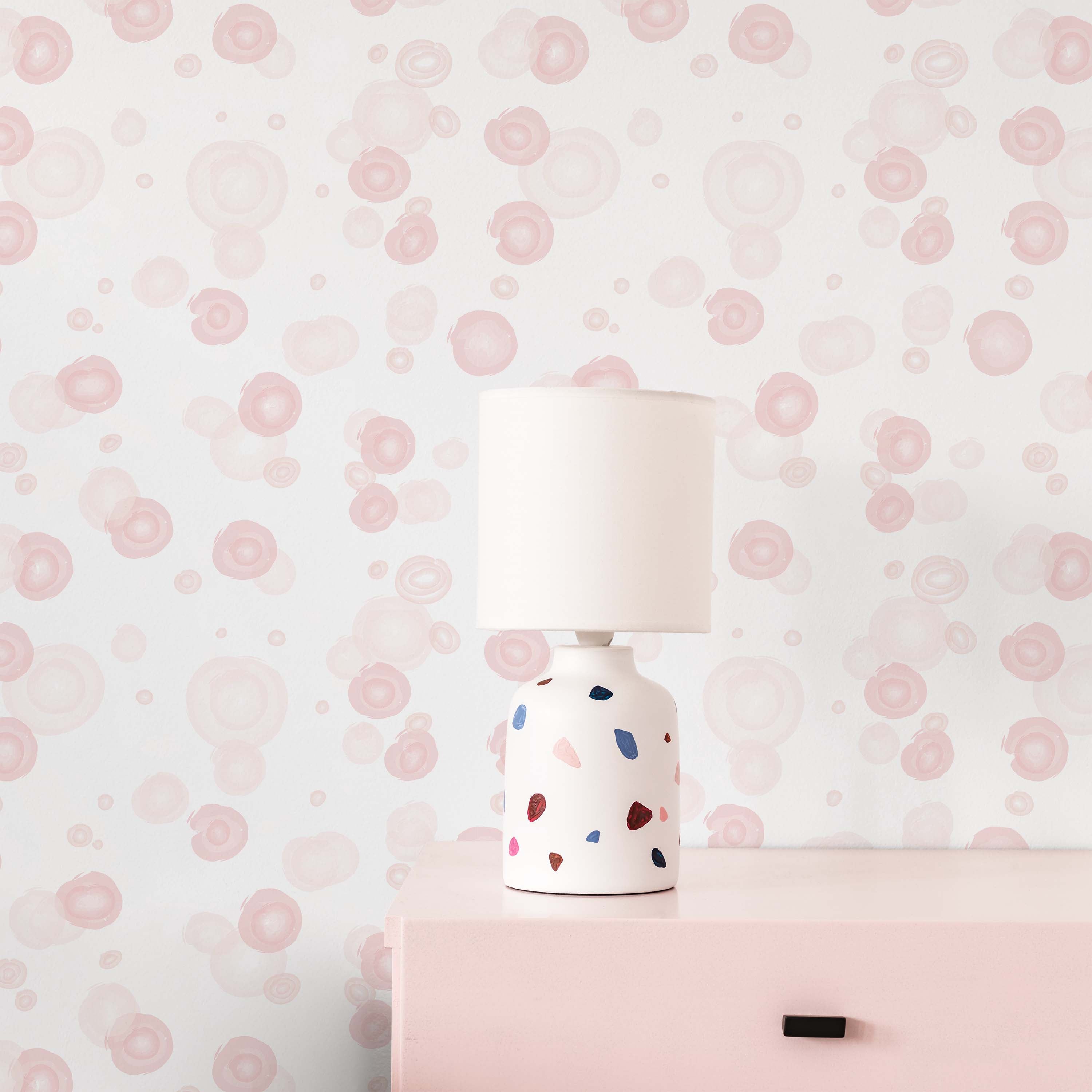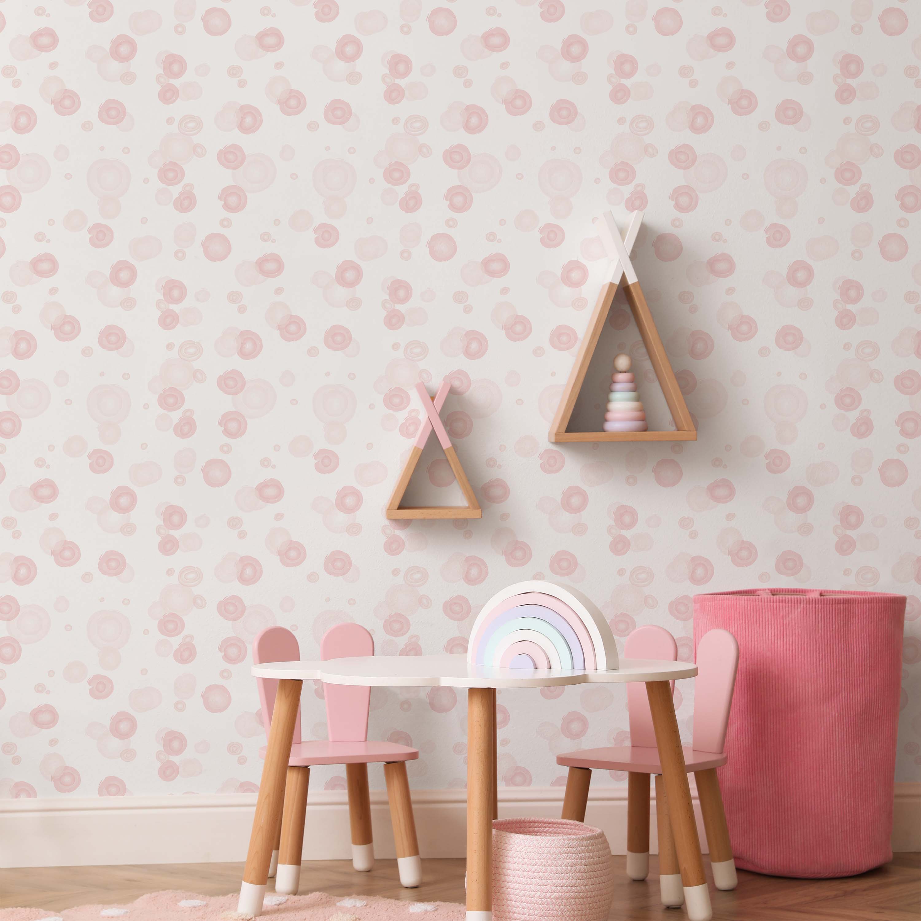 Geometric pink circles create visual rhythm against a soft pink backdrop. This contemporary wallpaper design brings subtle sophistication to any room, balancing modern aesthetics with calming tones. Perfect for creating a cohesive, refined interior.