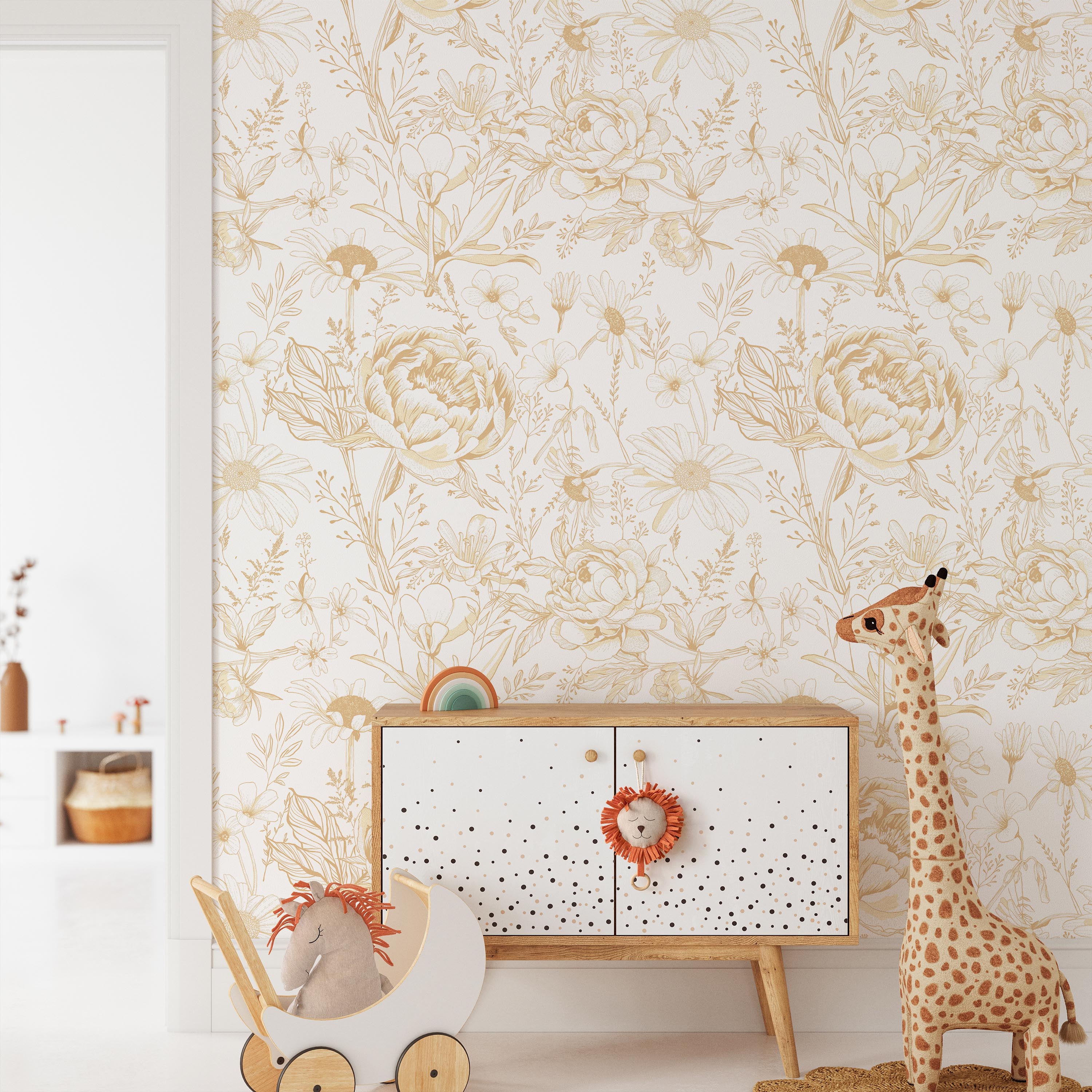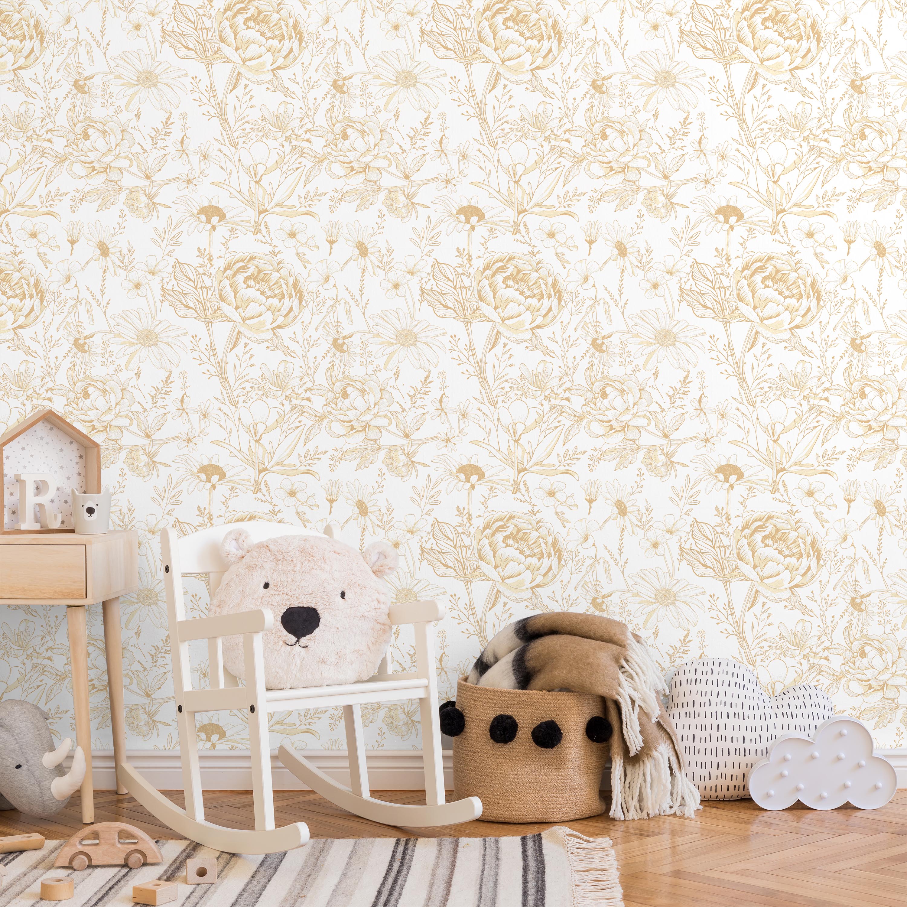 Sophisticated wallpaper featuring an elegant floral composition with luminous gold flowers set against a pristine white backdrop. This refined design brings botanical elegance and timeless charm to any interior space, creating a striking focal point with understated luxury.