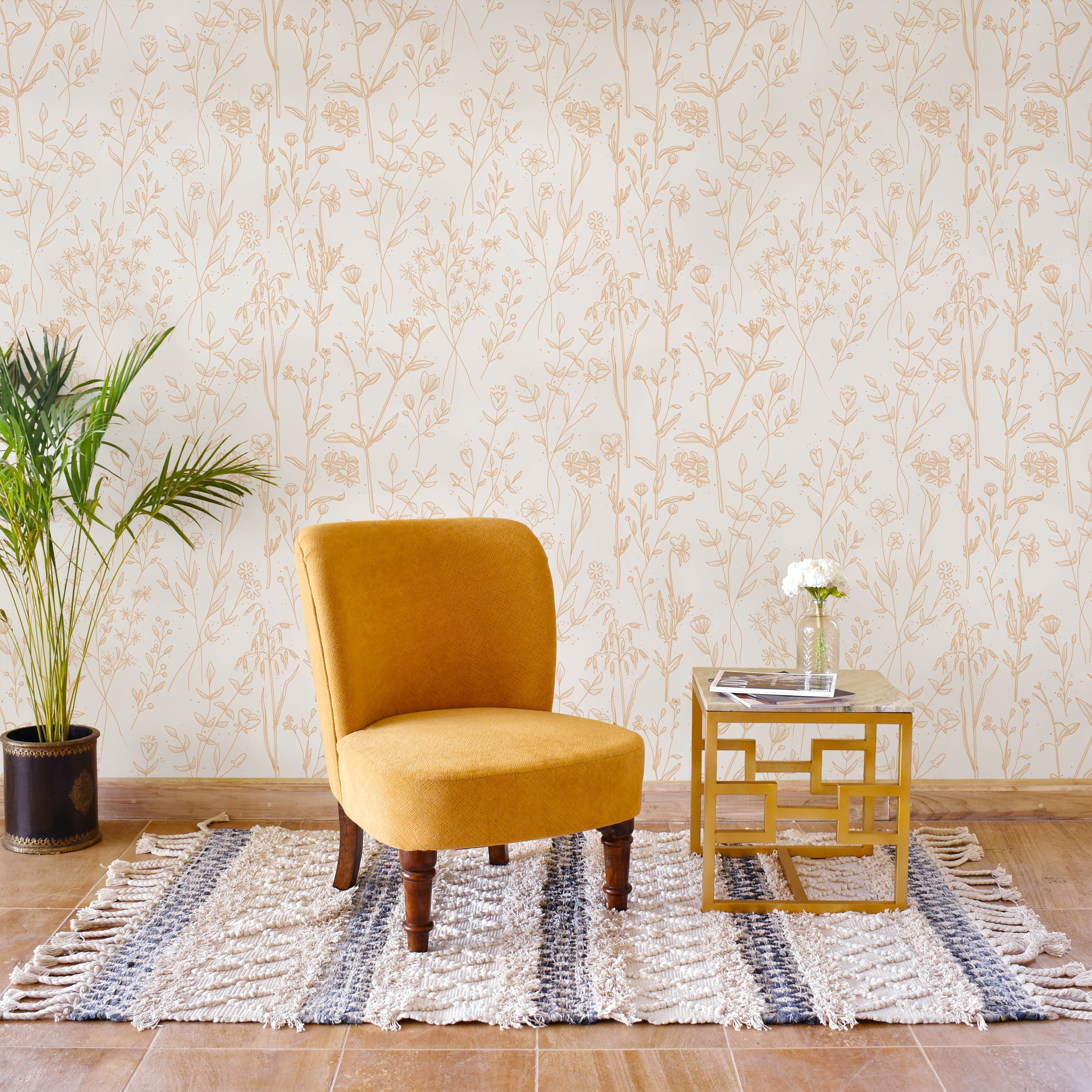 Delicate gold botanical motifs dance across pristine white in this sophisticated wallpaper. The refined linework captures the essence of summer florals with understated elegance, perfect for creating a serene, upscale aesthetic in any room.