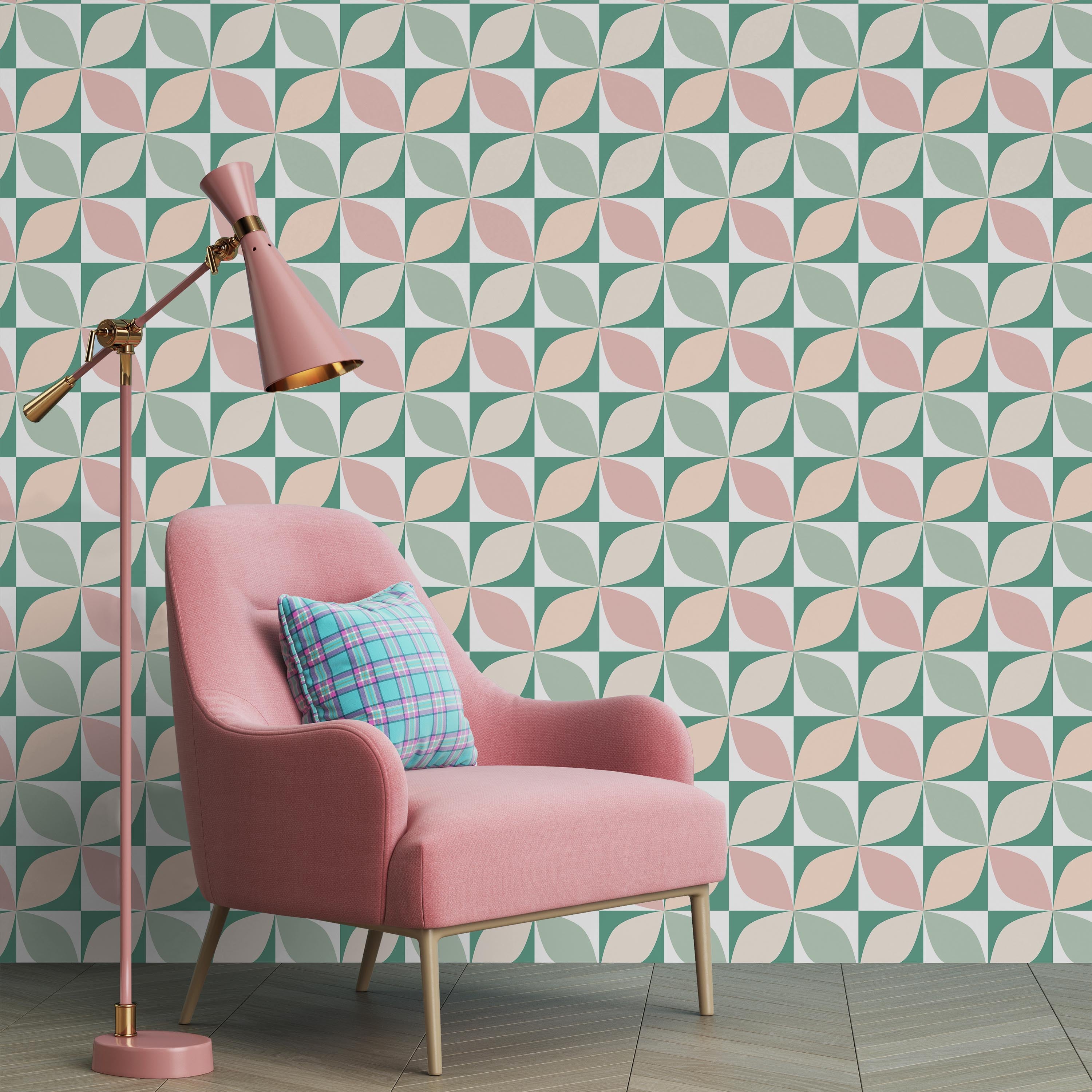 Geometric Bauhaus Wallpaper featuring leaf-shaped tiles in soft pastels arranged on a crisp green and white grid. This design merges modernist principles with organic forms, creating visual depth through layered color and structured composition. Perfect for contemporary interiors seeking sophisticated botanical influence.
