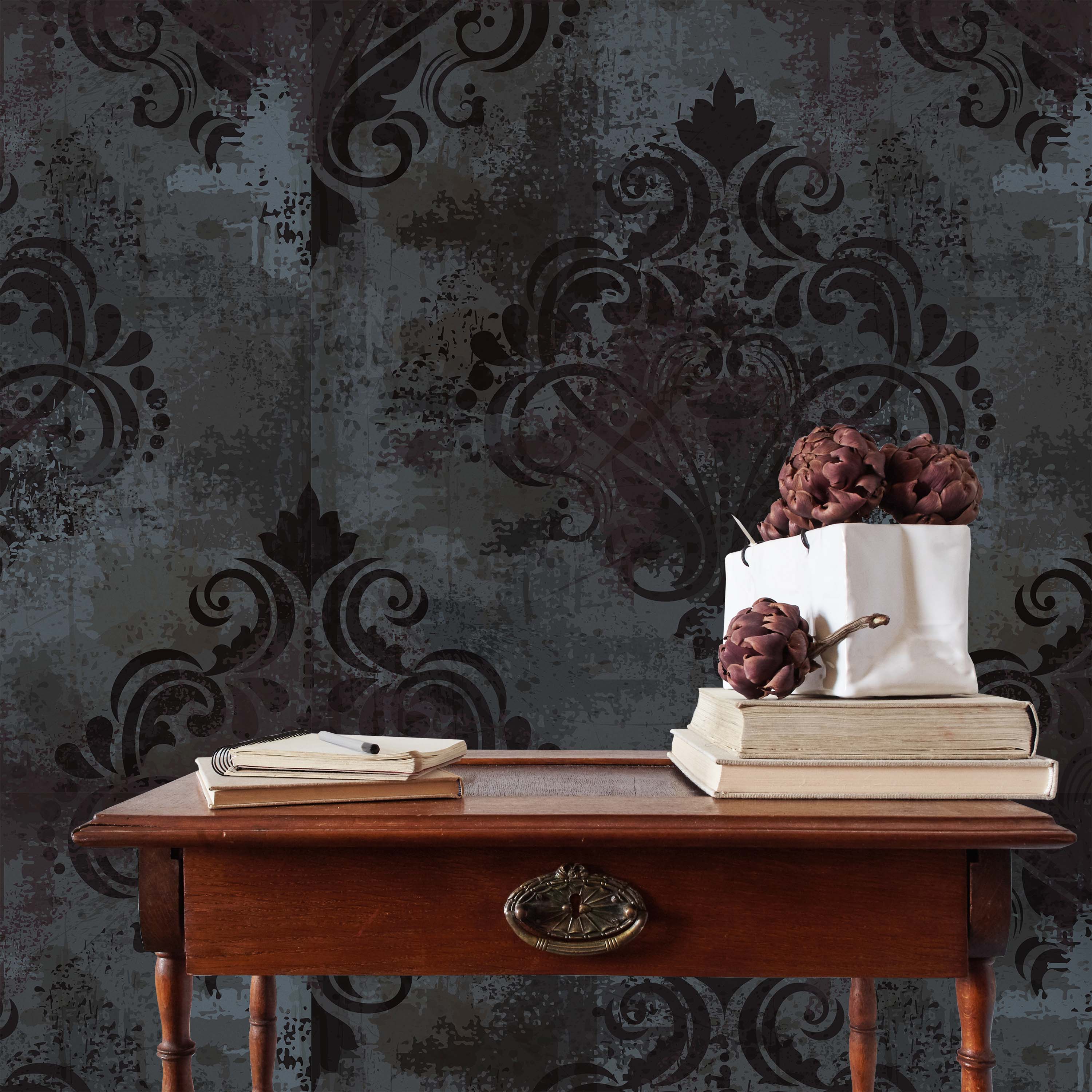 Sophisticated wallpaper featuring an intricate brown floral motif set against a textured gray backdrop. This refined design combines classic elegance with contemporary aesthetics, perfect for creating a luxurious focal point in any room while maintaining understated charm.