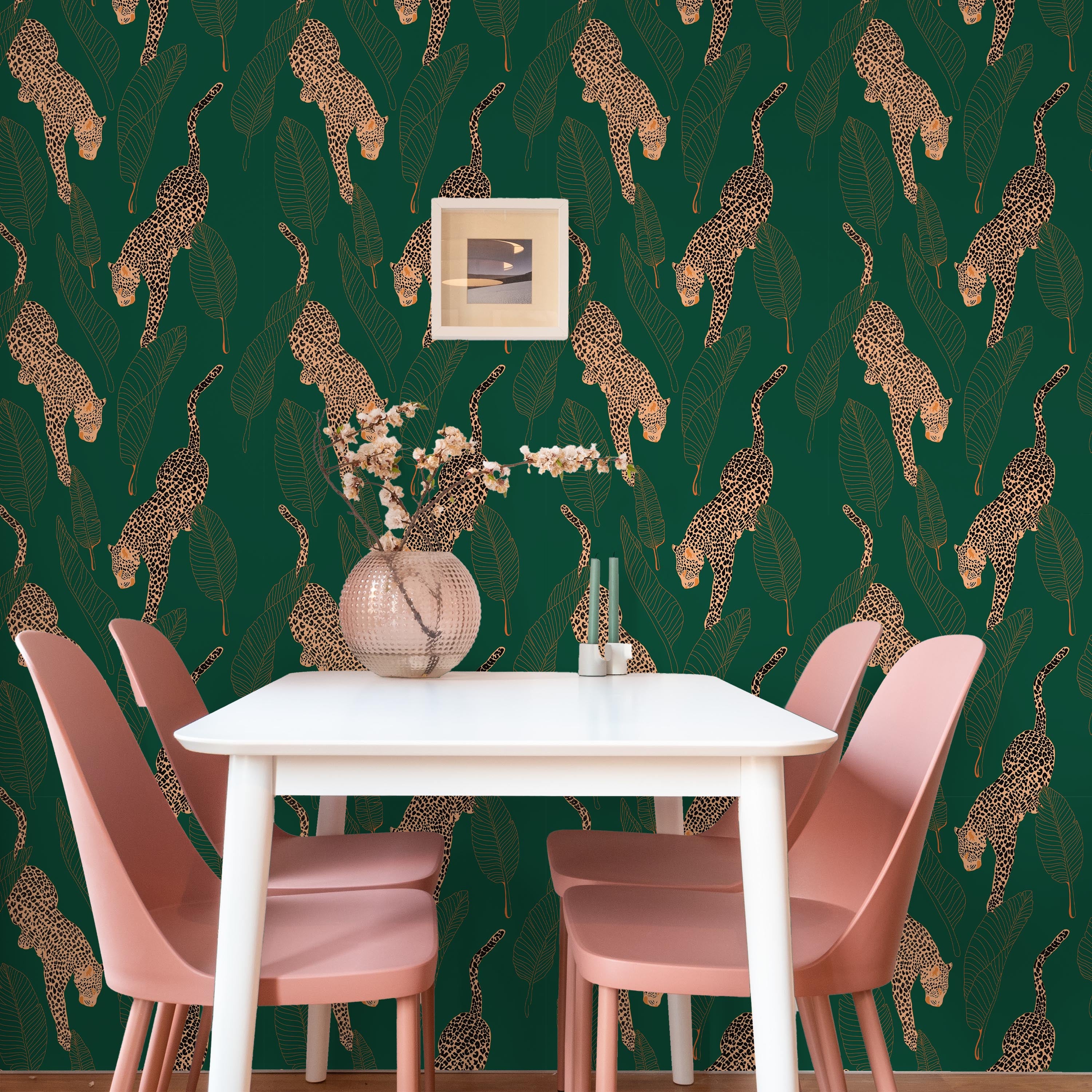 Striking wallpaper showcasing interlocking leopard spots and foliage against an emerald canvas. This design merges animal print sophistication with organic botanical elements, delivering refined visual interest and contemporary style to any room.